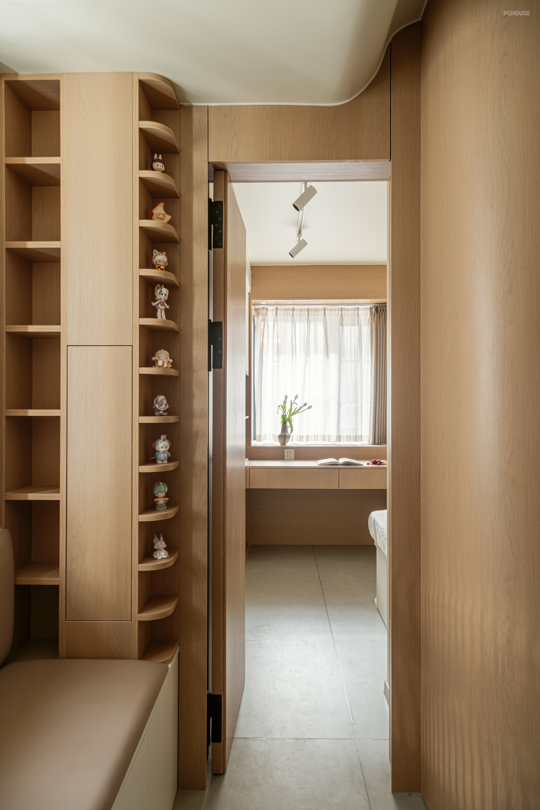小朋友的学习桌放在了光线比较好的位置,右侧墙面还配备了可调节方向的壁灯方便晚上学习,学习桌上的展示格同样用来展示小朋友喜欢的模型