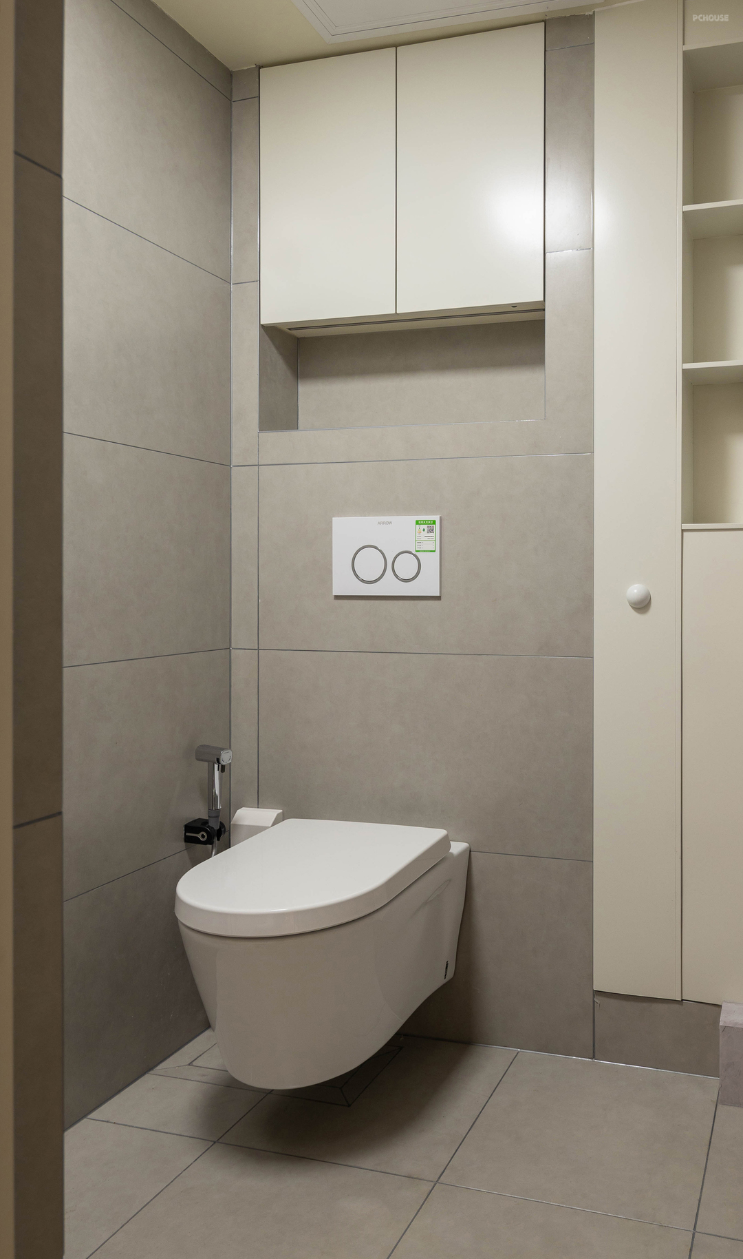 壁挂马桶方便日常清洁不留死角,矮墙上方做收纳柜放卫生用品,马桶旁增加水枪喷头,方便马桶的清洁!