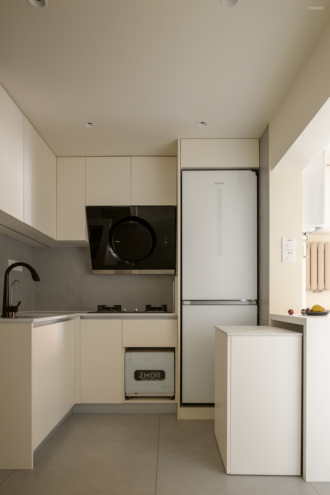 调换过来的厨房可以内嵌冰箱,与橱柜形成一个整体,L形的橱柜增加了厨房的收纳空间,为了增加操作空间,我们在岛台内部增加了可滑动操作台,操作台底部有滑轮方便进出