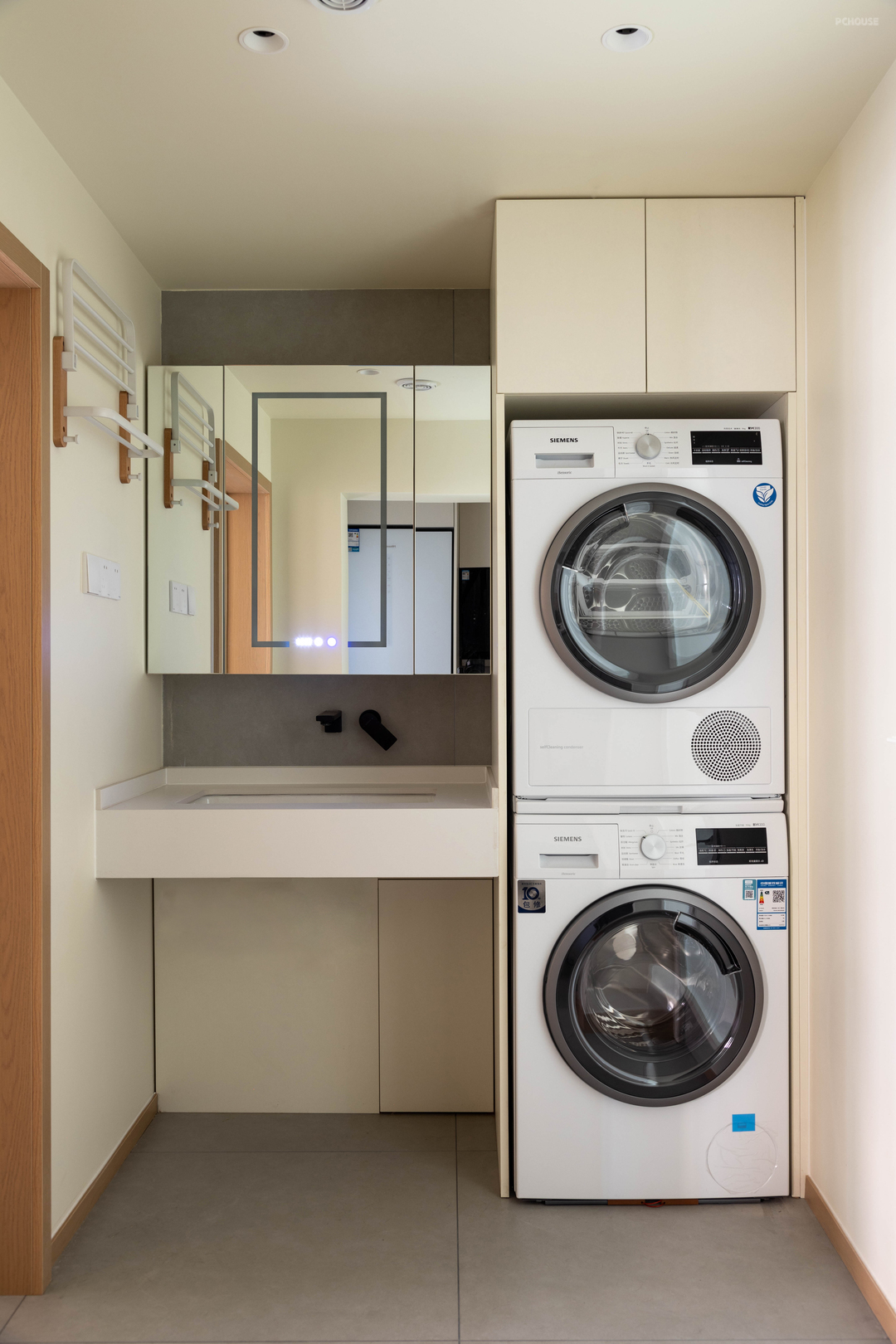 把洗手池移出来做干湿分离,增加卫生间的利用率,小户型缺少晾嗮空间,用内嵌加储物的柜体增加洗烘机解决晾嗮