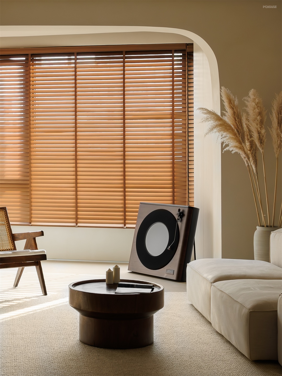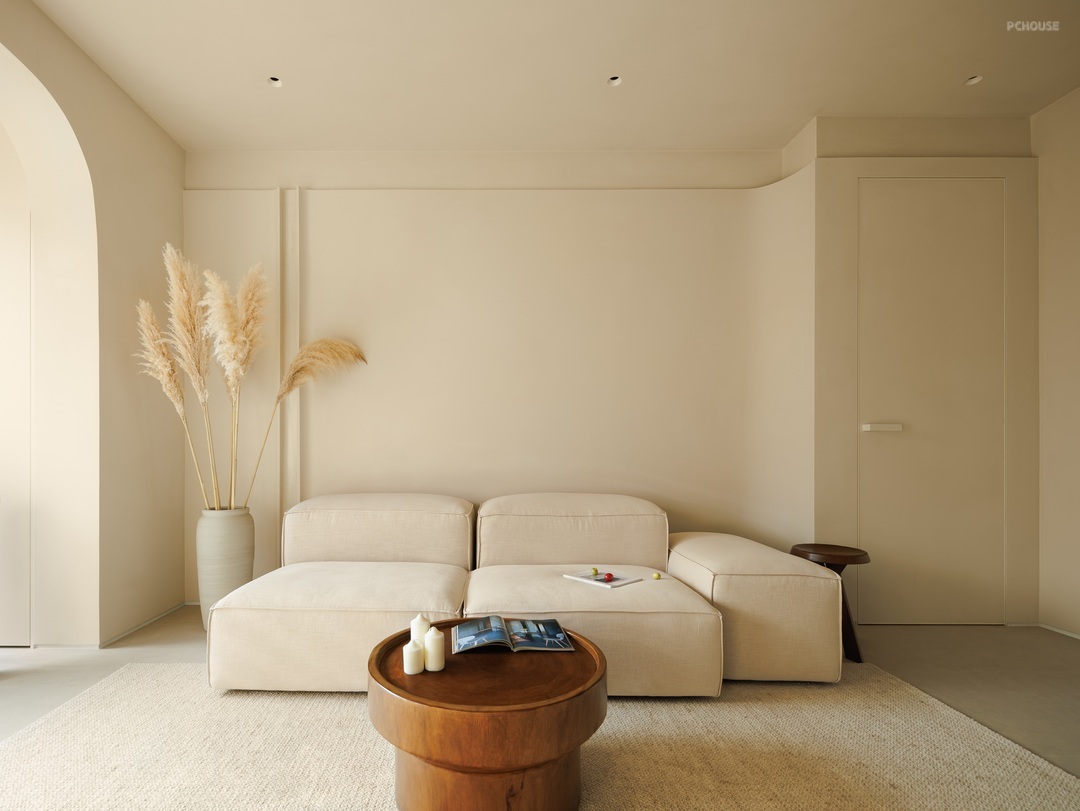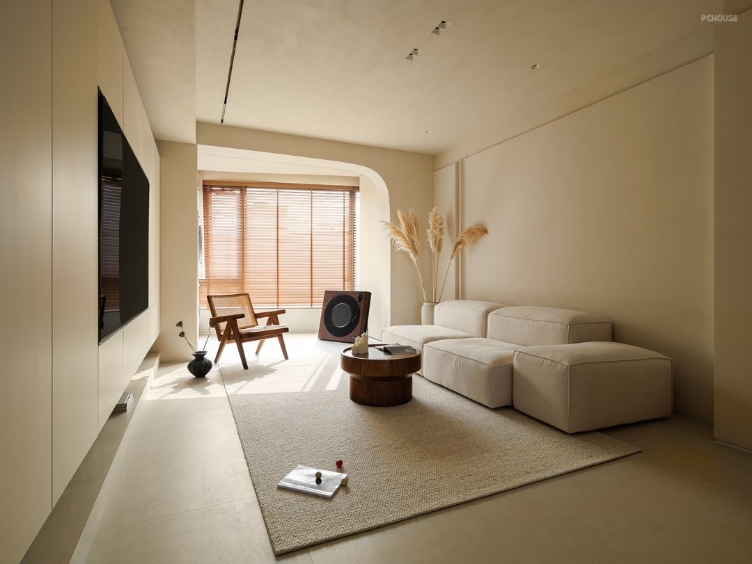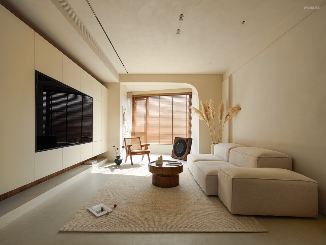 客厅以柔和的米色调铺陈,营造出温润舒缓的氛围。一体化定制柜体简洁大气,与空间相融,隐藏收纳功能。弧形门洞增添空间层次,阳光透过百叶窗,洒下错落光影。浅米色沙发搭配木质小圆几,点缀几支芦苇,自然惬意,每一处细节都传递着松弛的居住哲学。