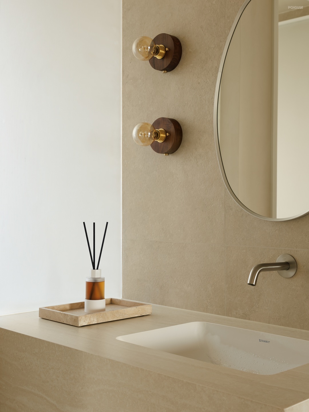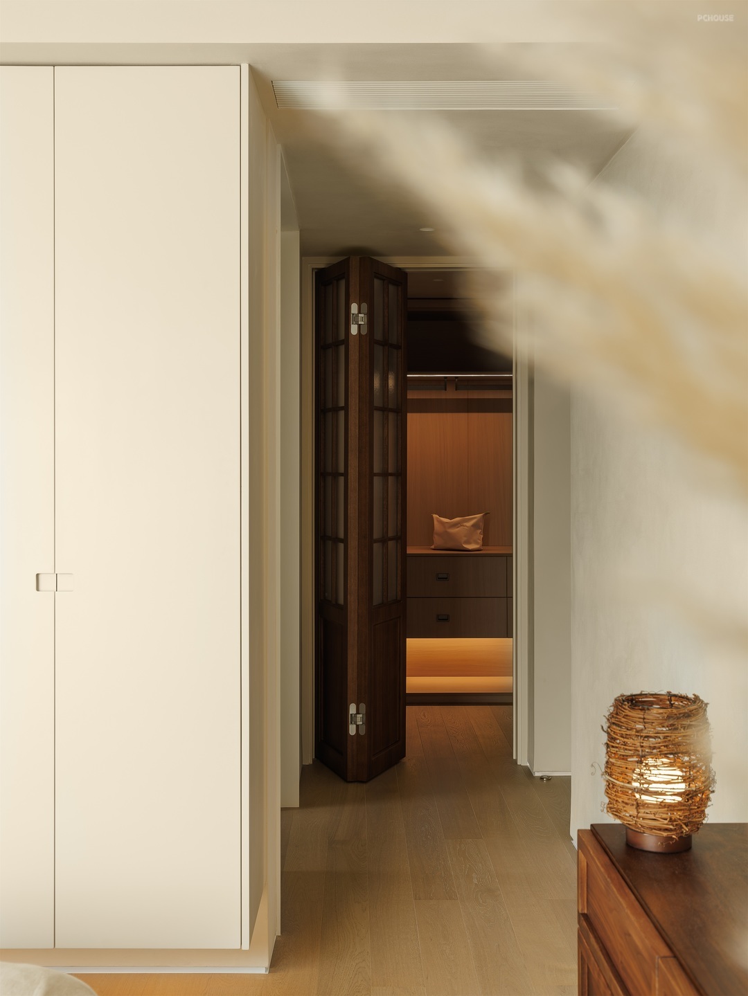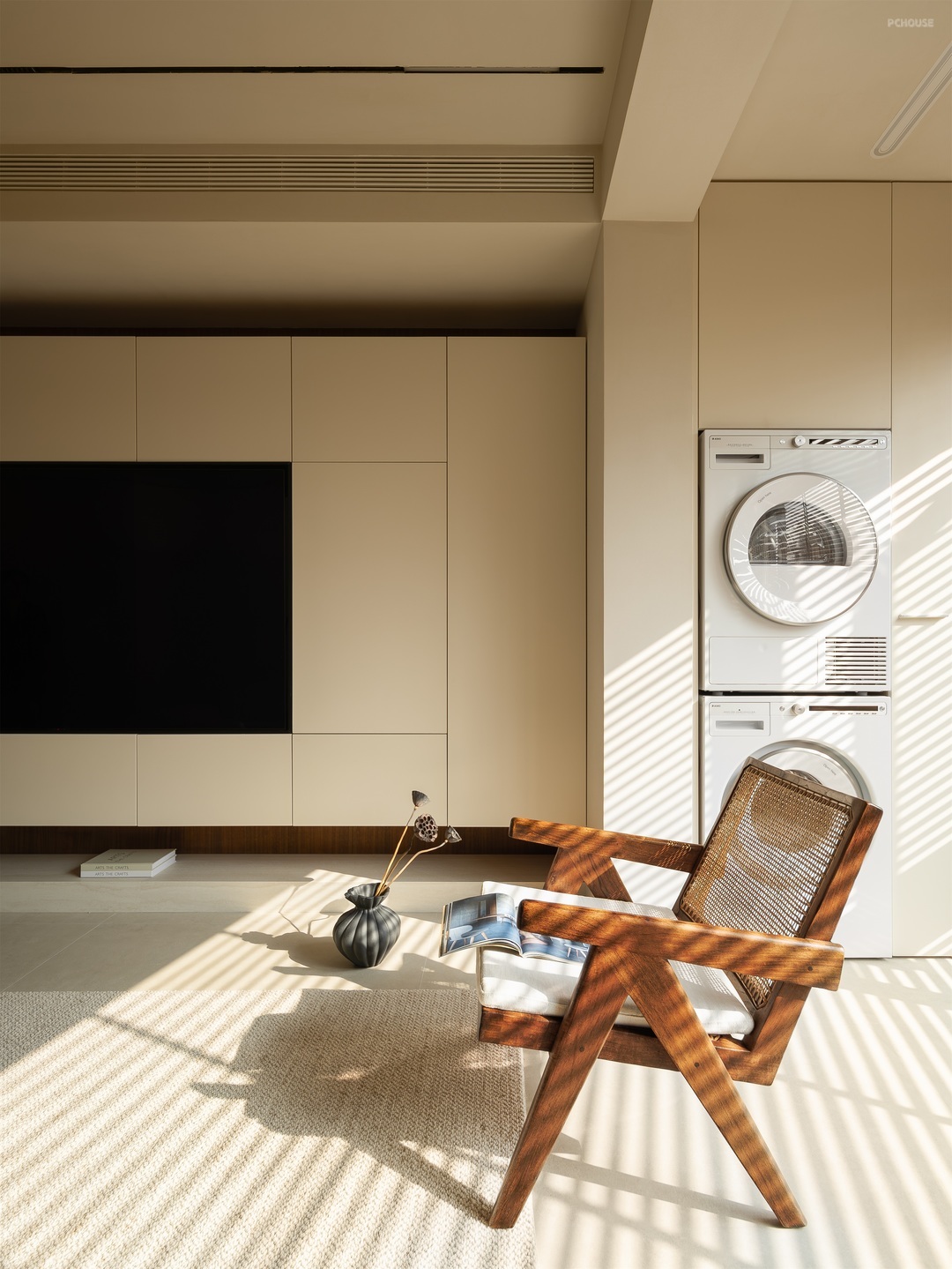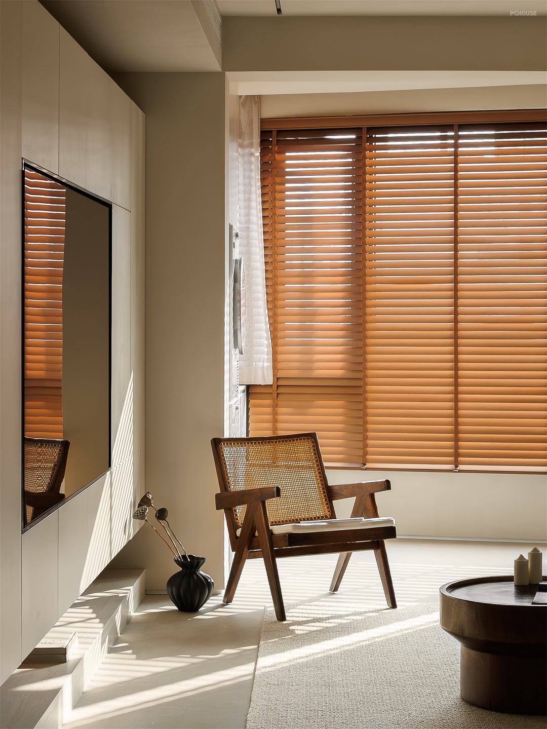 客厅以柔和的米色调铺陈,营造出温润舒缓的氛围。一体化定制柜体简洁大气,与空间相融,隐藏收纳功能。弧形门洞增添空间层次,阳光透过百叶窗,洒下错落光影。浅米色沙发搭配木质小圆几,点缀几支芦苇,自然惬意,每一处细节都传递着松弛的居住哲学。