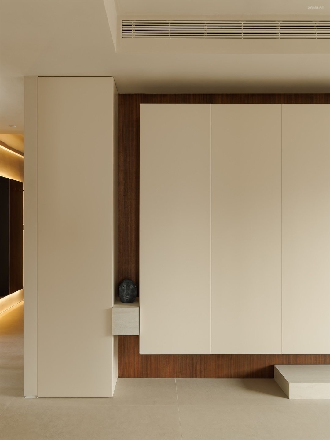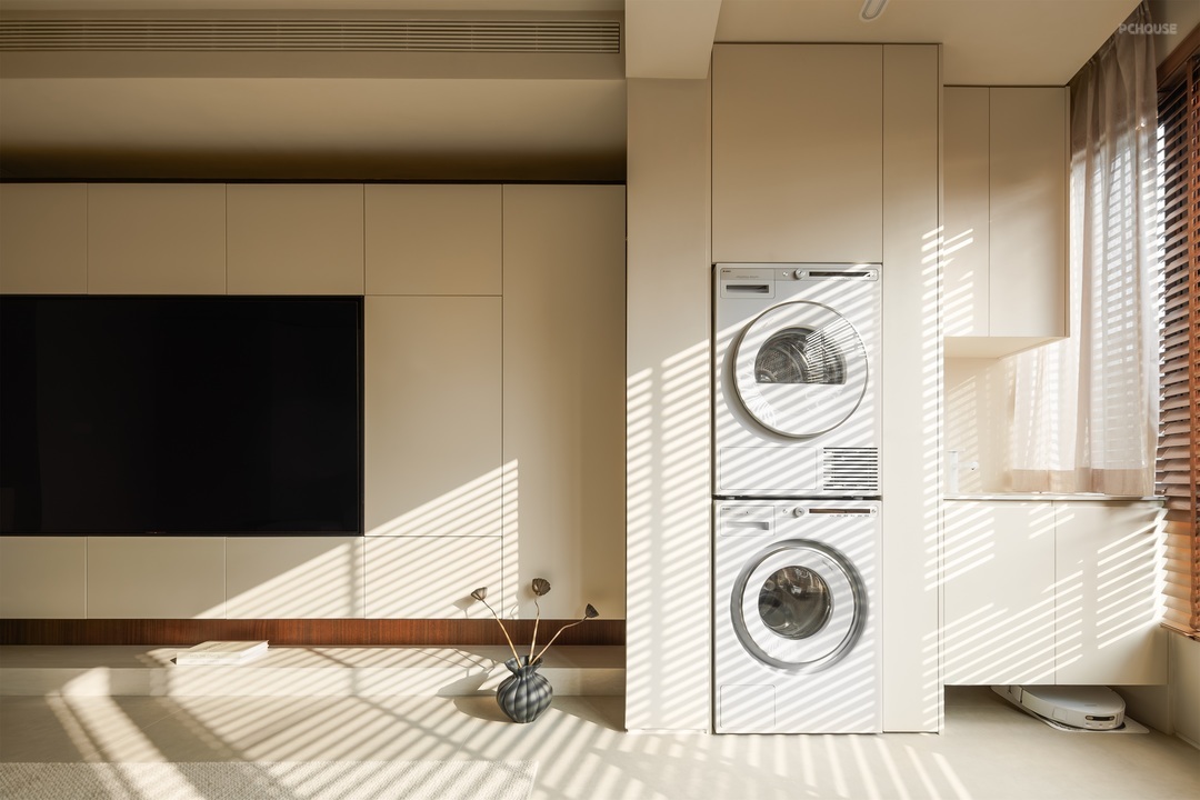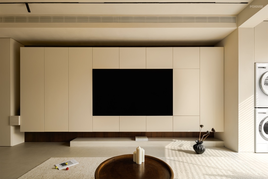 一体化定制柜体简洁利落,与空间自然相融,嵌入木质收纳区,增添温润质感。