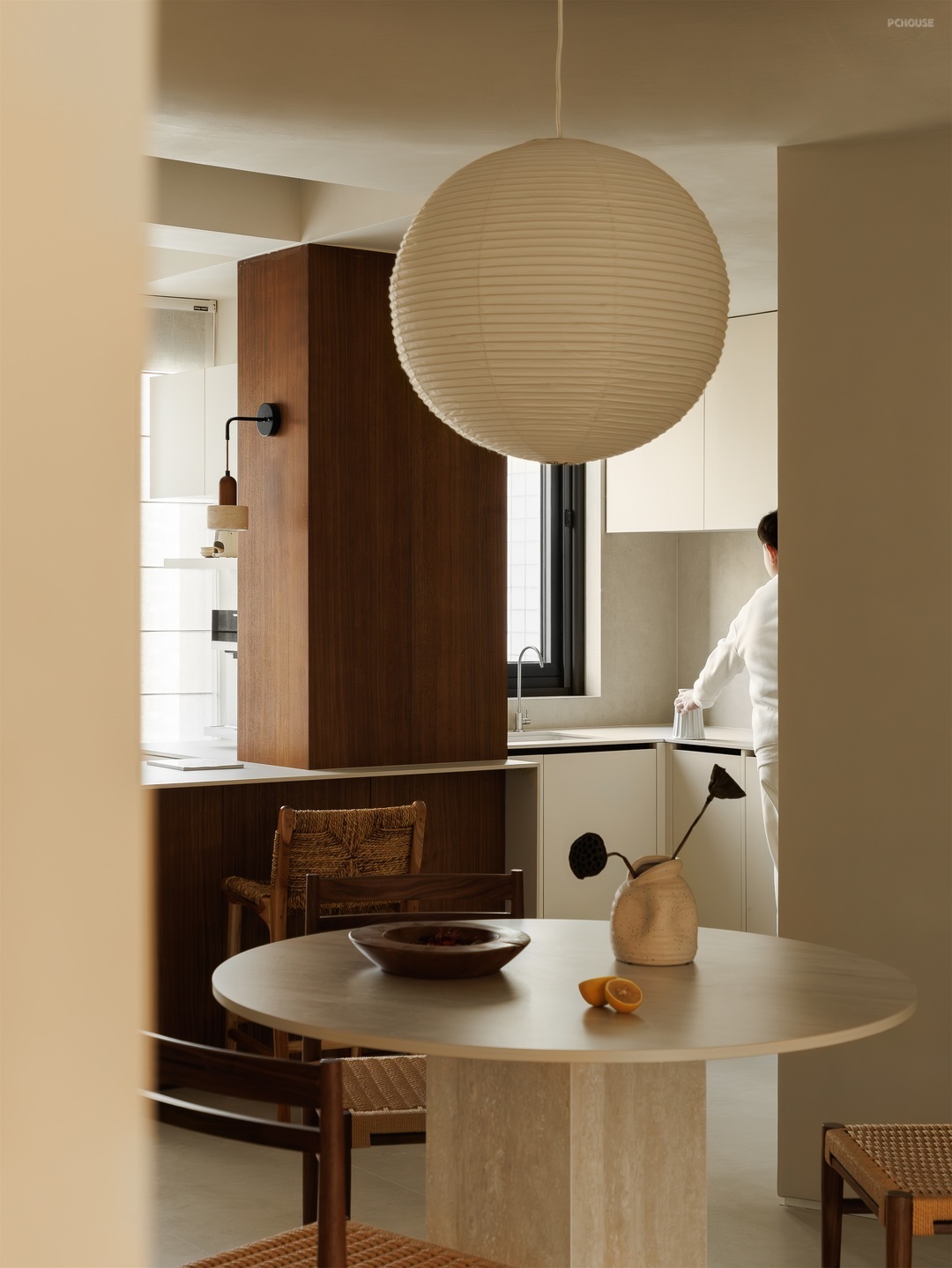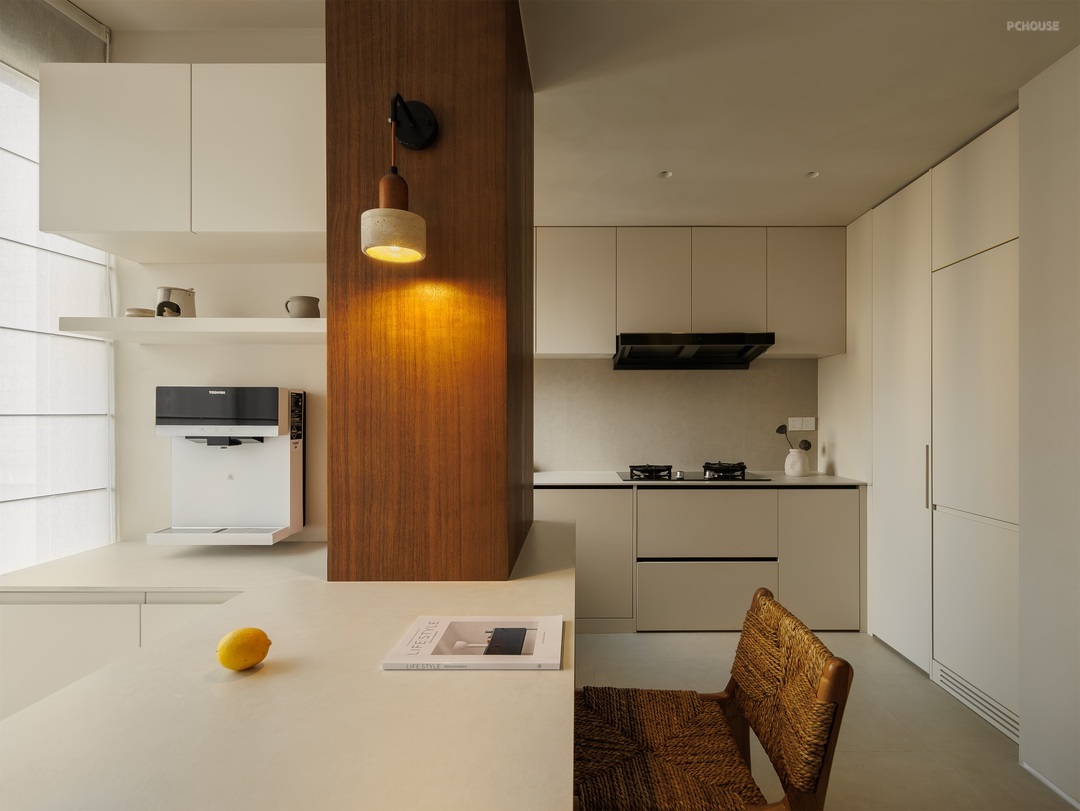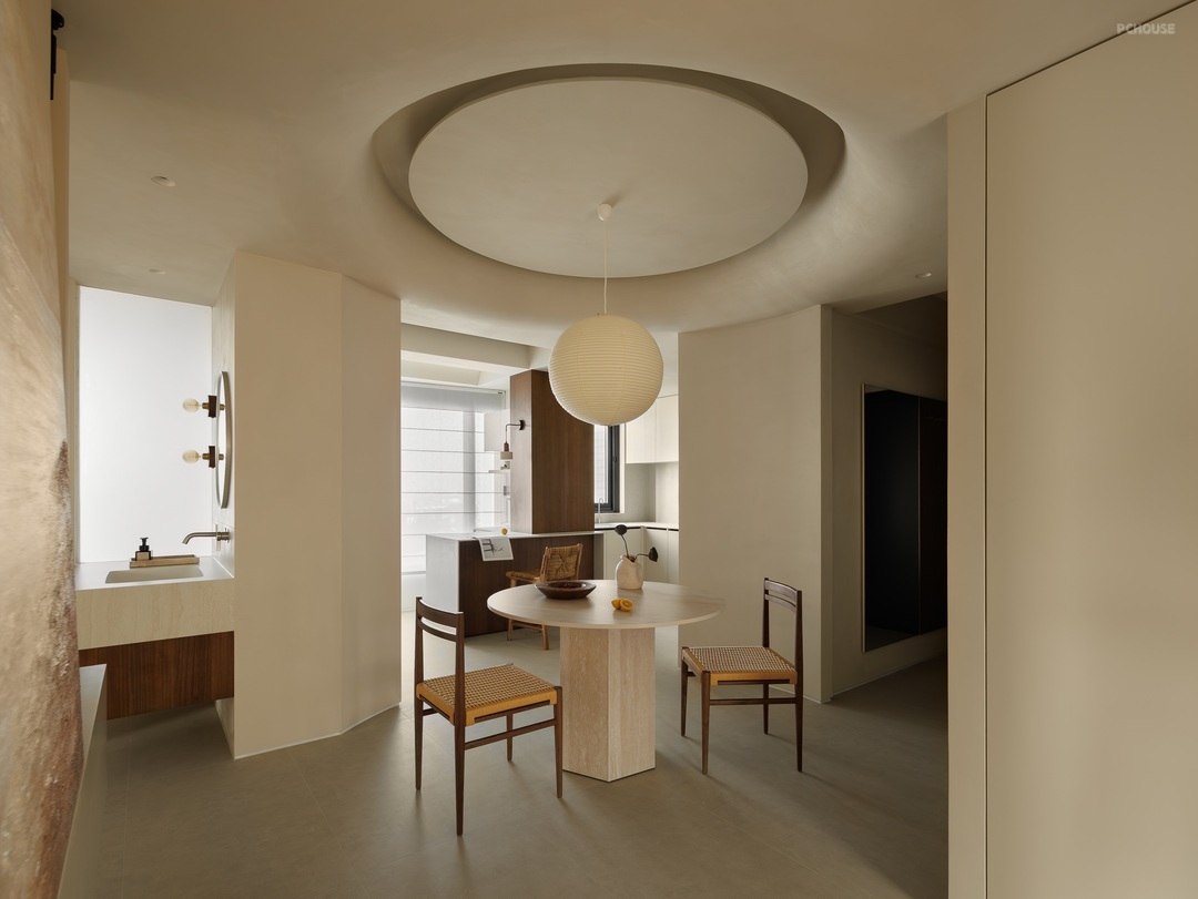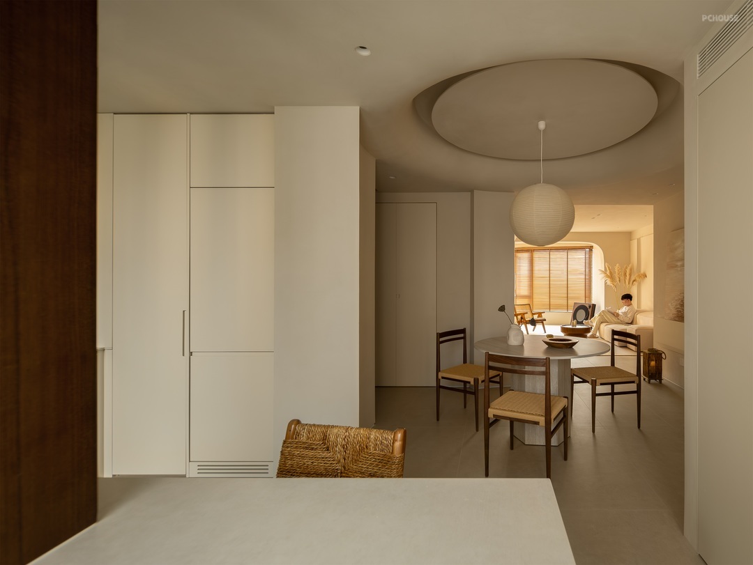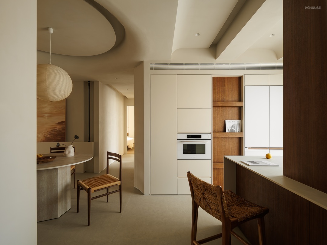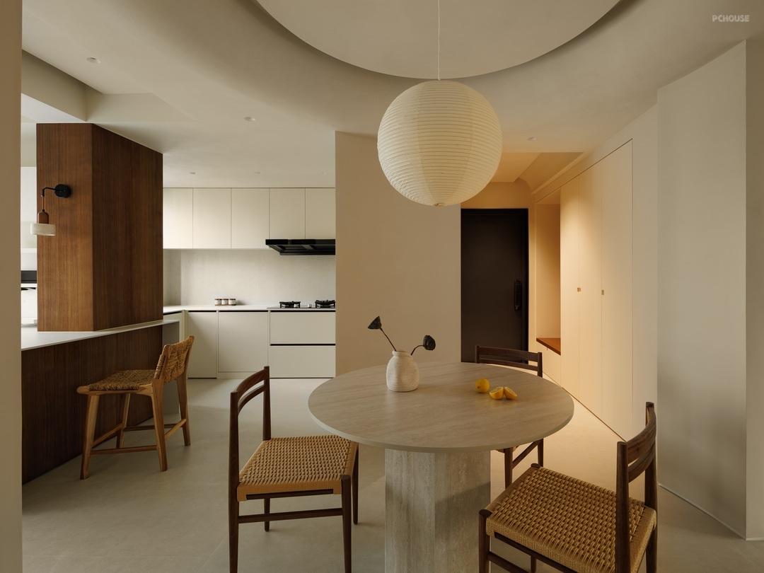 餐厨空间以柔和米调为底,勾勒温润烟火场域。圆形纸灯悬于餐桌,洒下朦胧光晕,编织藤椅、质朴圆桌,呼应原木柜体的自然质感。