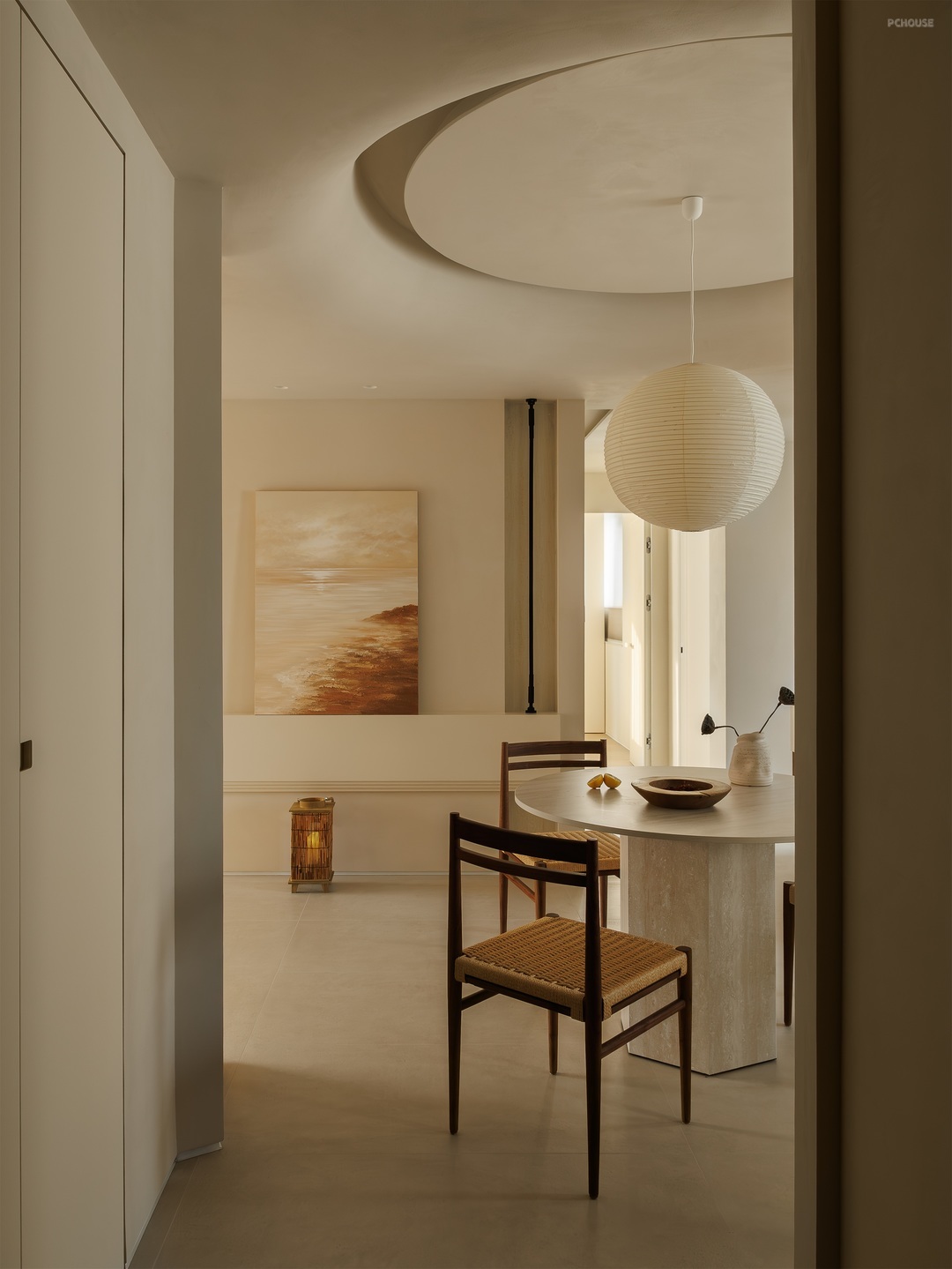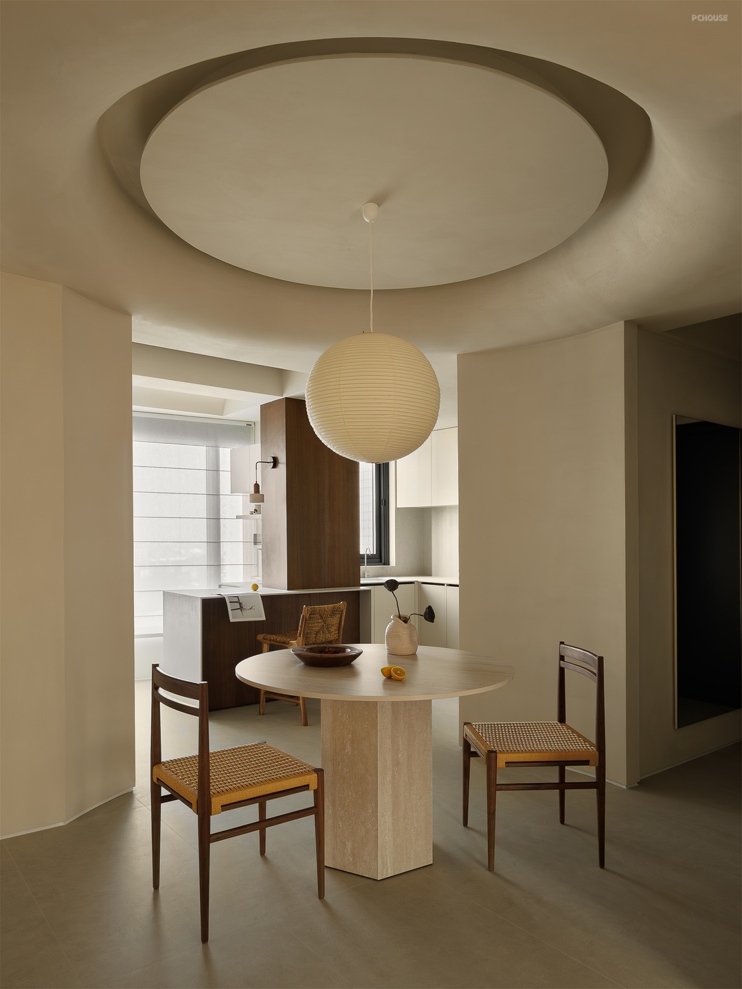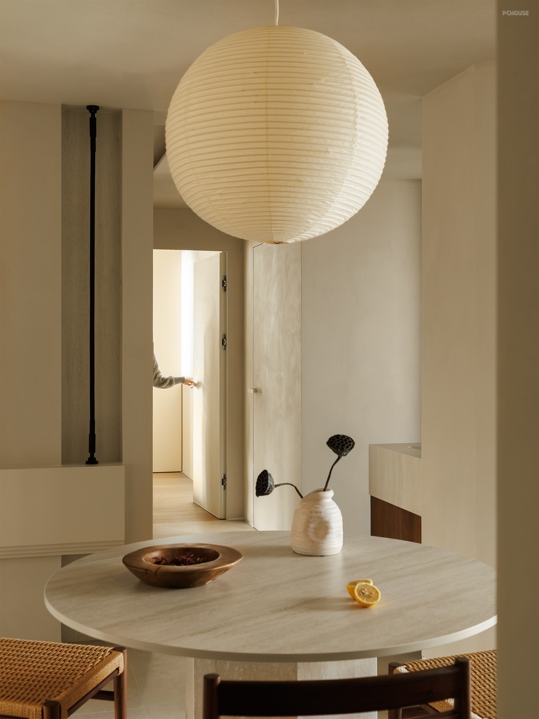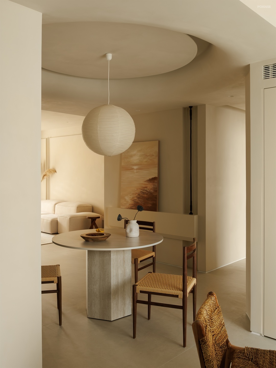 餐厨空间以柔和米调为底,勾勒温润烟火场域。圆形纸灯悬于餐桌,洒下朦胧光晕,编织藤椅、质朴圆桌,呼应原木柜体的自然质感。