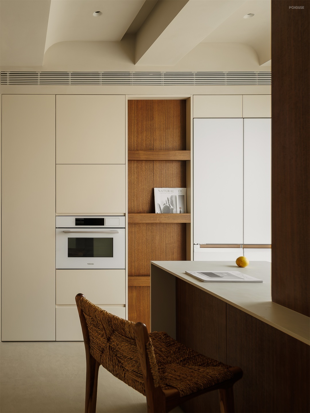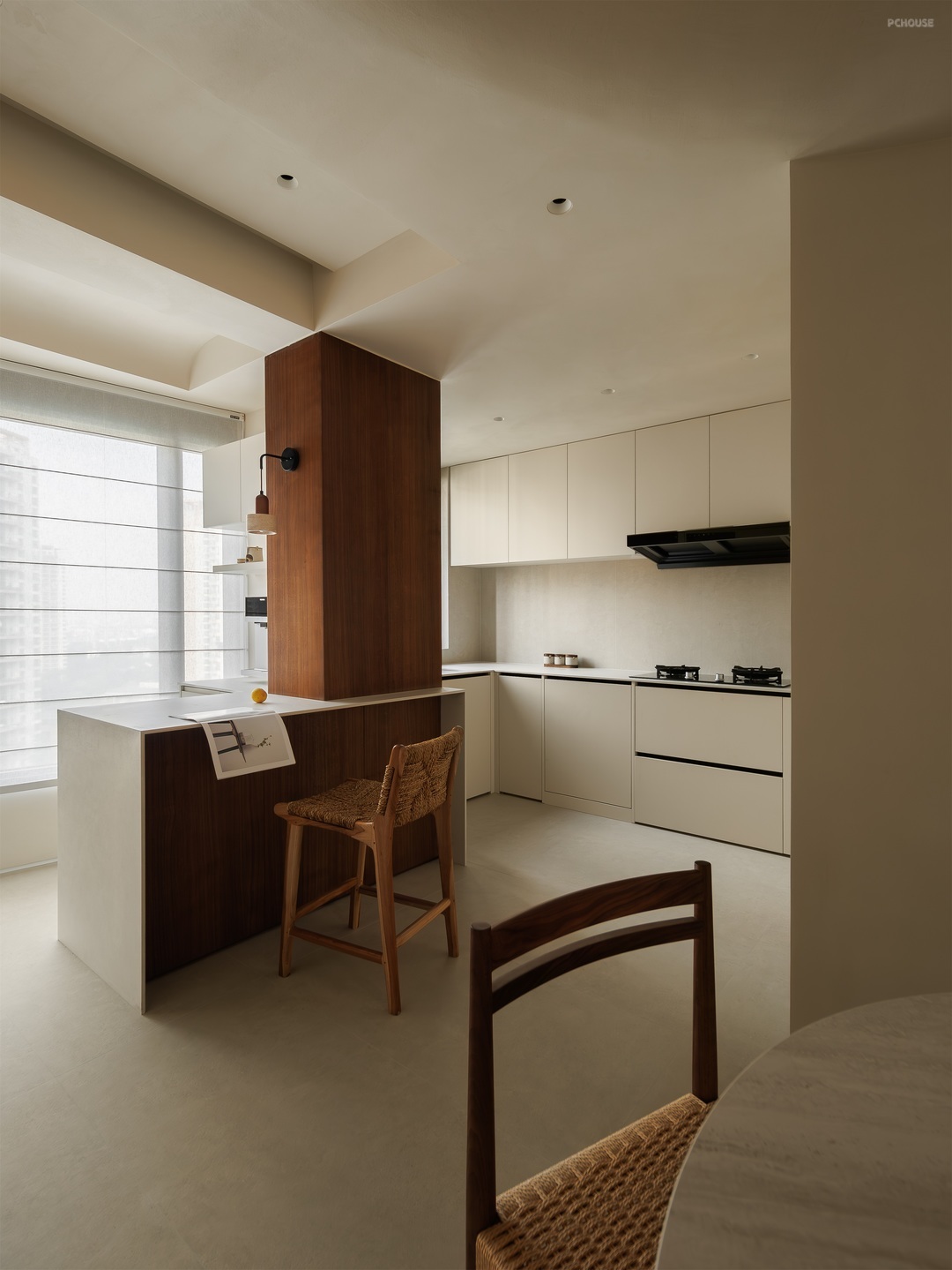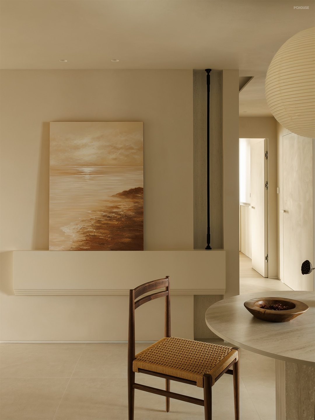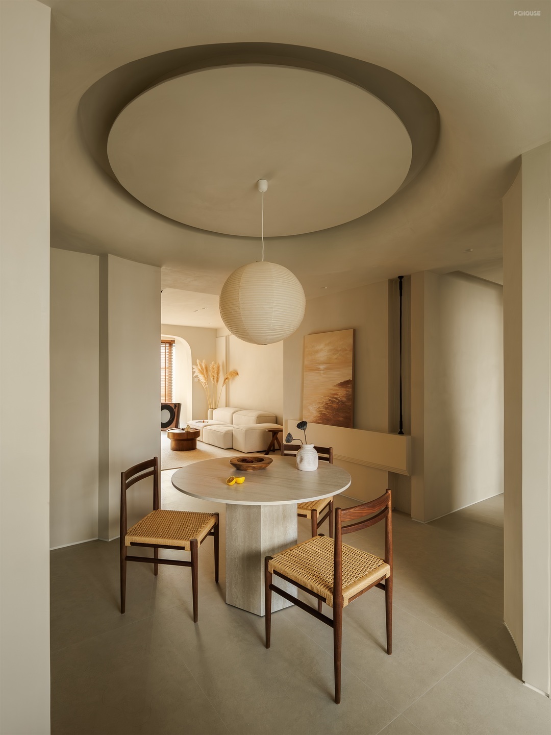 餐厨空间以柔和米调为底,勾勒温润烟火场域。圆形纸灯悬于餐桌,洒下朦胧光晕,编织藤椅、质朴圆桌,呼应原木柜体的自然质感。