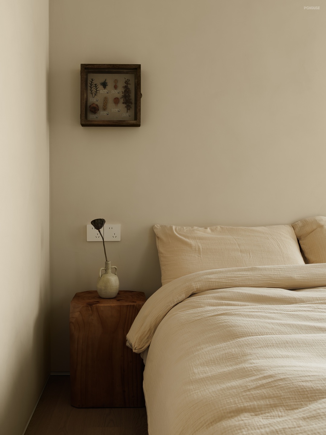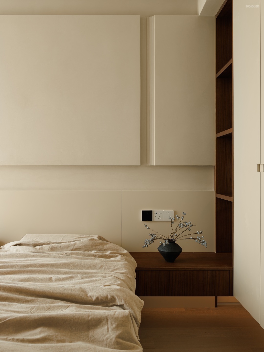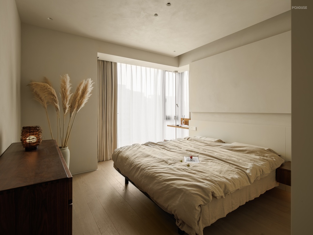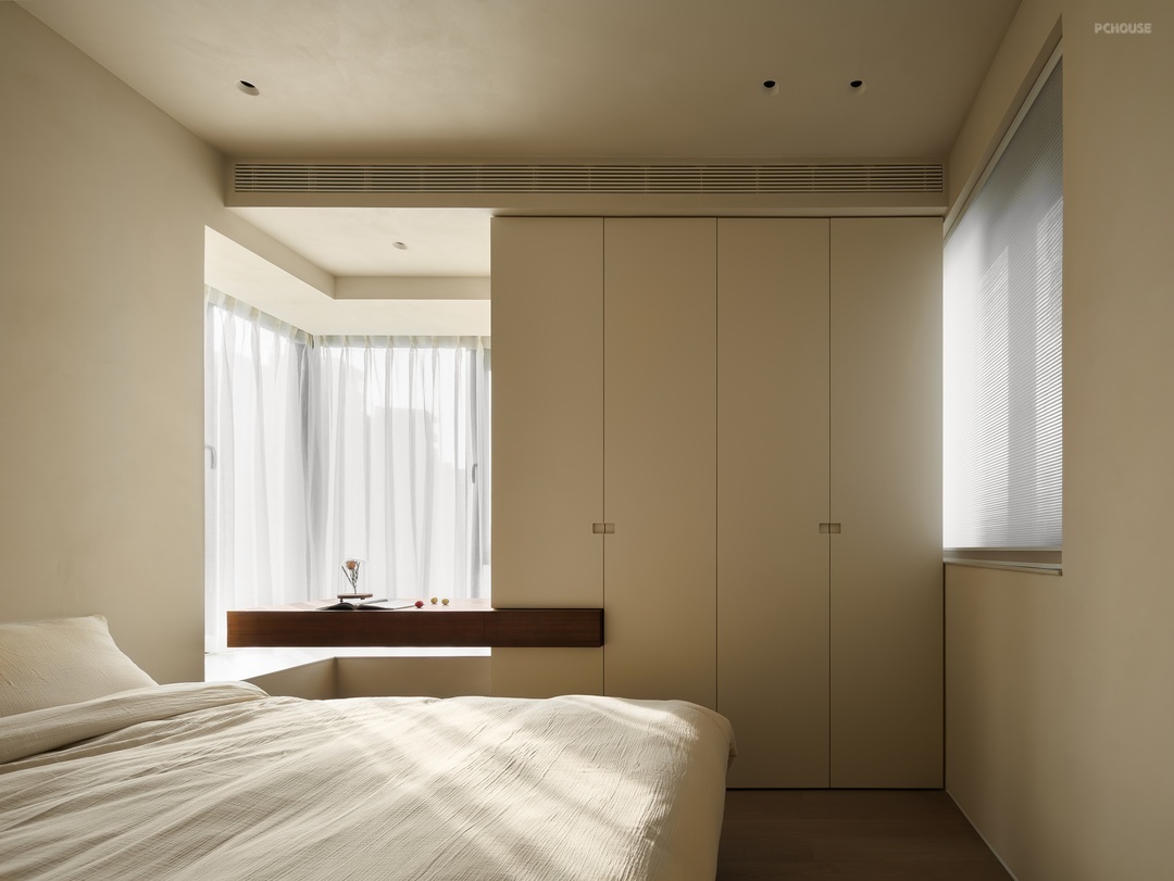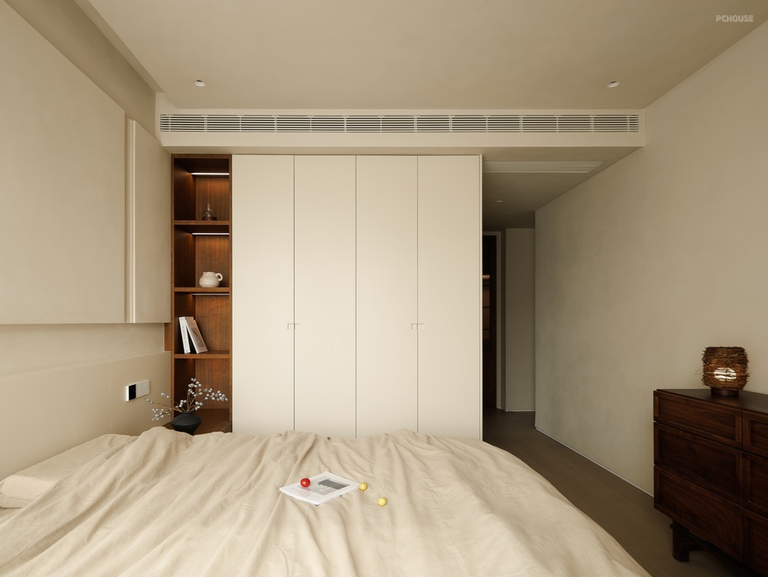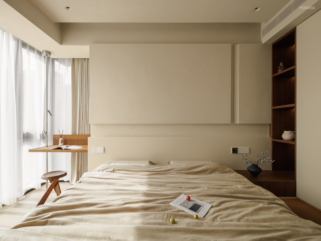 以素净的浅米色为底色,营造出宁静柔和的氛围。原木色床头柜质朴自然,搭配简约花瓶与干花,添几分文艺气息;定制柜体简洁利落,融入空间。阳光透过轻柔窗帘,在床品上洒下斑驳光影,没有繁杂装饰,却以纯粹的质感,打造出治愈身心的休憩角落,是独处、休憩的静谧小天地。