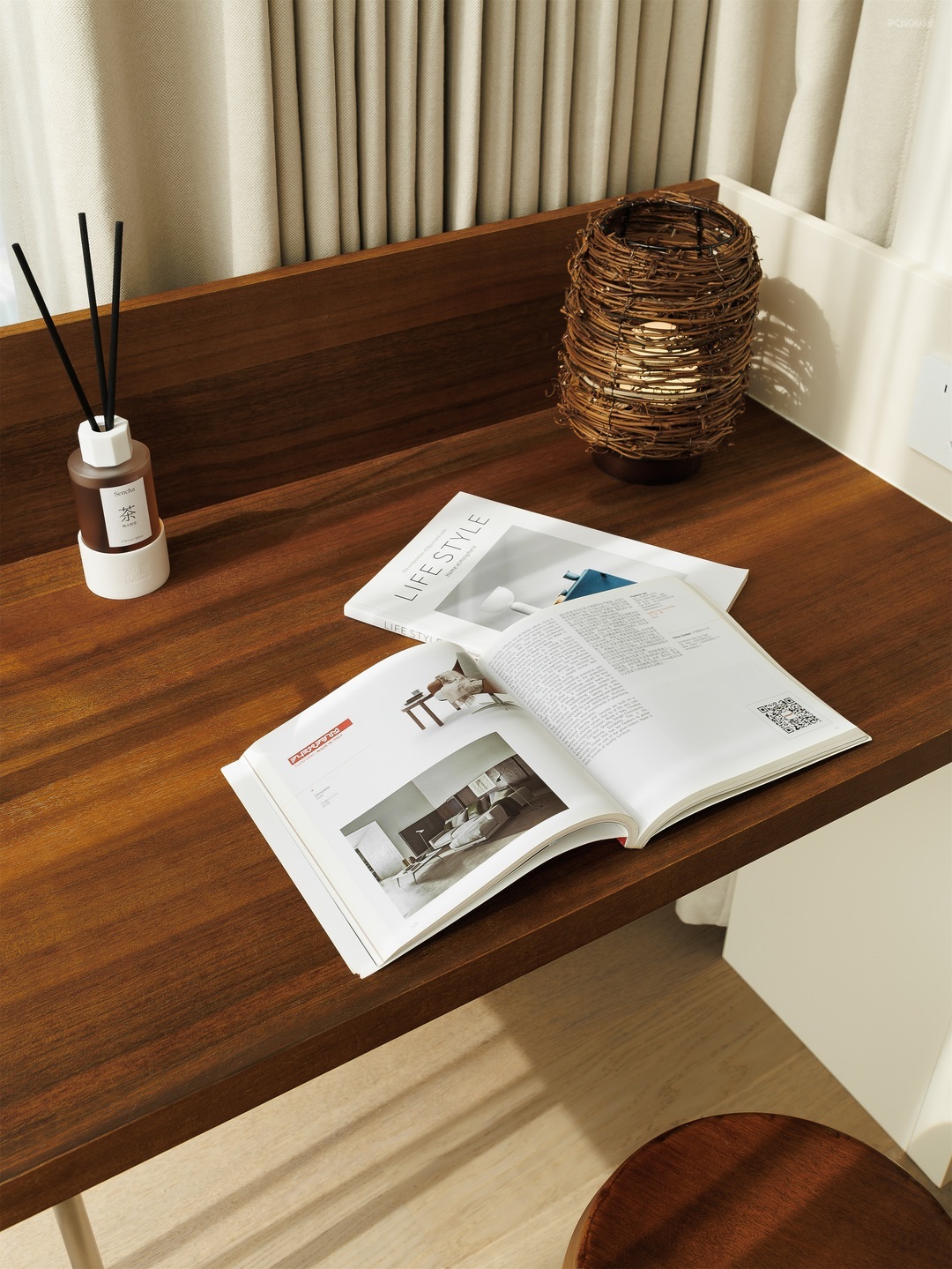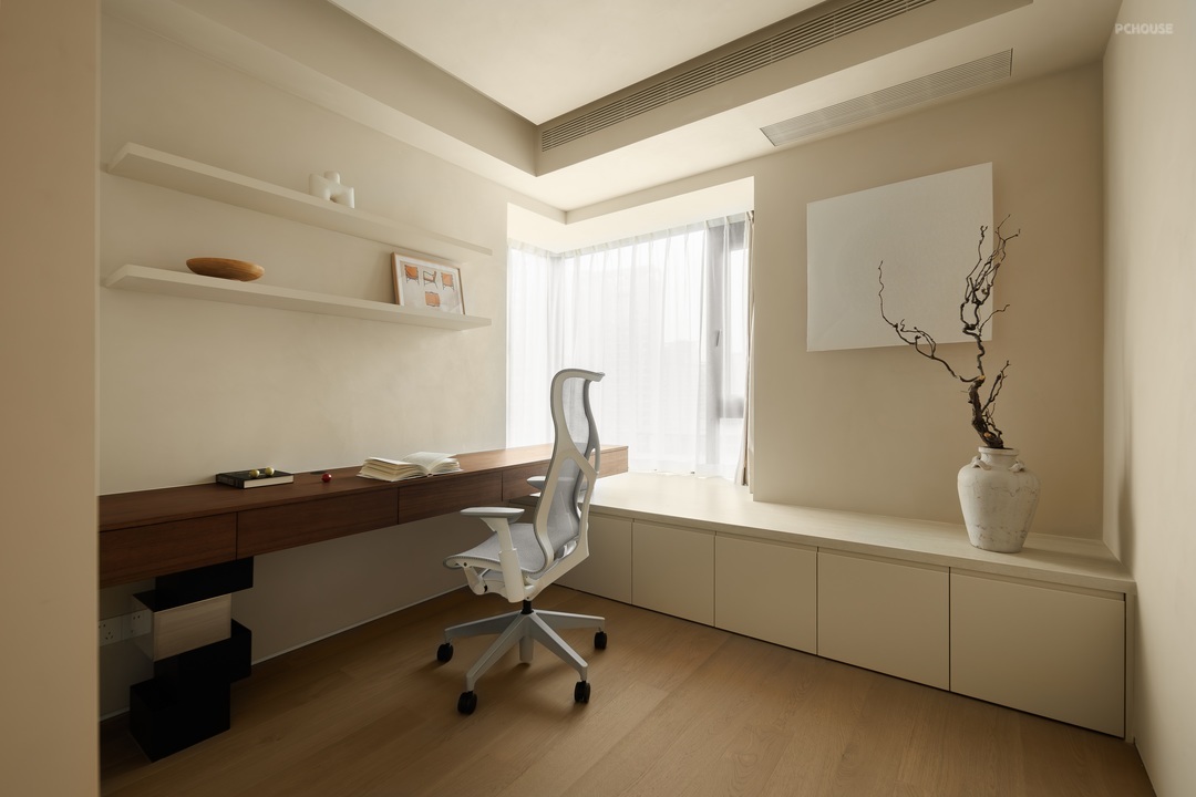 原木色长桌搭配简约办公椅,实用又显温润。墙面错落的白色搁板,陈列着小物件,增添生活意趣。窗边设收纳式飘窗,阳光透过纱帘洒落,一旁枯枝花艺点缀,让阅读、办公的时光,满是宁静与诗意。