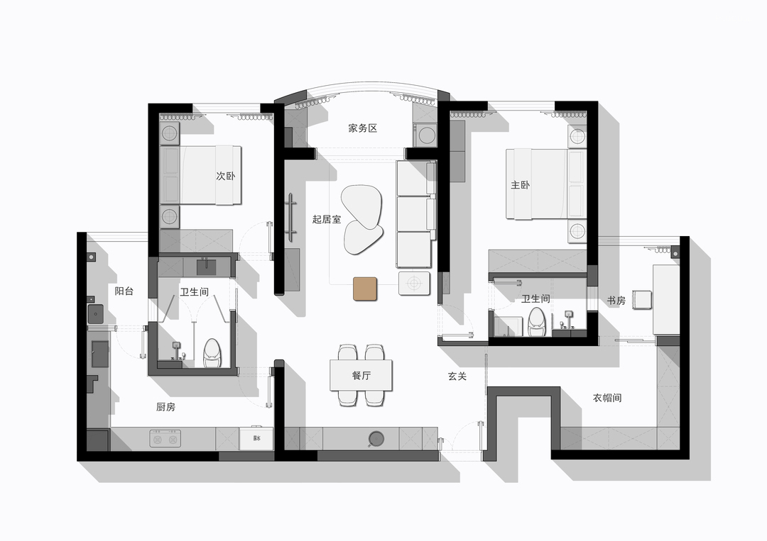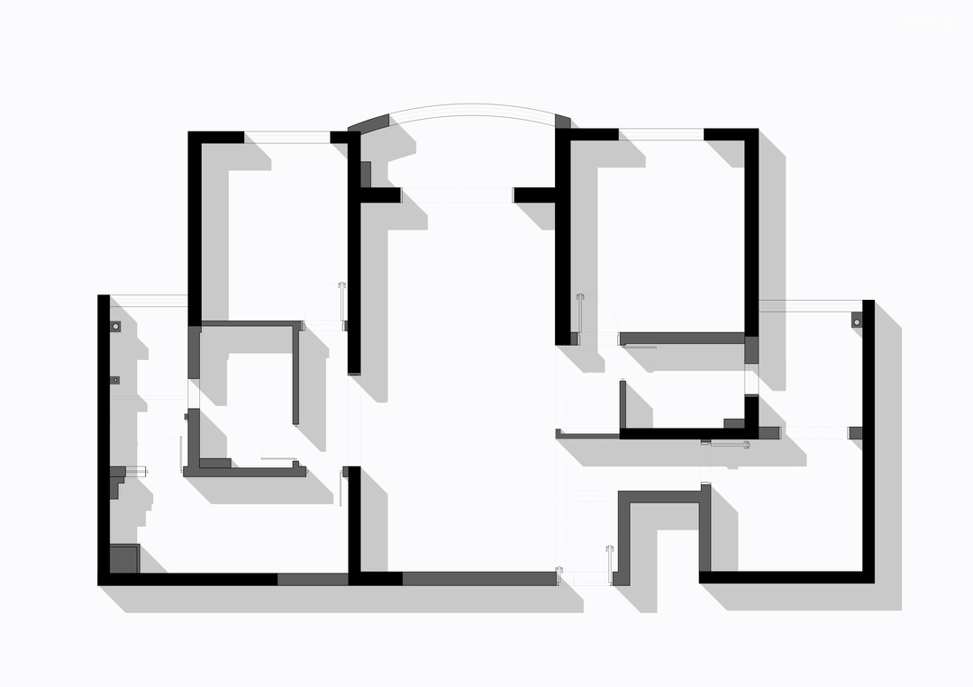 面对进深过长、采光单一、零碎空间堆积的原始户型,我们与屋主共同确立了「柔性生长」的设计目标——既非颠覆性改造,也不妥协于生活惯性,而是在有限的条件下构建可灵活调整的生活框架,让每个区域既保持独立性又形成有机联动。