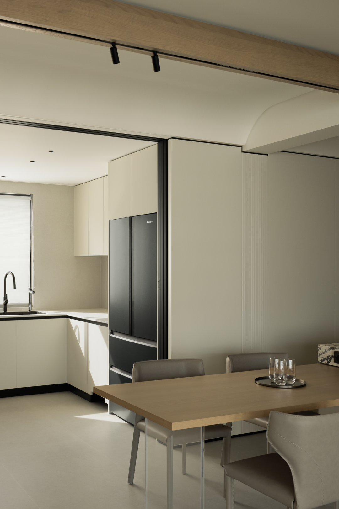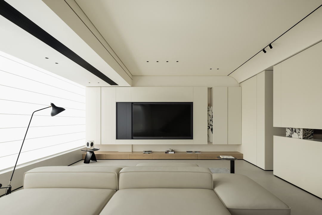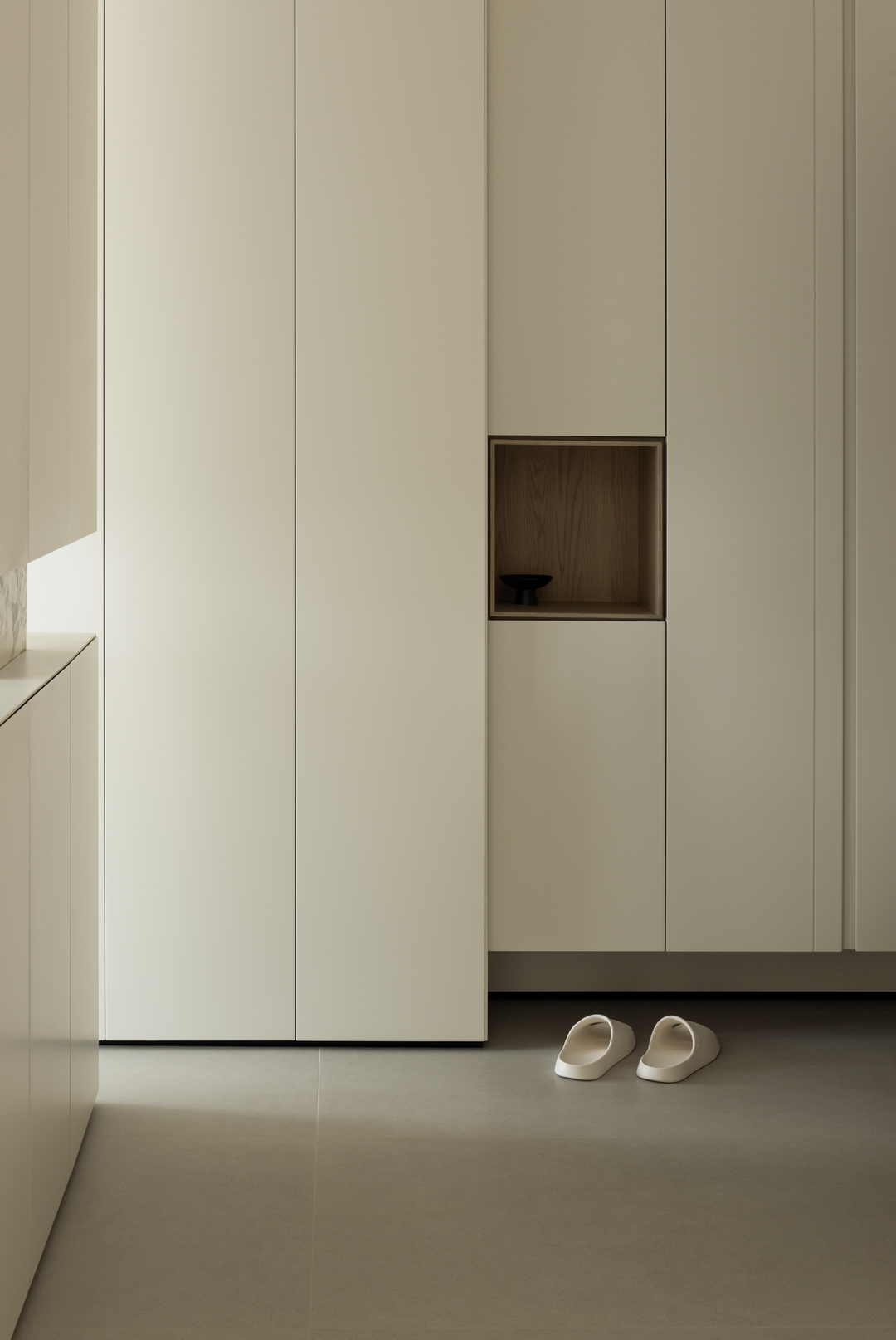 过厅作为空间过渡,延续简素风格。浅米色墙面与大地色磁砖,让脚步自然放缓。柜体与材质的变化实现柔性分隔,既保障空间连贯,又悄然划分区域。光线透过,营造出呼吸般的韵律,似在诉说:生活需要快慢相宜,在这里,让身心在过渡中寻得自然的平衡与休憩。