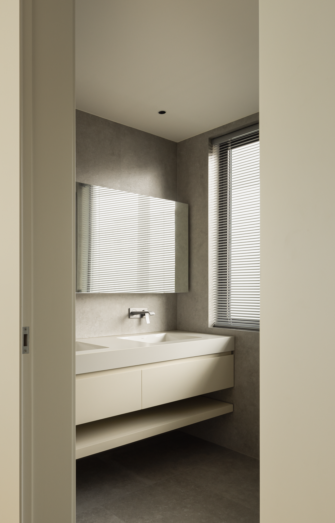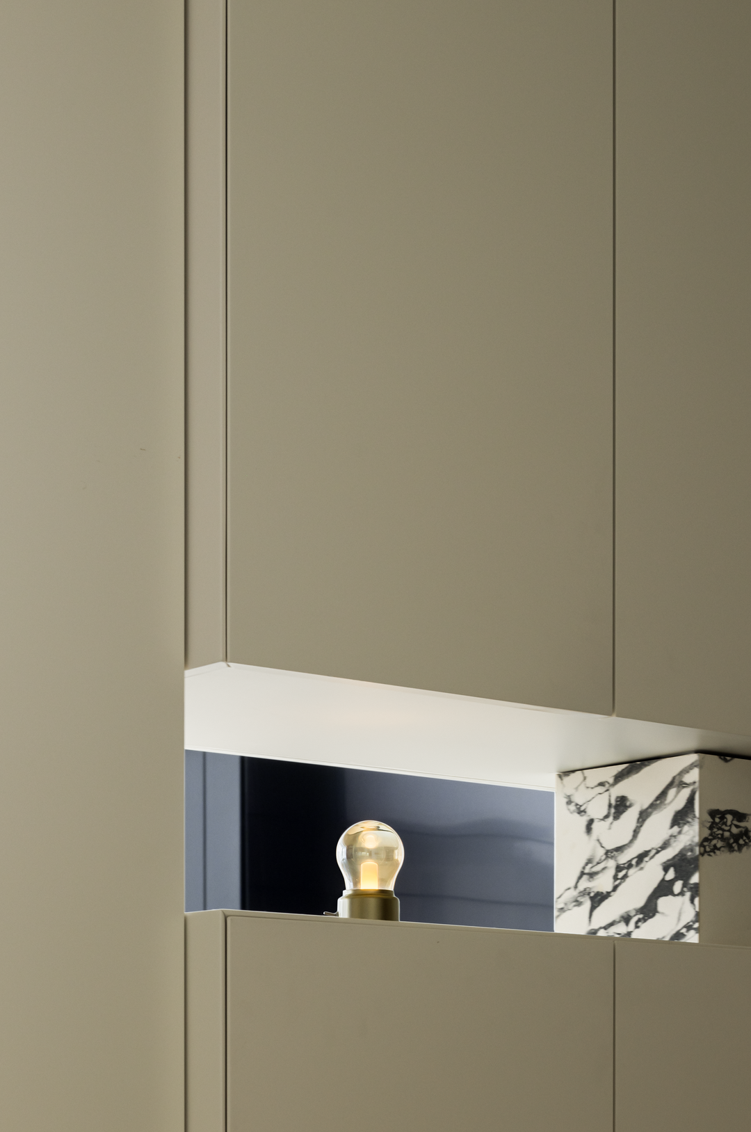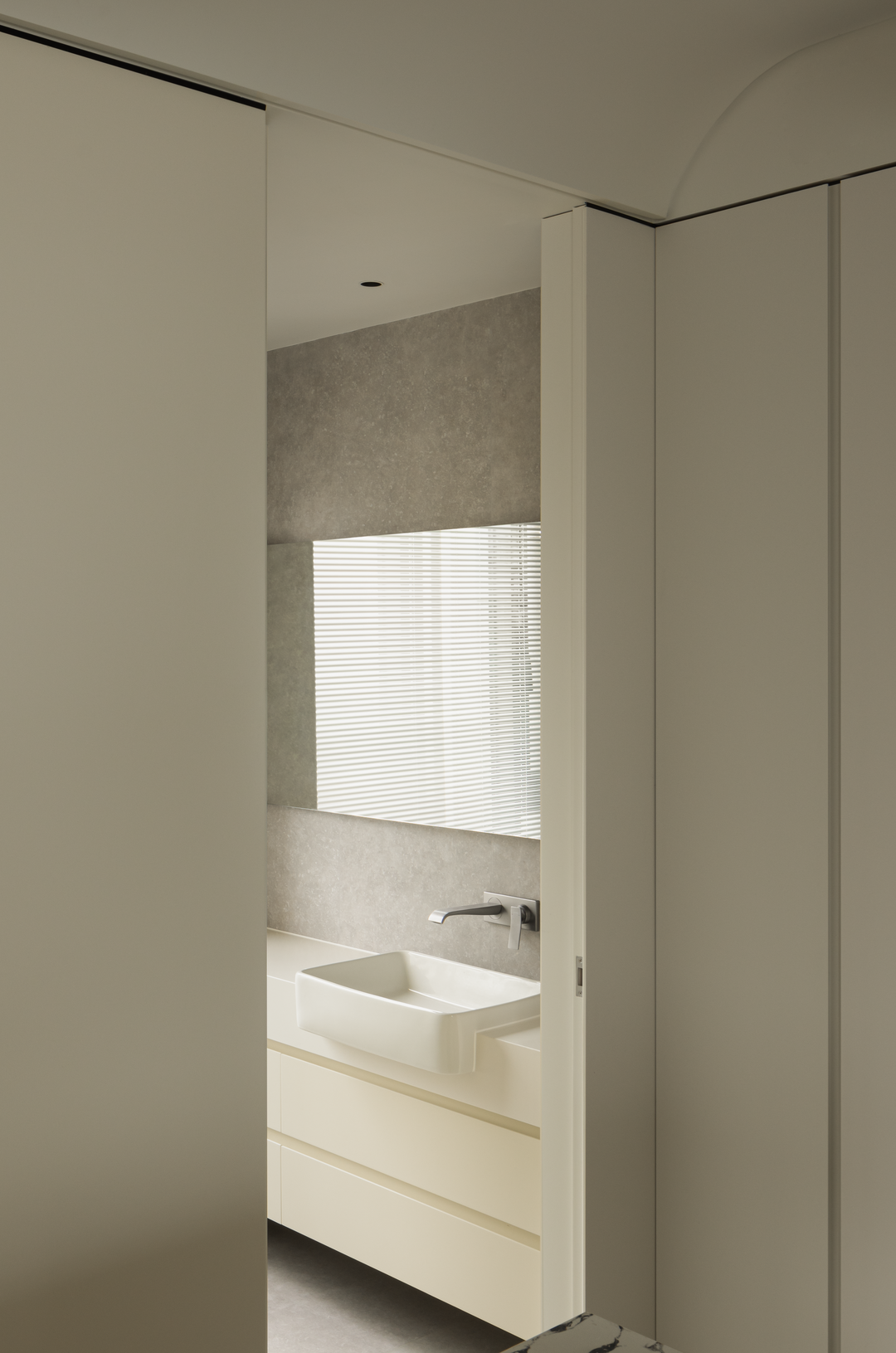 过厅作为空间过渡,延续简素风格。浅米色墙面与大地色磁砖,让脚步自然放缓。柜体与材质的变化实现柔性分隔,既保障空间连贯,又悄然划分区域。光线透过,营造出呼吸般的韵律,似在诉说:生活需要快慢相宜,在这里,让身心在过渡中寻得自然的平衡与休憩。