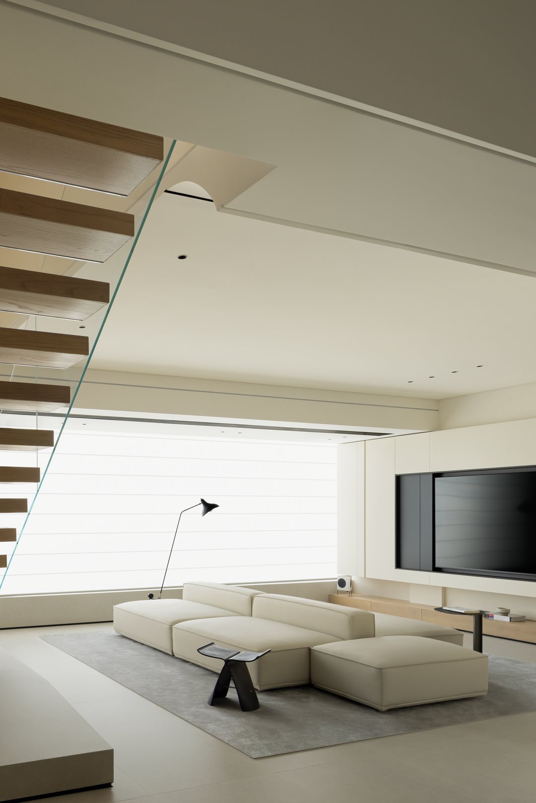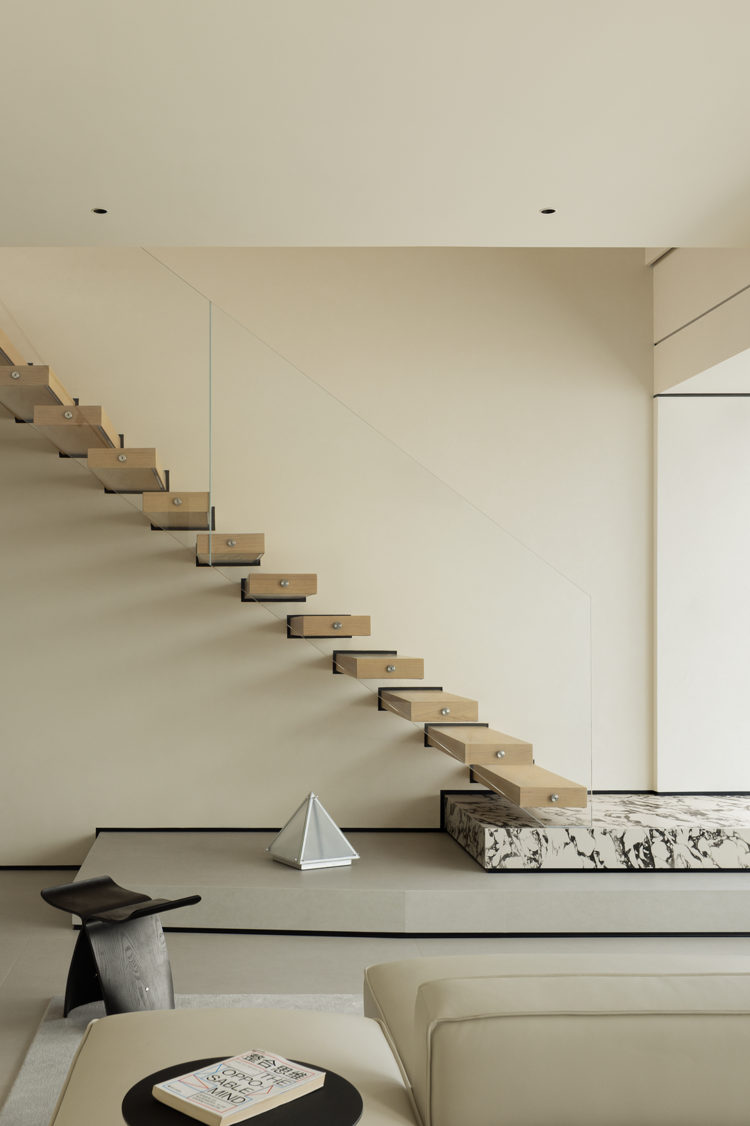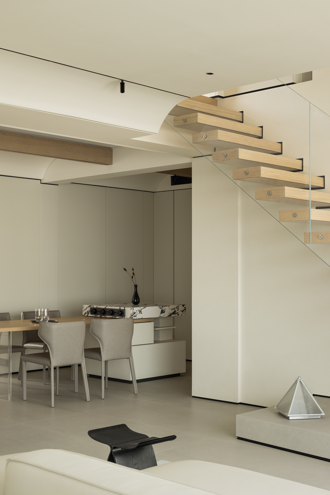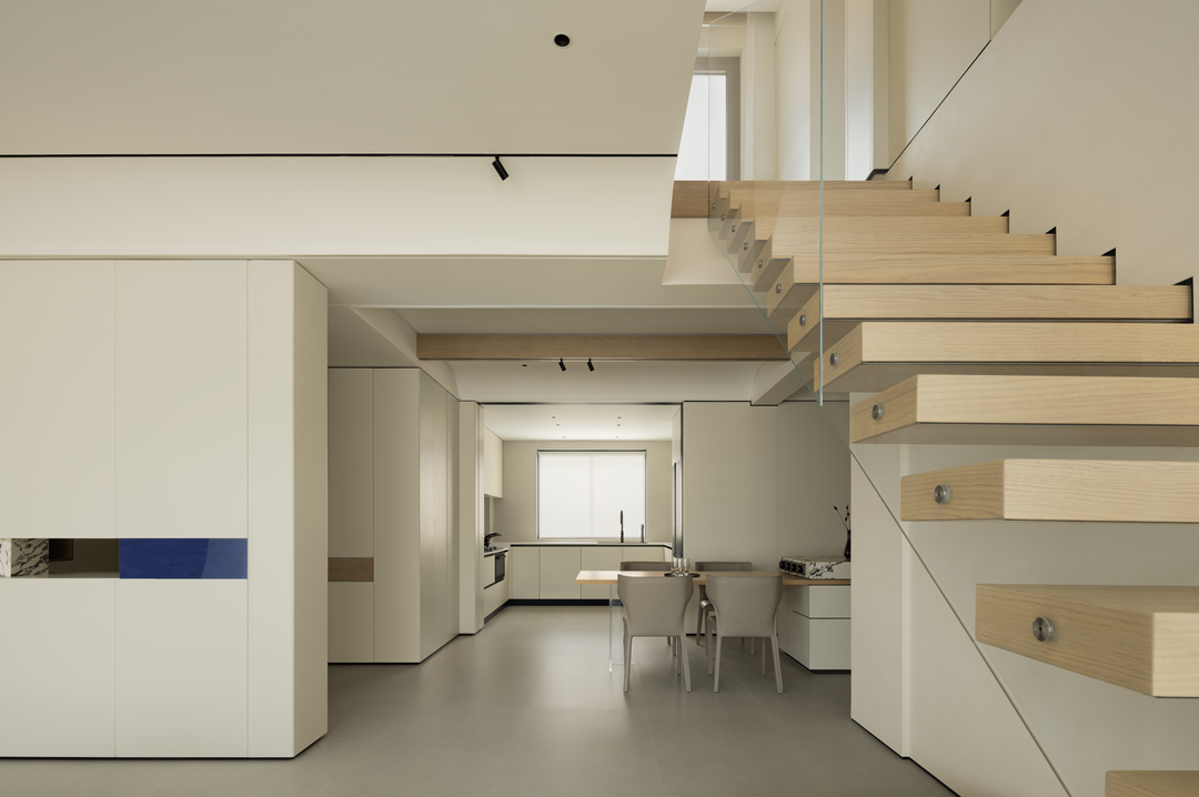 楼梯以「悬浮式」设计成为空间亮点,浅木色踏步搭配超白钢化玻璃护栏,轻盈通透如空中纽带。它打破上下层物理阻隔,强化空间联动,让光线与视线自由穿梭。