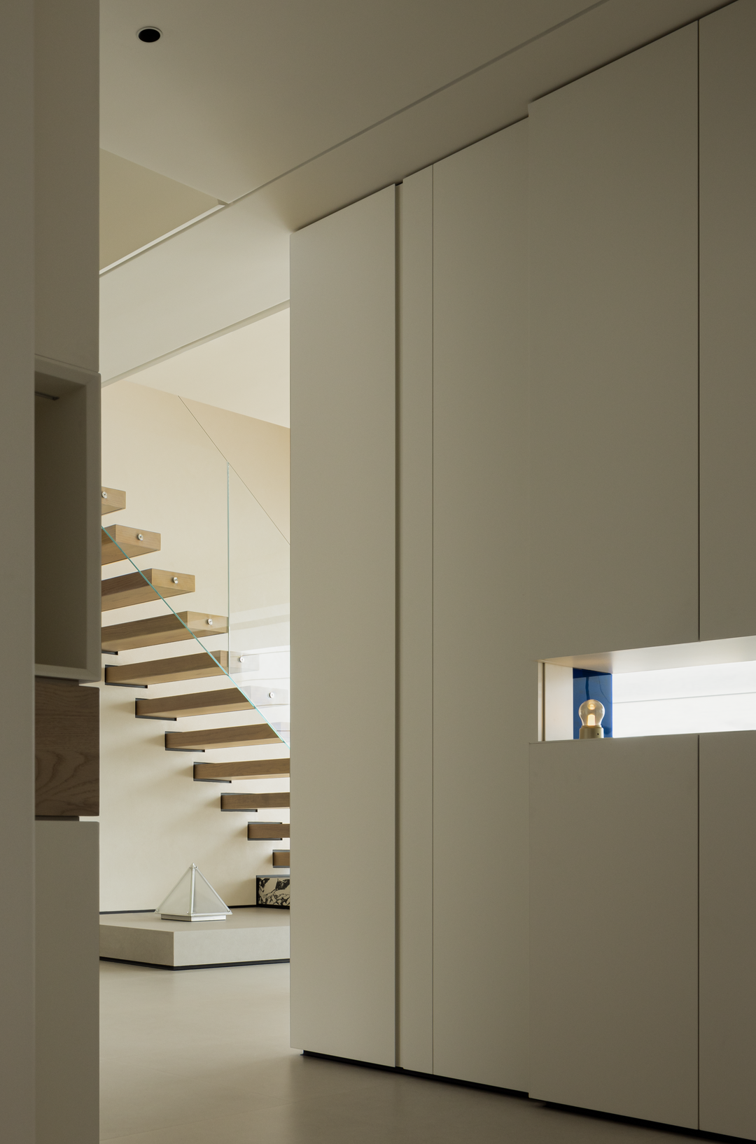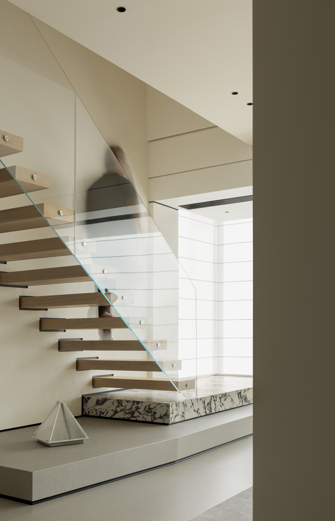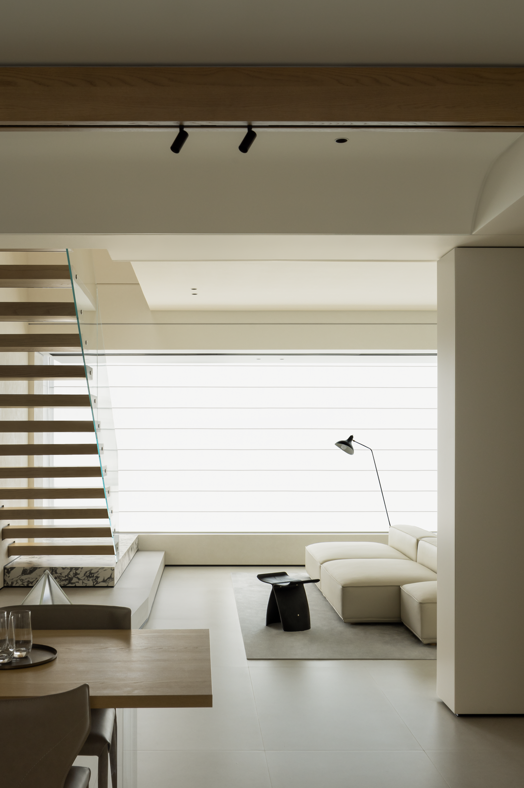 楼梯以「悬浮式」设计成为空间亮点,浅木色踏步搭配超白钢化玻璃护栏,轻盈通透如空中纽带。它打破上下层物理阻隔,强化空间联动,让光线与视线自由穿梭。
