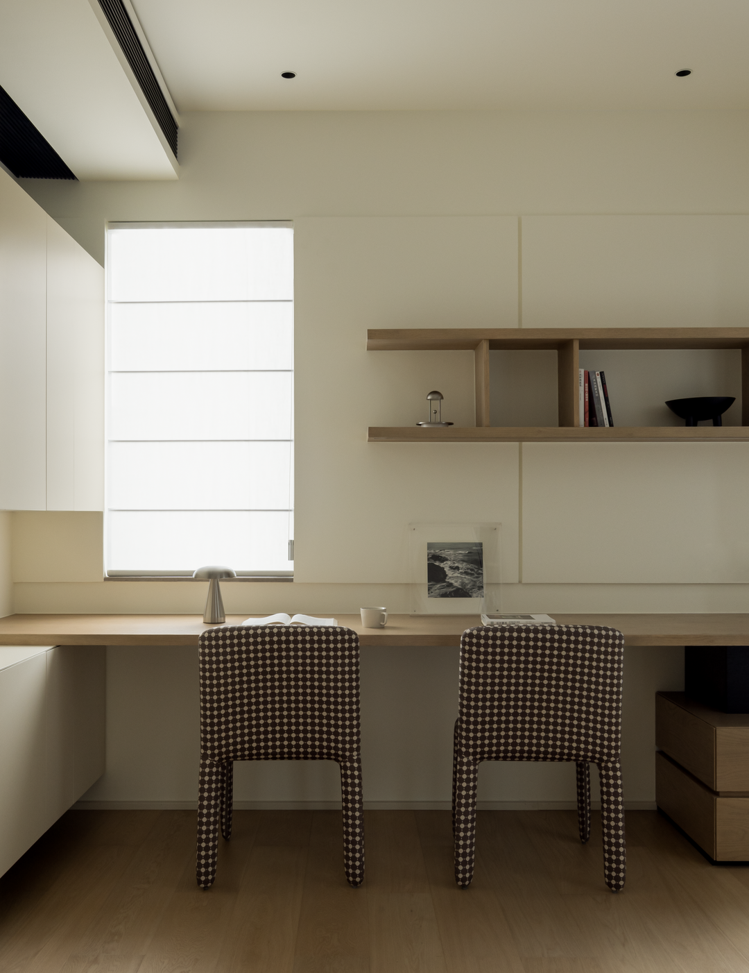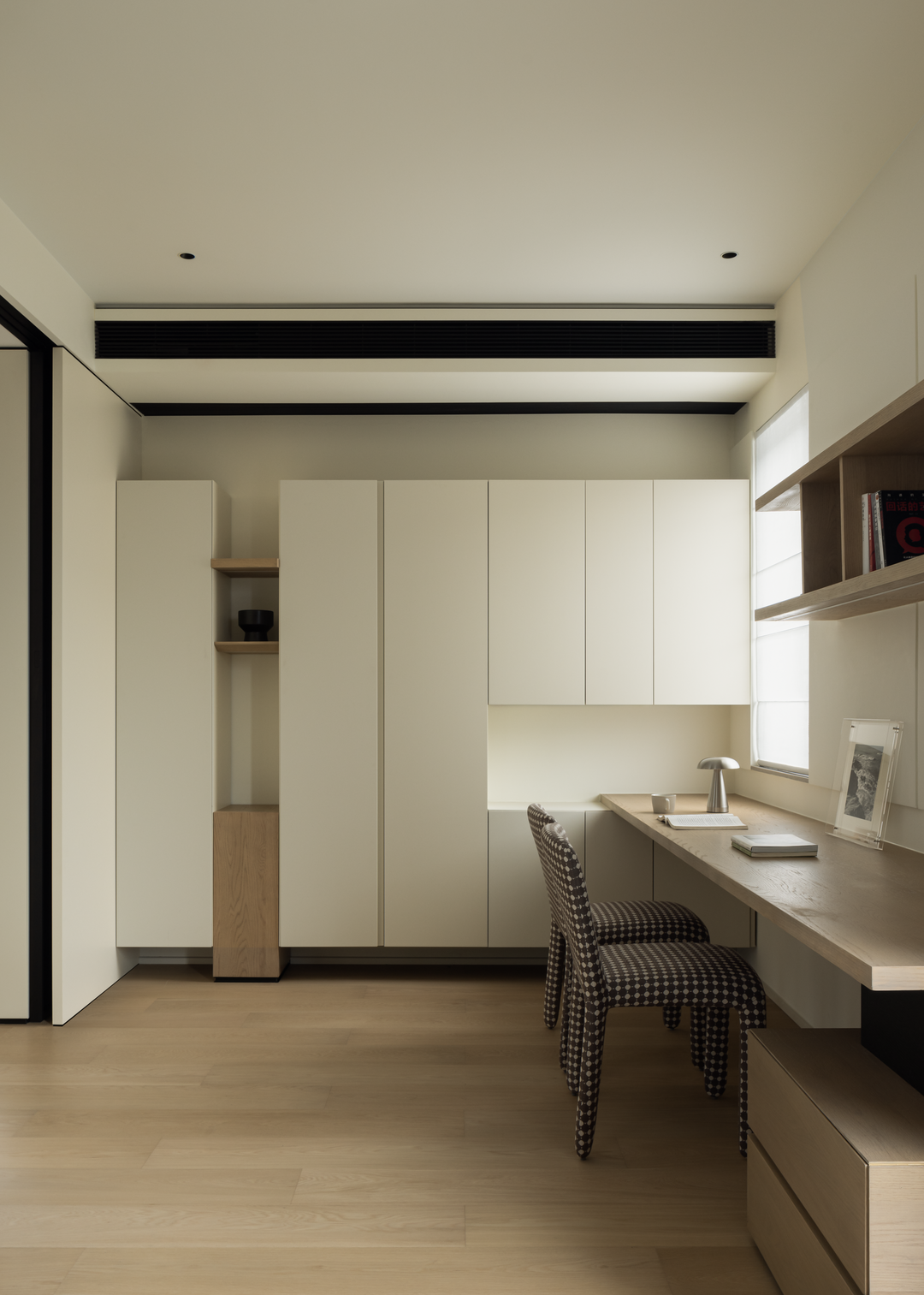 书房以浅木色为主调,营造宁静氛围。L 型书桌与整面柜体结合,收纳与工作区完美融合。靠窗设计让自然光倾泻而入,格子座椅增添趣味。