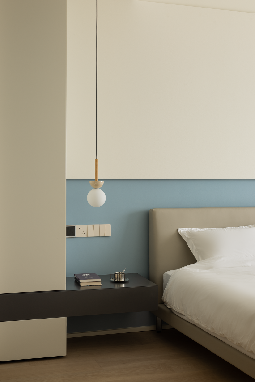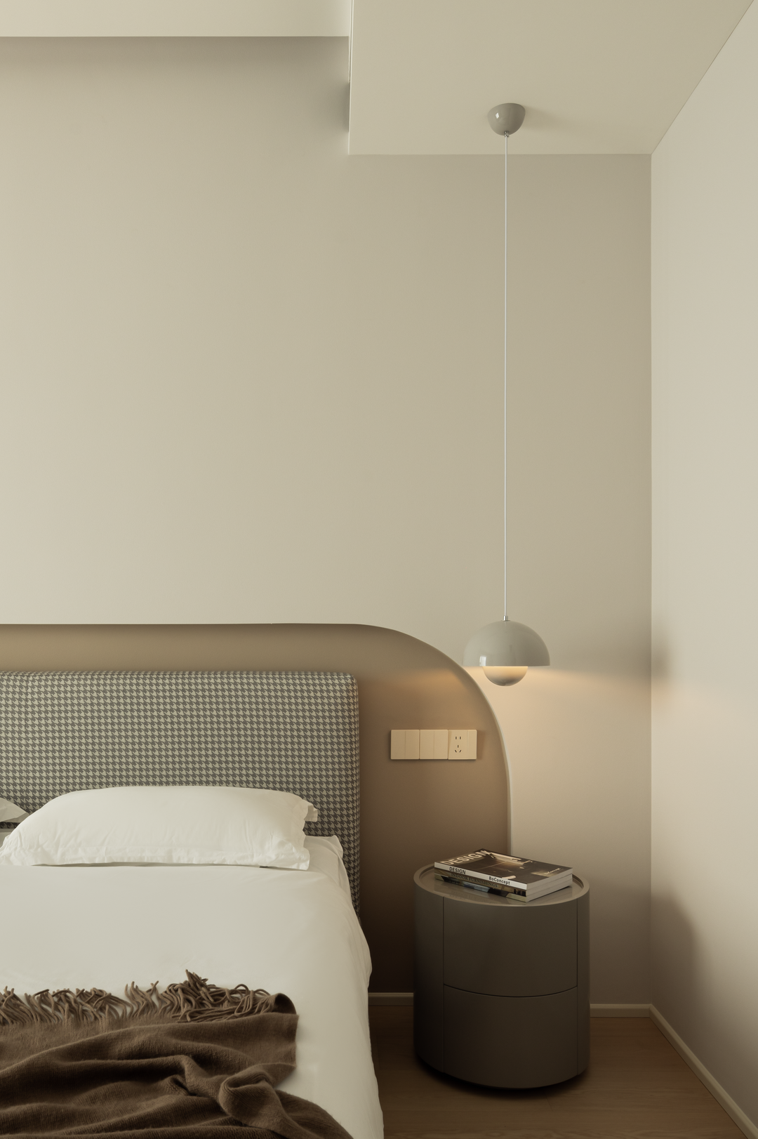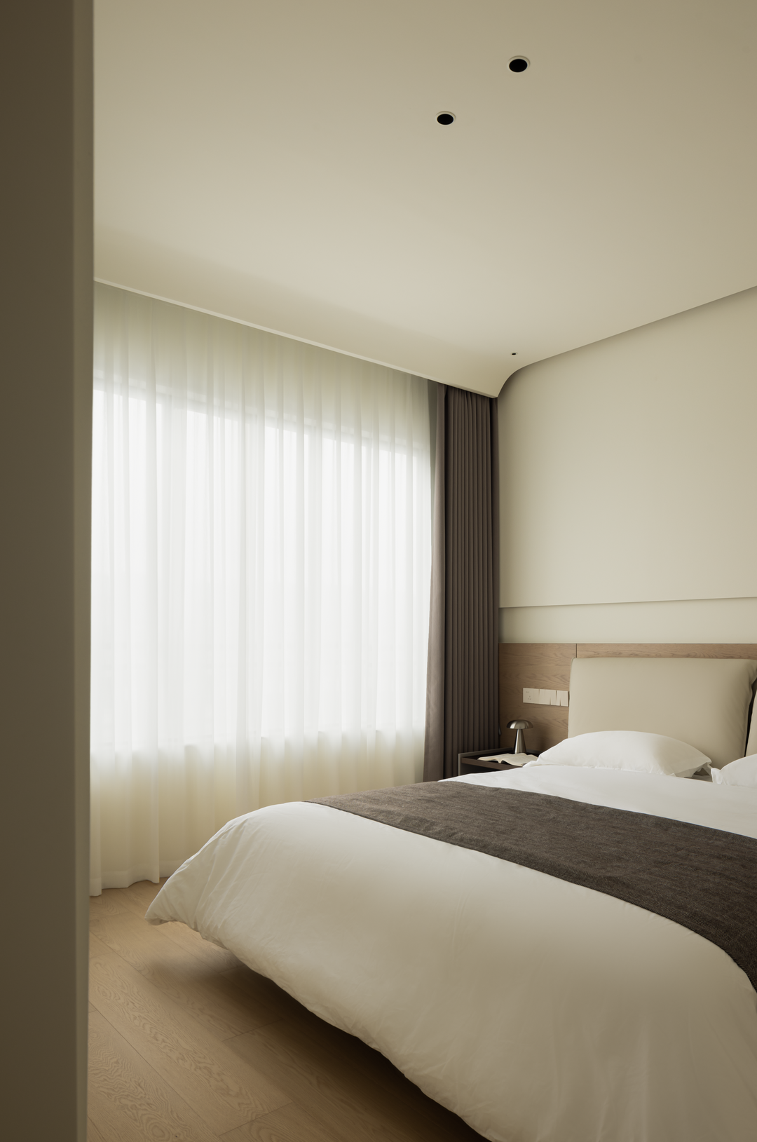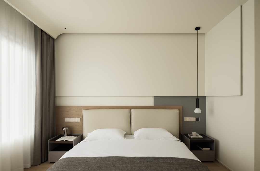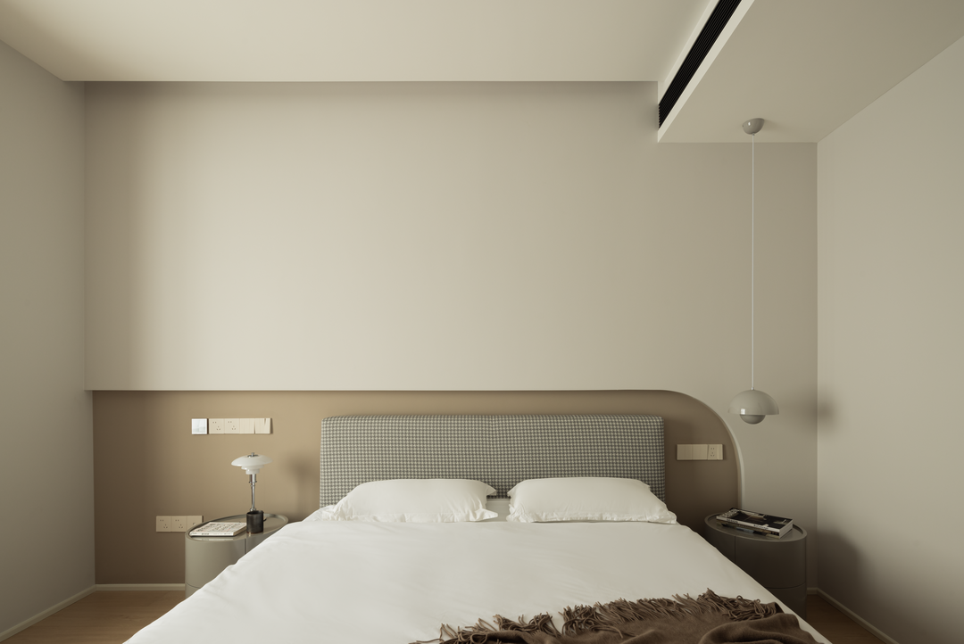 主卧以浅咖与米白营造侘寂氛围,弧形床头背景墙如温柔怀抱。木质地板传递自然温度,无主灯设计让光线柔和洒落。床头开放格可陈列小物,留存生活诗意。