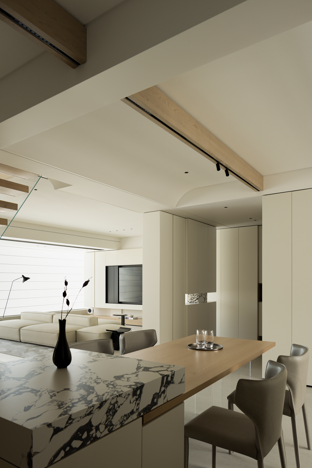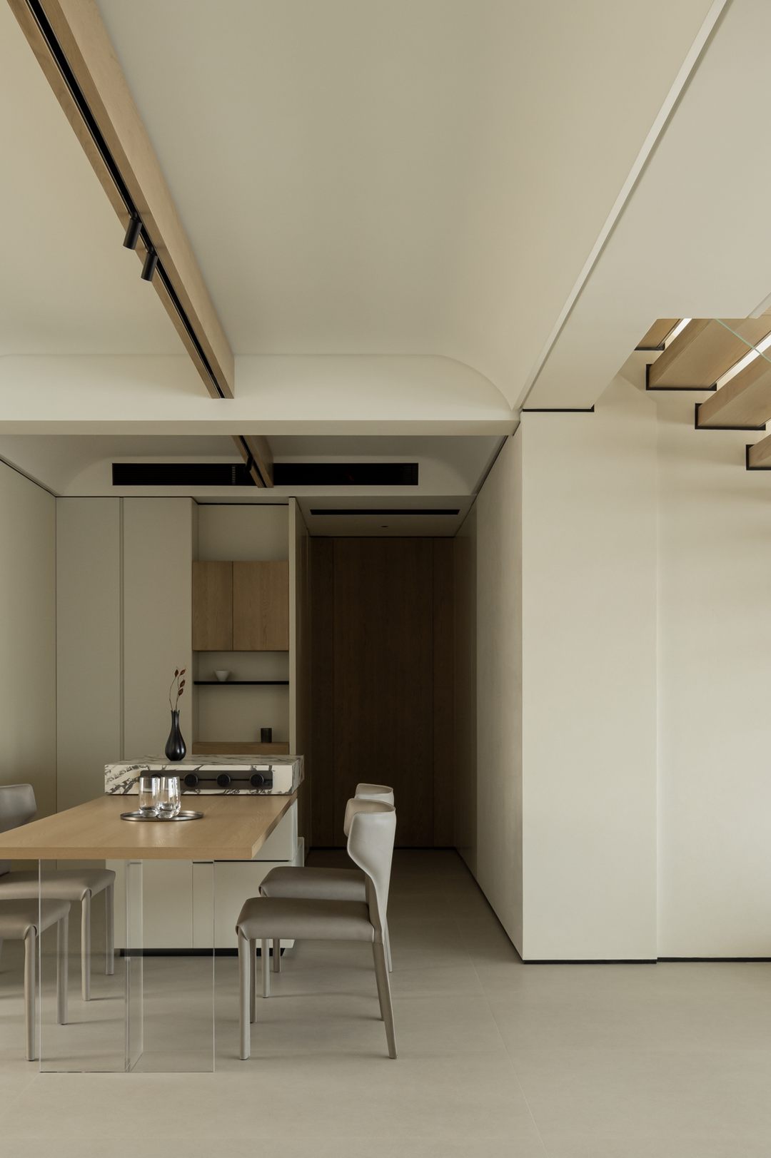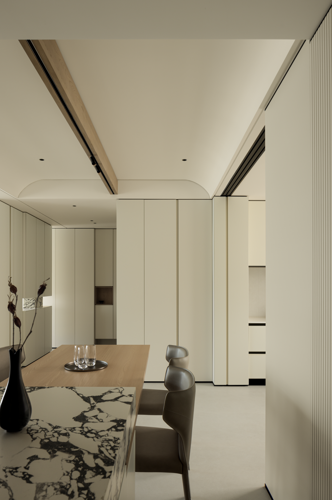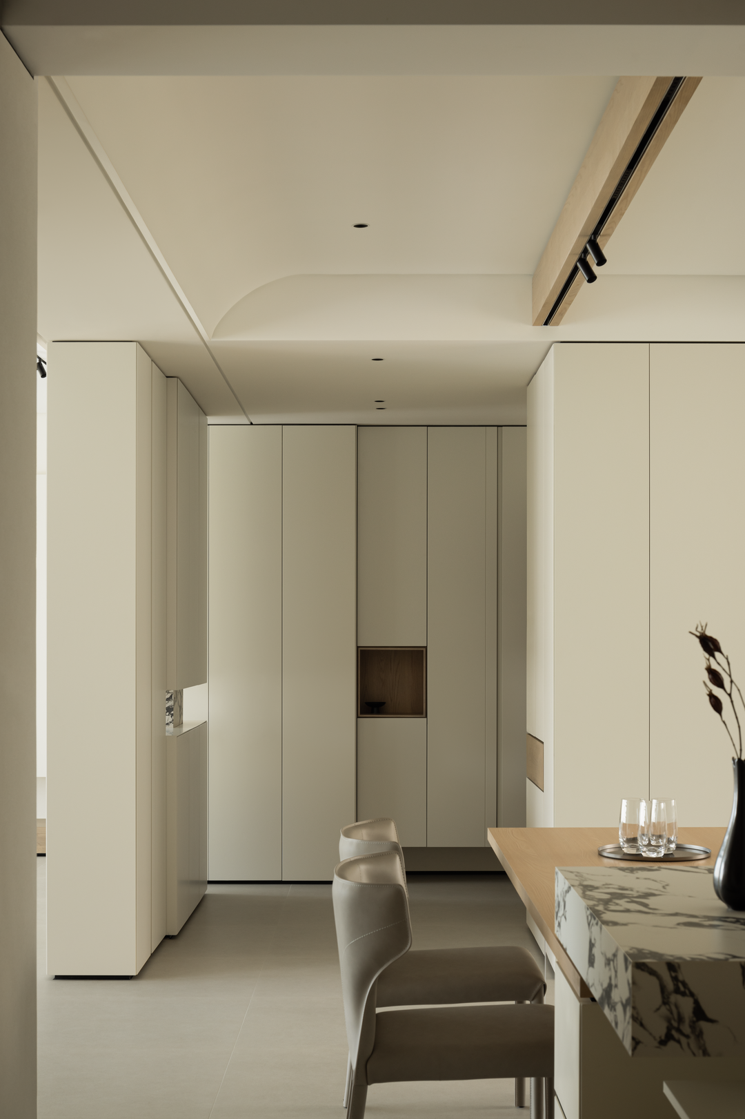 餐厅延续整体简素风格,浅木色餐桌与大理石纹理餐台碰撞,温润与冷峻交融。开放式布局使烹饪、用餐自然衔接,家人下厨时的谈笑,用餐时的分享,都在这无界空间里升温。