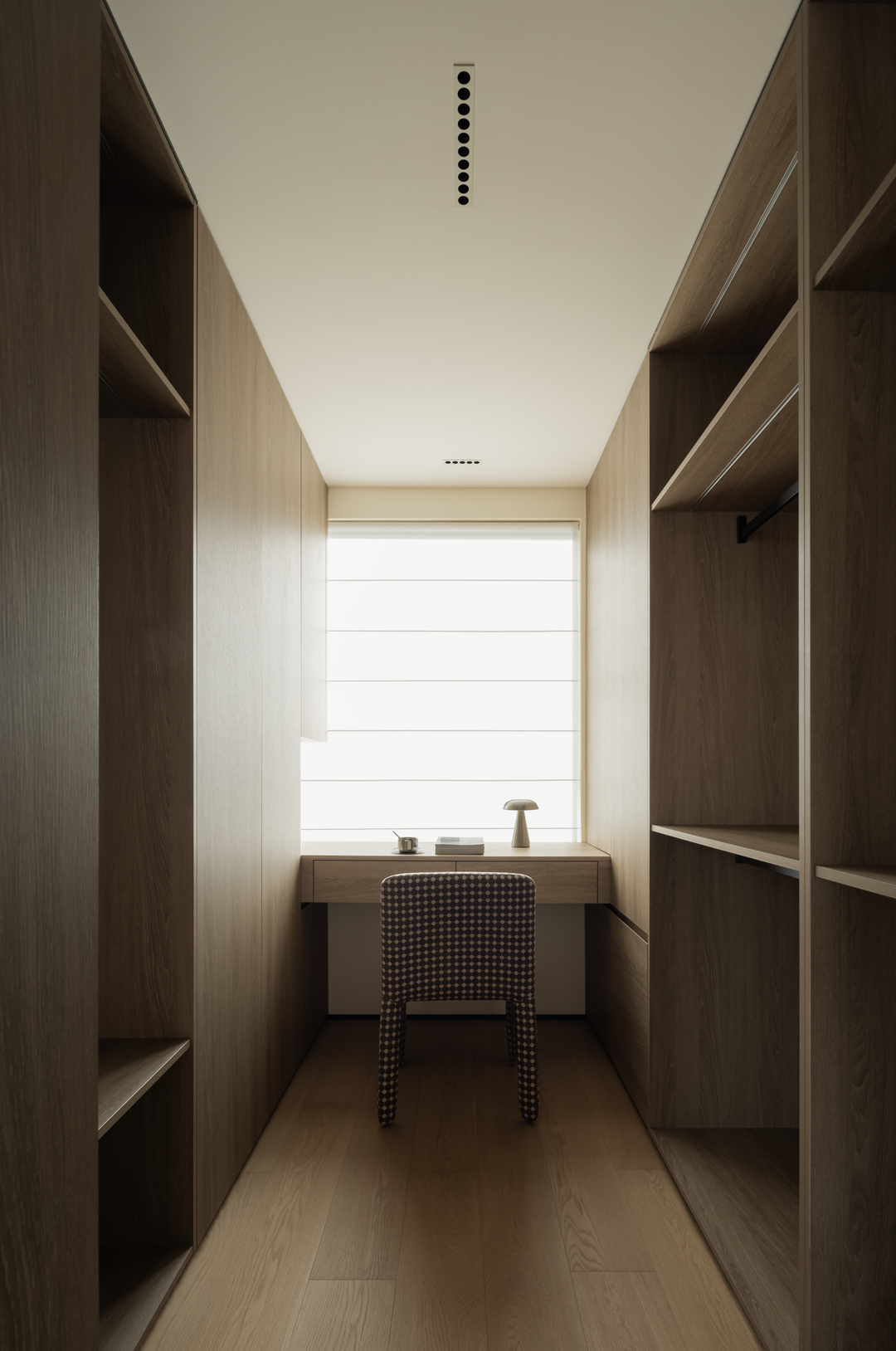 衣帽间浅木色柜体围成私密空间。一侧收纳衣物,一侧摆放书桌,功能完美交融。自然光线透过百叶窗,让衣物挑选与阅读工作都惬意。格子座椅、简约台灯点缀,精致与实用并存,在这里,生活的仪式感与实用性悄然相遇,打造专属的精致角落。