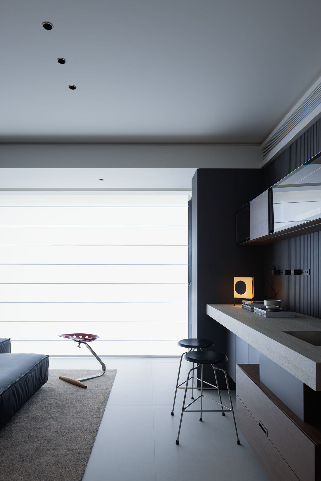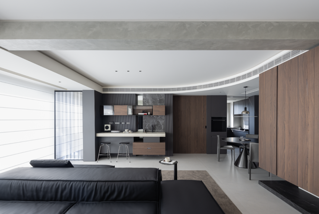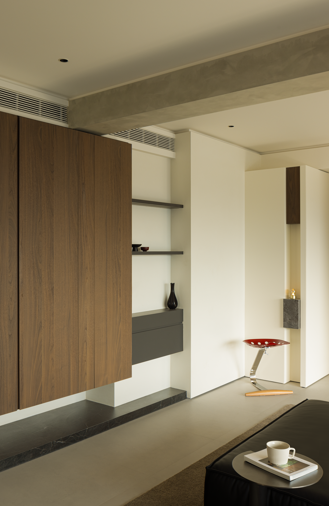 客厅一侧,一方雅致的吧台静静伫立,成为空间中的点睛之笔。左侧,悬空的灰色矮柜轻盈如浮云,顶部铺设温润的米色石纹台面,为实用注入柔和气质。台面之下,两个胡桃木色抽屉柜悬挑而立,材质间的质感碰撞,于简约中见匠心。