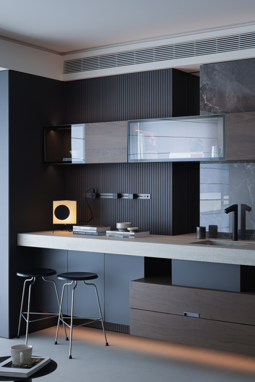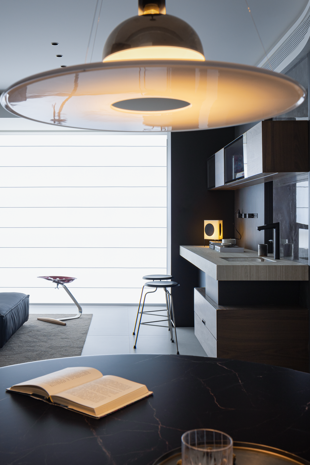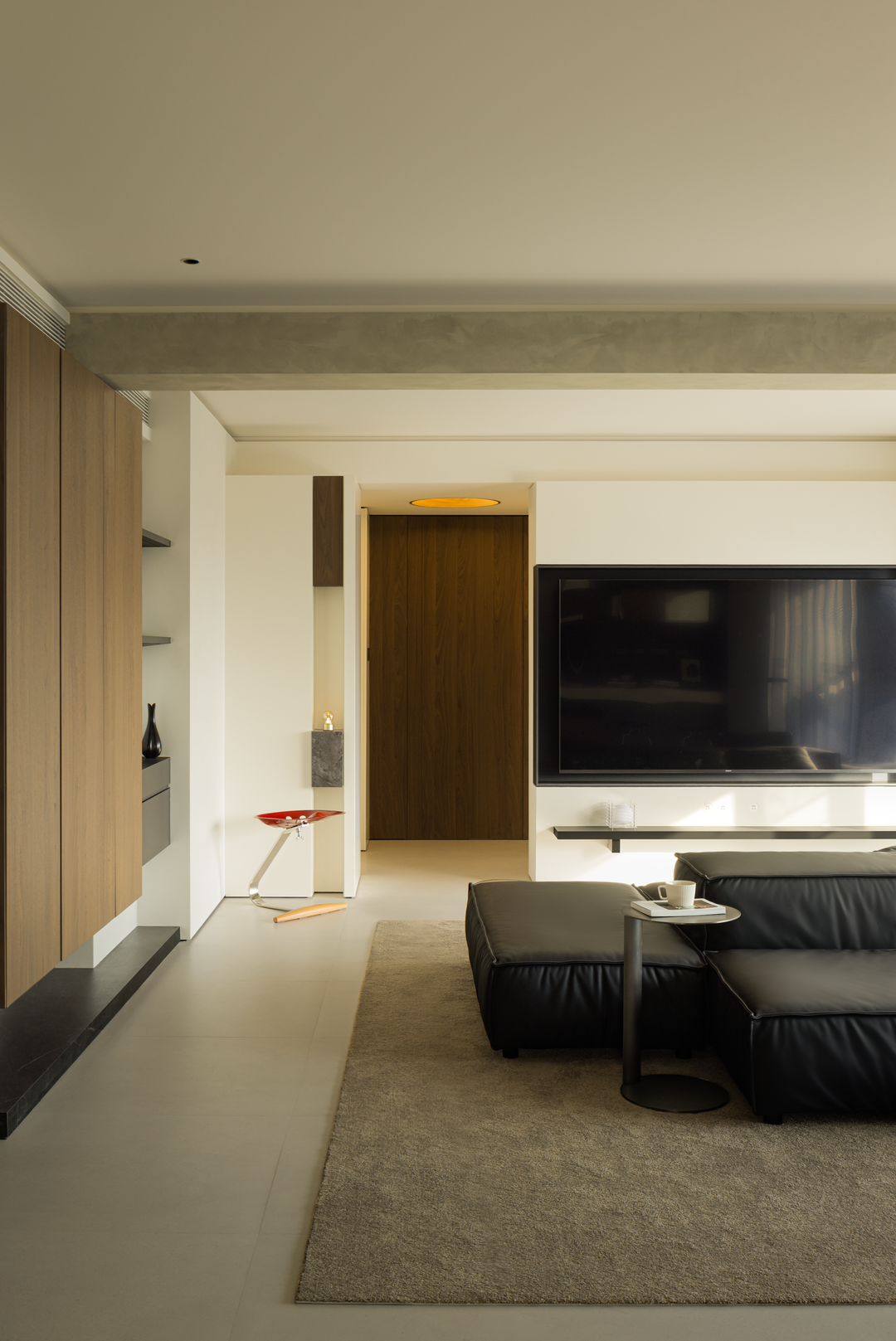 客厅一侧,一方雅致的吧台静静伫立,成为空间中的点睛之笔。左侧,悬空的灰色矮柜轻盈如浮云,顶部铺设温润的米色石纹台面,为实用注入柔和气质。台面之下,两个胡桃木色抽屉柜悬挑而立,材质间的质感碰撞,于简约中见匠心。