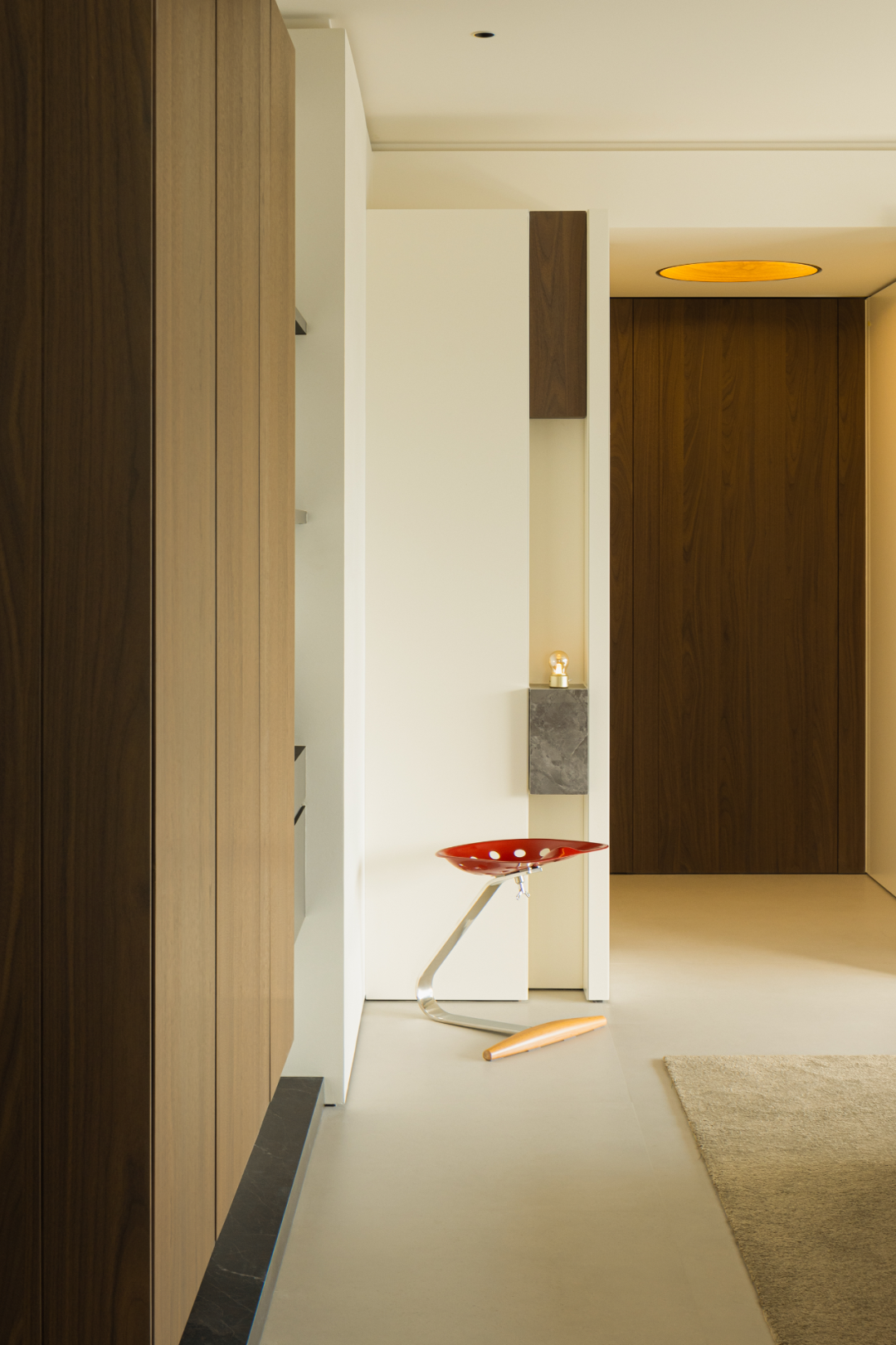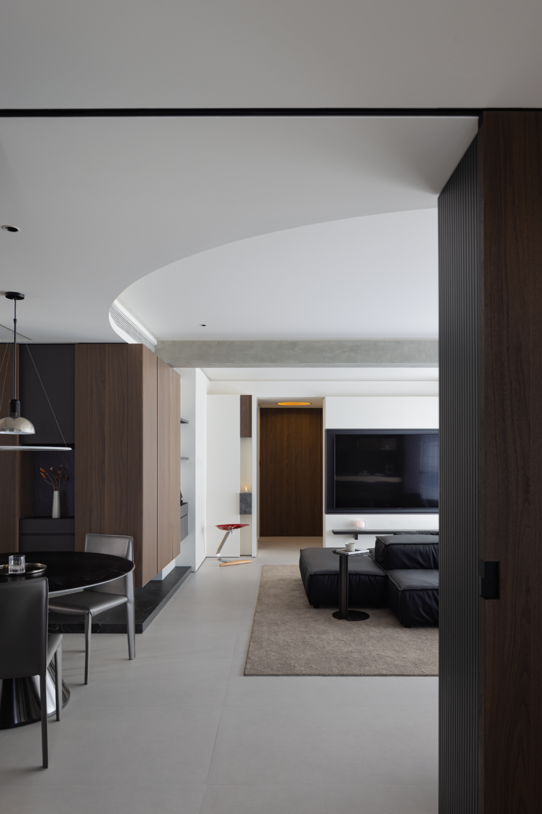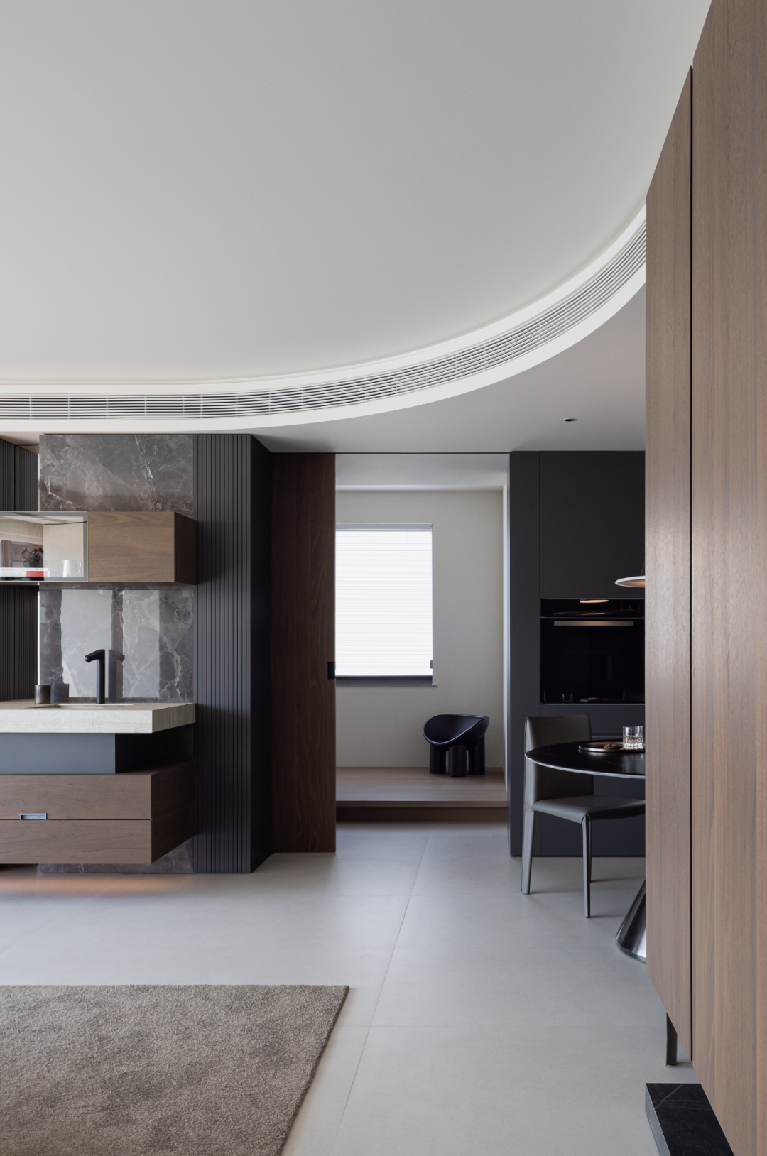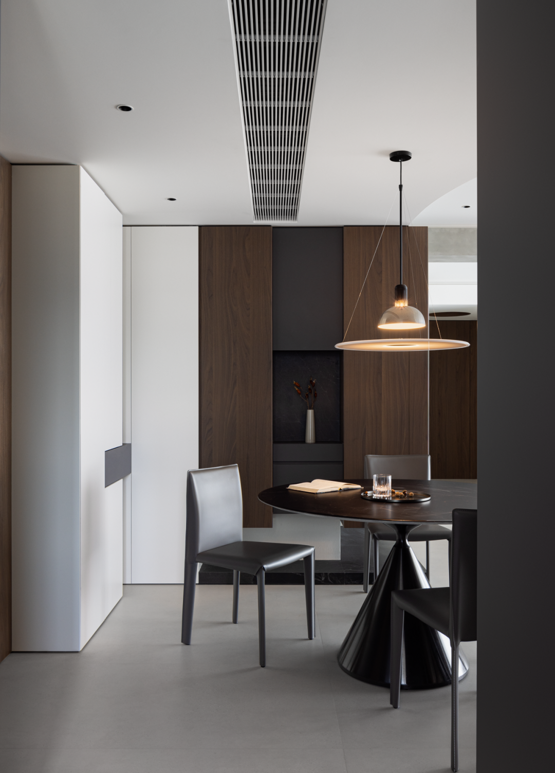 推门而入,目光自然落于左手边:一方「素白与胡桃木色交织的玄关柜」,以现代笔触勾勒出温润意境。悬挑的胡桃木柜门仿若浮于空中,下方黑石基座如墨玉流转,刚柔相济的碰撞间,暗藏精妙转折。两扇木色之间嵌着开放式壁龛,恰是绿枝斜倚、清供生辉的留白处。材质在碰撞中对话——木的呼吸、石的沉静、釉的流光,共同织就一幅「入室即安」的禅意画卷。每一处细节,都在诉说:生活之美,始于足下方寸。