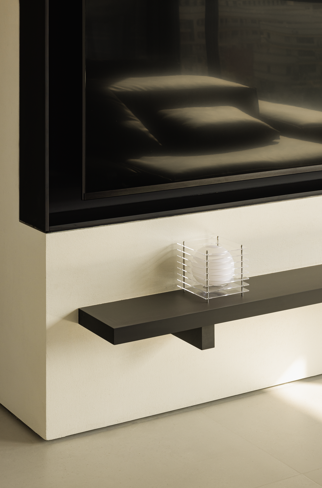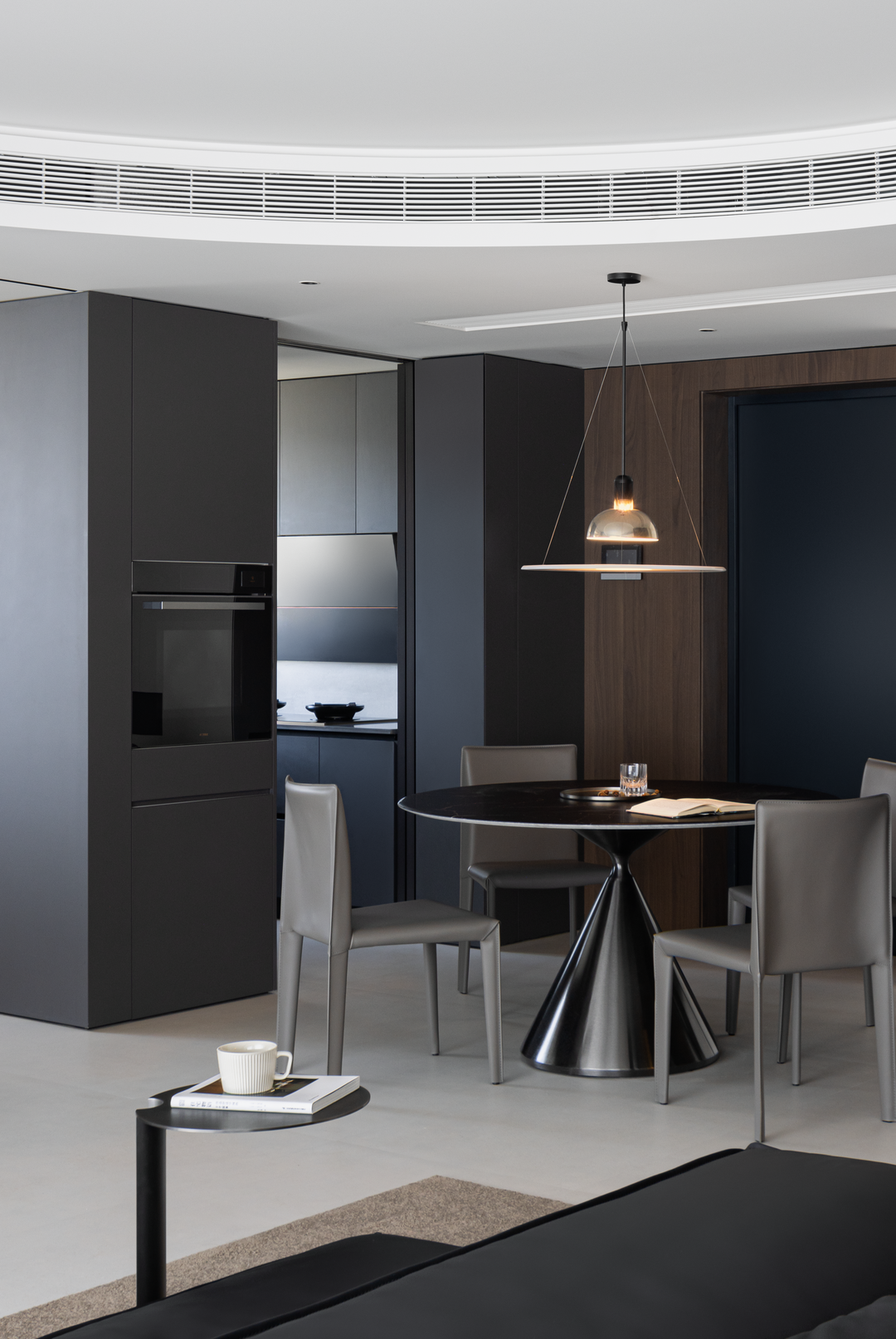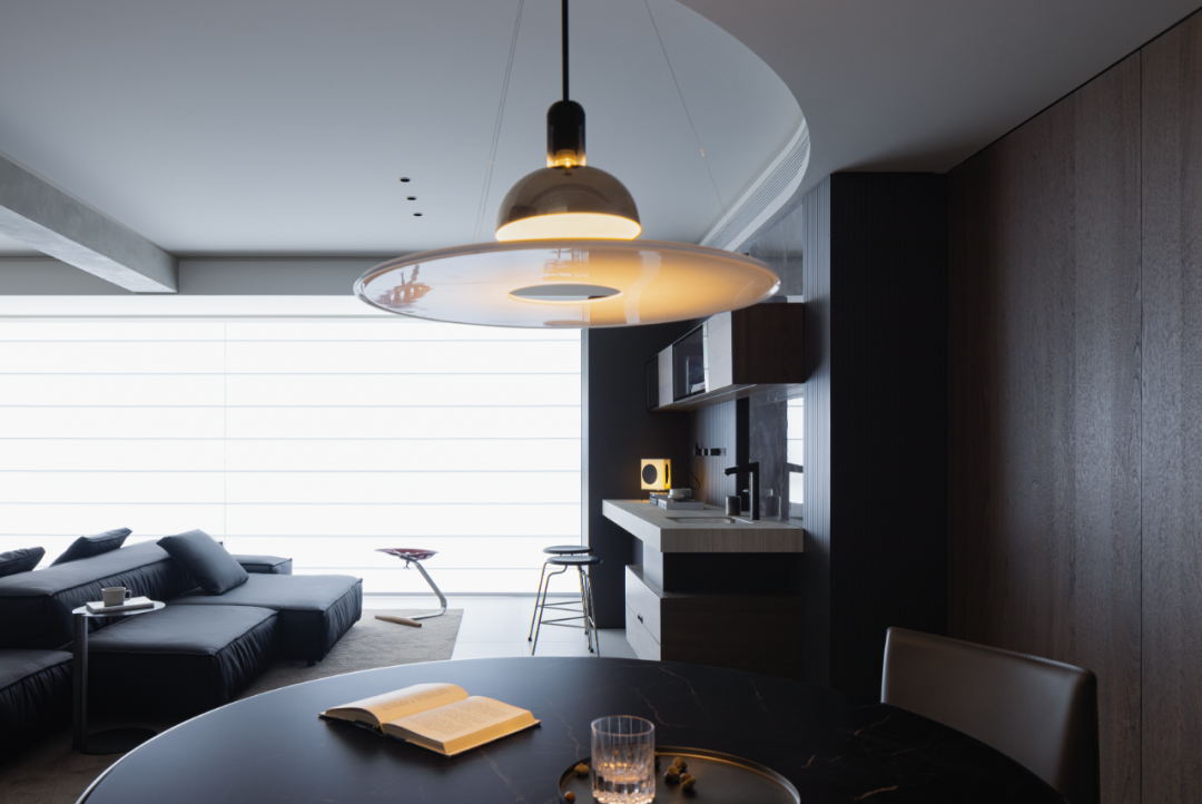 侧畔玄黑圆桌静立如砚,光釉桌面似水凝墨,倒映天光云影;锥形桌脚如笔锋收势,在虚实间划出优雅弧度。这方墨玉台案,既可陈设香器雅玩,亦能暂搁归家时褪下的月光与风尘。