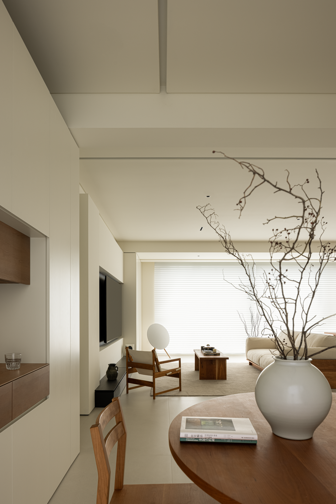 大面积的白色让整个家沉浸于明亮的氛围中,无法回避的梁柱结构皆以“藏”的方法作处理。阳台无法处理的承重墙经过柜子的掩饰,使客厅与阳台融为一体,呈现出一种和谐的建构关系。目之所及,简而明朗的色泽,似时光荏苒后安静又内敛的沉淀之美。