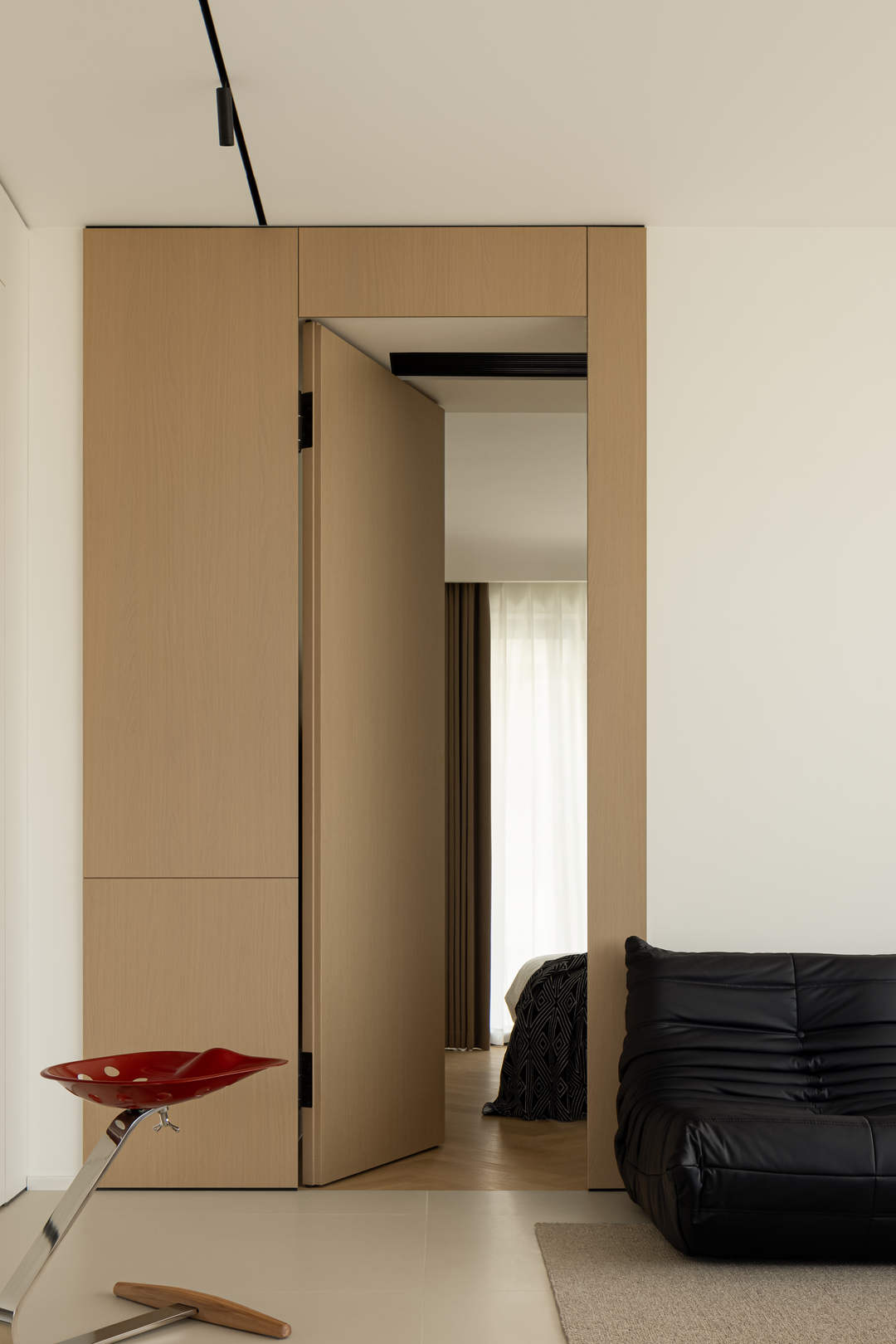 本案中用设计打破原始沉闷的户型,消除传统物理边界,以简笔串联材质与色彩的流畅度,纵横结构之势舒展留白姿态,释放更多样的当代生活方式。入户部分,集强大收纳功能的柜子和公区洗手间的门组成墙体,极具纵深感。隐去多余装饰,简洁且实用,让生活转场规整、有序。
