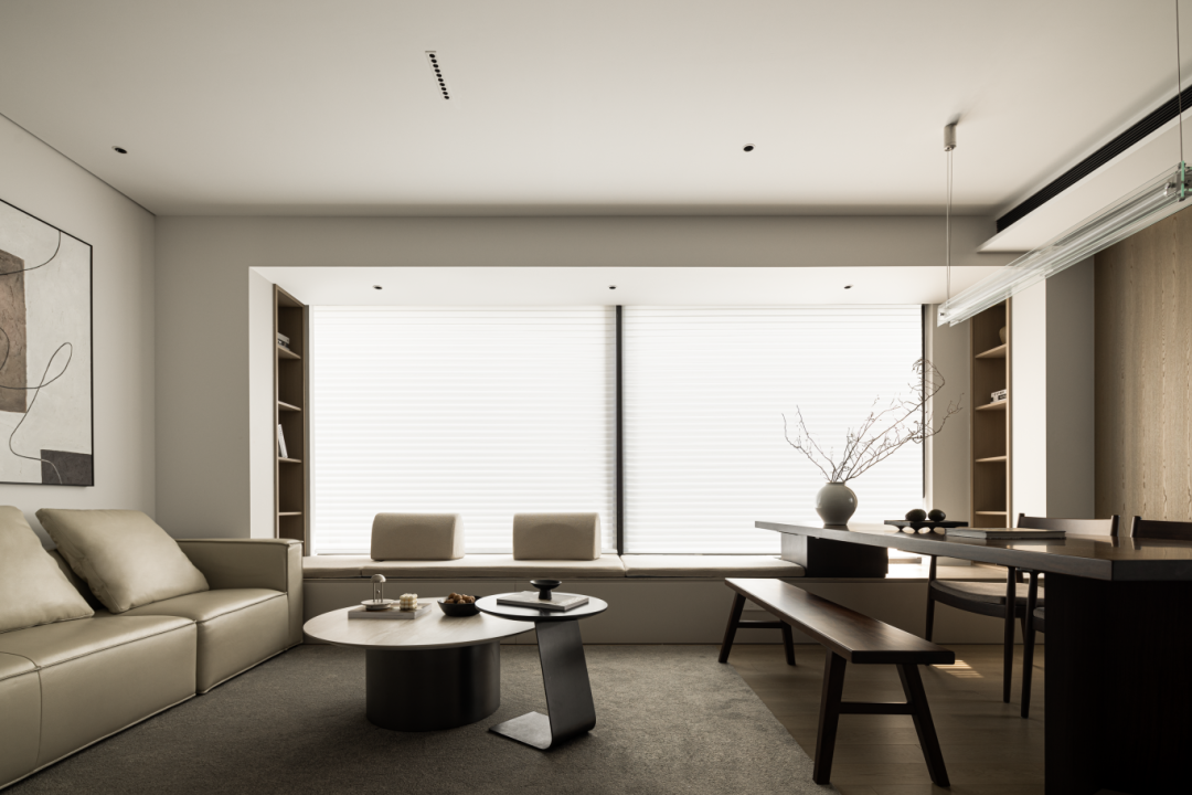 大面积的窗户让屋外的风景成为家中四时常新的艺术品,为客厅提供了充足的自然光线与通风,阳光透过窗户洒落,投射出柔和灵动的光影,演绎着现实与浪漫交织的生活场景。飘窗台面用岩板处理让视觉上更加干净自然,定制沙发垫也可作为坐凳半坐半躺此处,看书看景也是很是惬意。