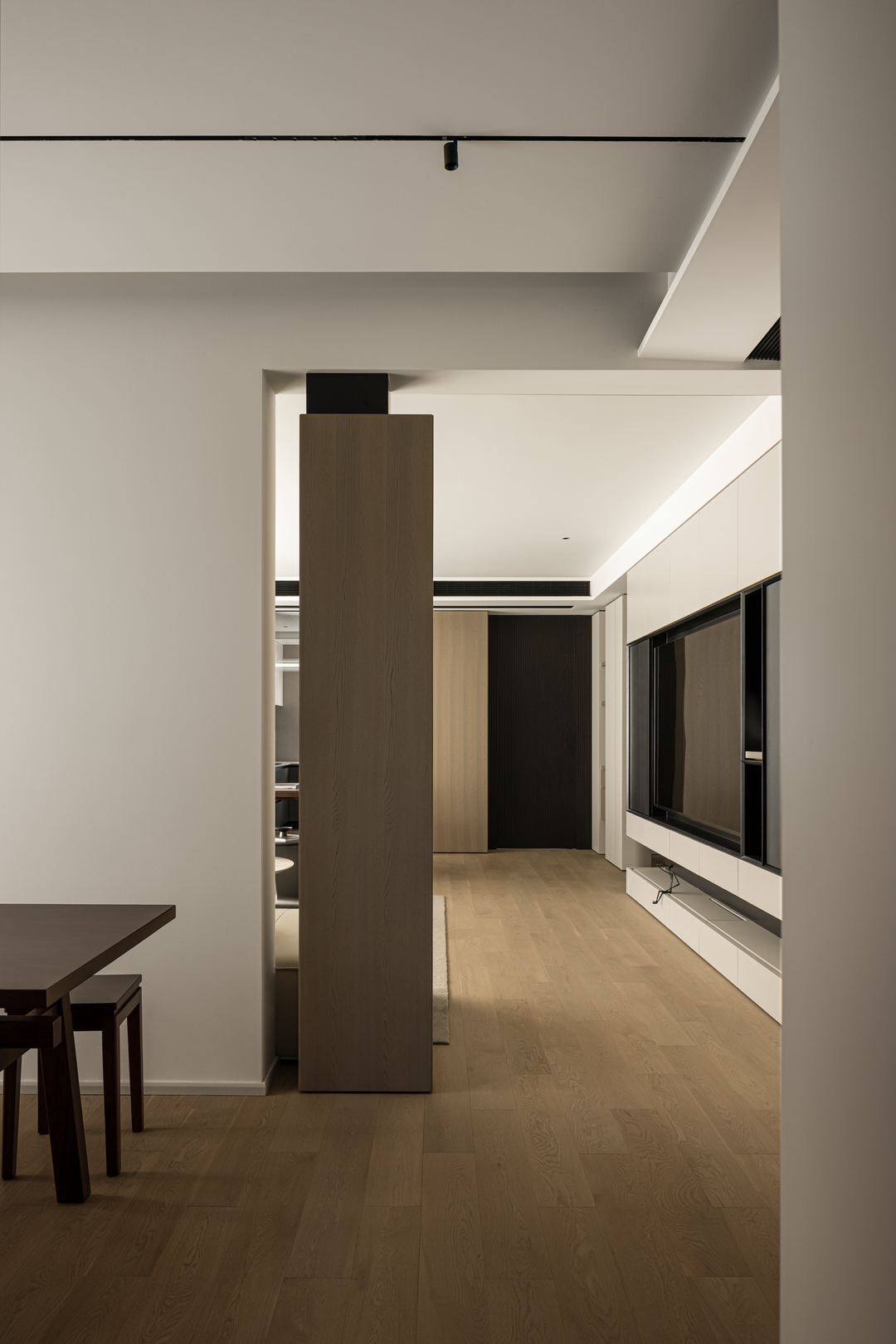 理性打磨后的空间属性有着跨越时间的力量,连接稚幼与成熟、向往与责任,成为本案两口之家生活故事在时间里的演绎。使用理性的设计语言重构空间秩序,以简洁的木、白线条构建空间骨架,虚与实、光与影,或穿插、或咬合、或透视,空间关系层层递进,传递出丰富的空间张力。