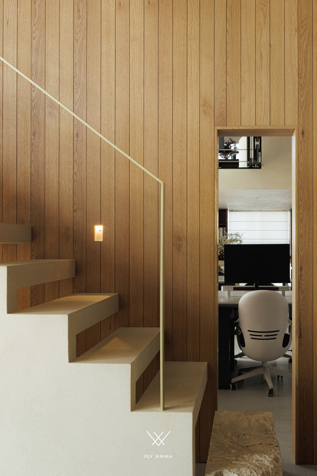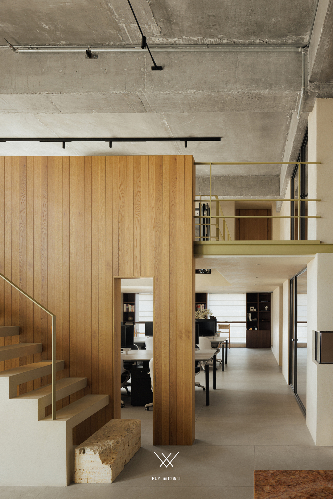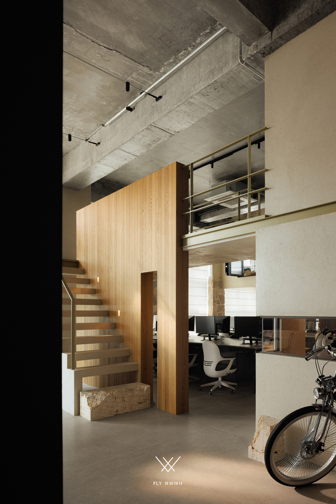 无论世事如何变迁,人追逐自然的渴望未曾减退,身在闹市,总向往着峰林之间的虫鸣鸟啼、树石水潺,一草一木都能唤醒内心的静与美。宋老师希望办公室就是具备这种属性的空间,让人感受到平和与自由,拉近身之所在与心之向往的距离。采集山石林木元素应用于室内,顶面铲掉白灰保留清水混凝土质感,空间散发着随性、原始、自然的气息,让内心寻得一份归属感。空间内自然的曲调悠扬,也有着人文的细吟。