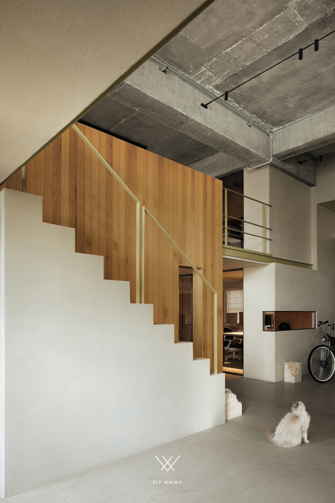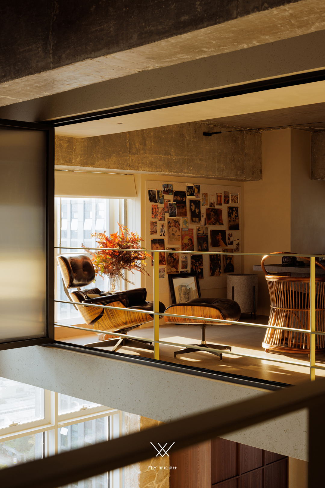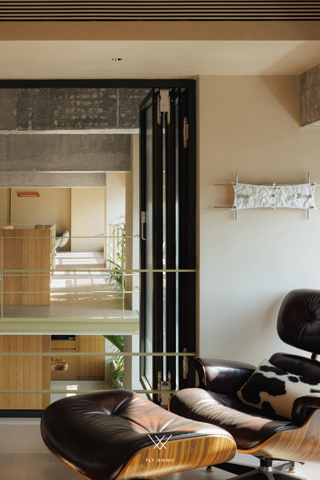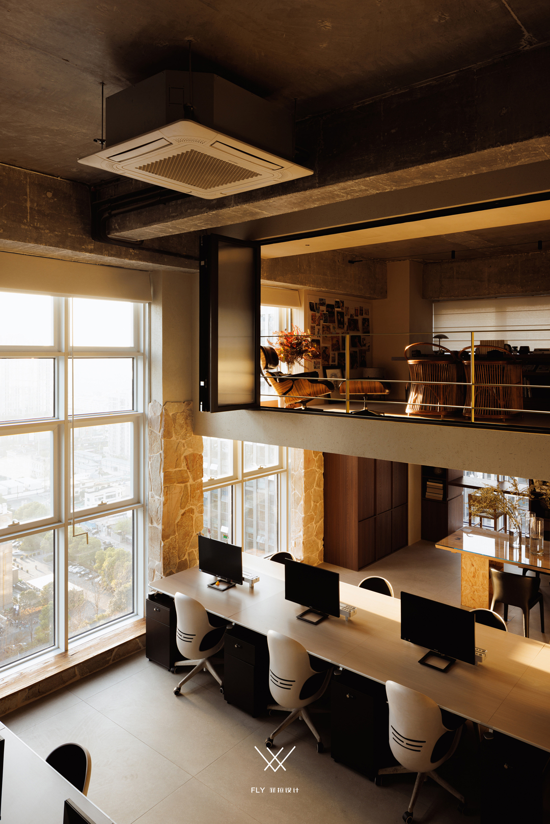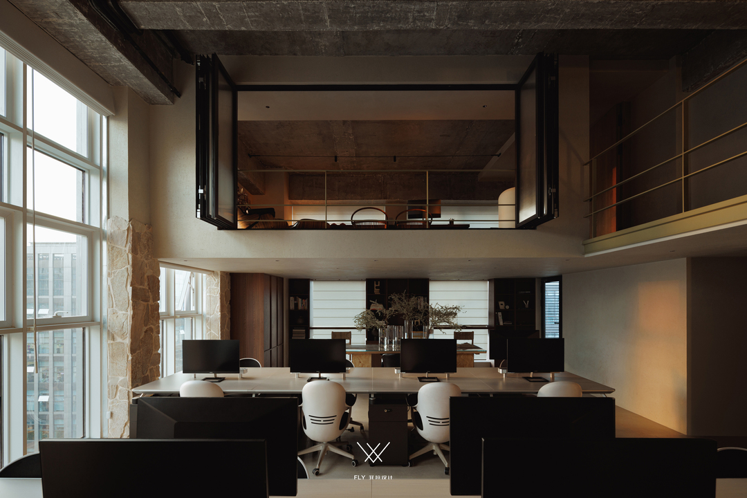 办公区上方宋老师办公室一组折叠窗将独立性空间变的更加灵活,即便是不同楼层也可以和团队伙伴进行无障碍互动,需要时又可随时关闭保持相对私密、安静独立的状态。