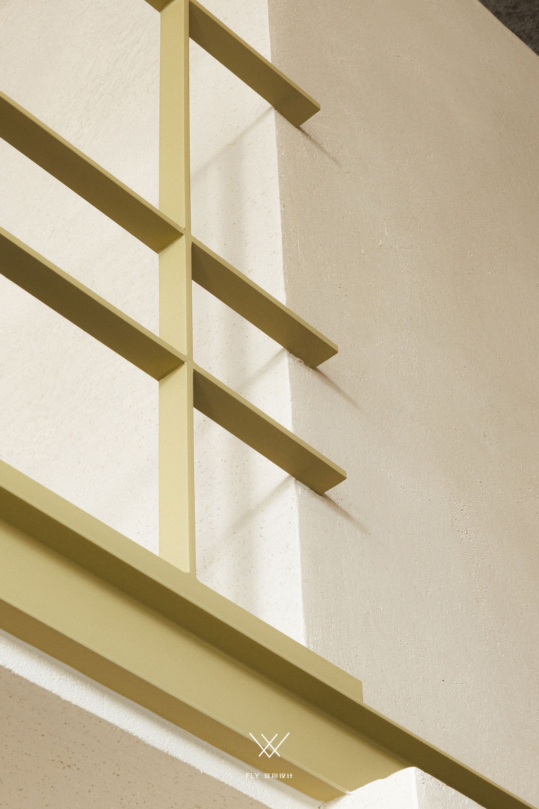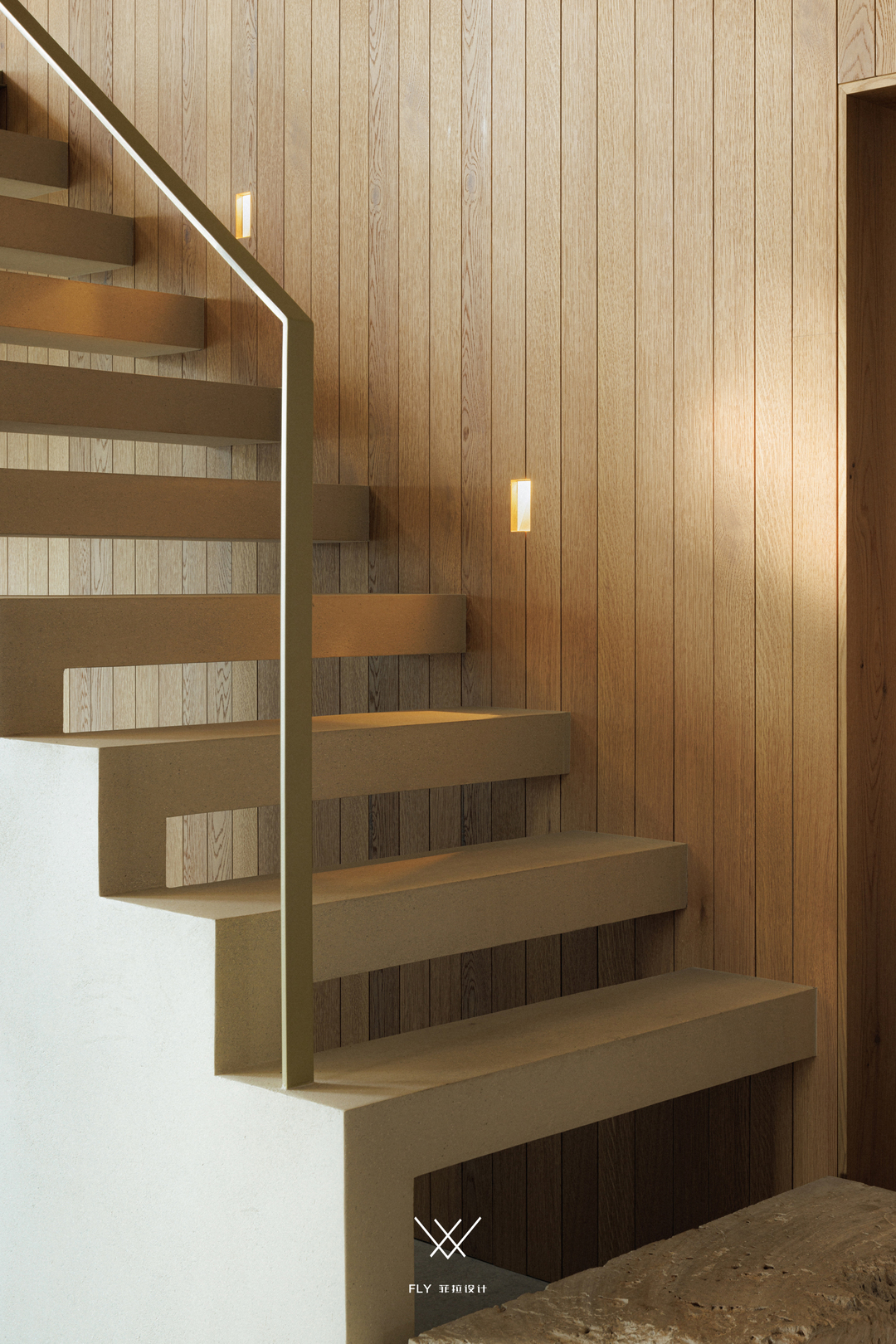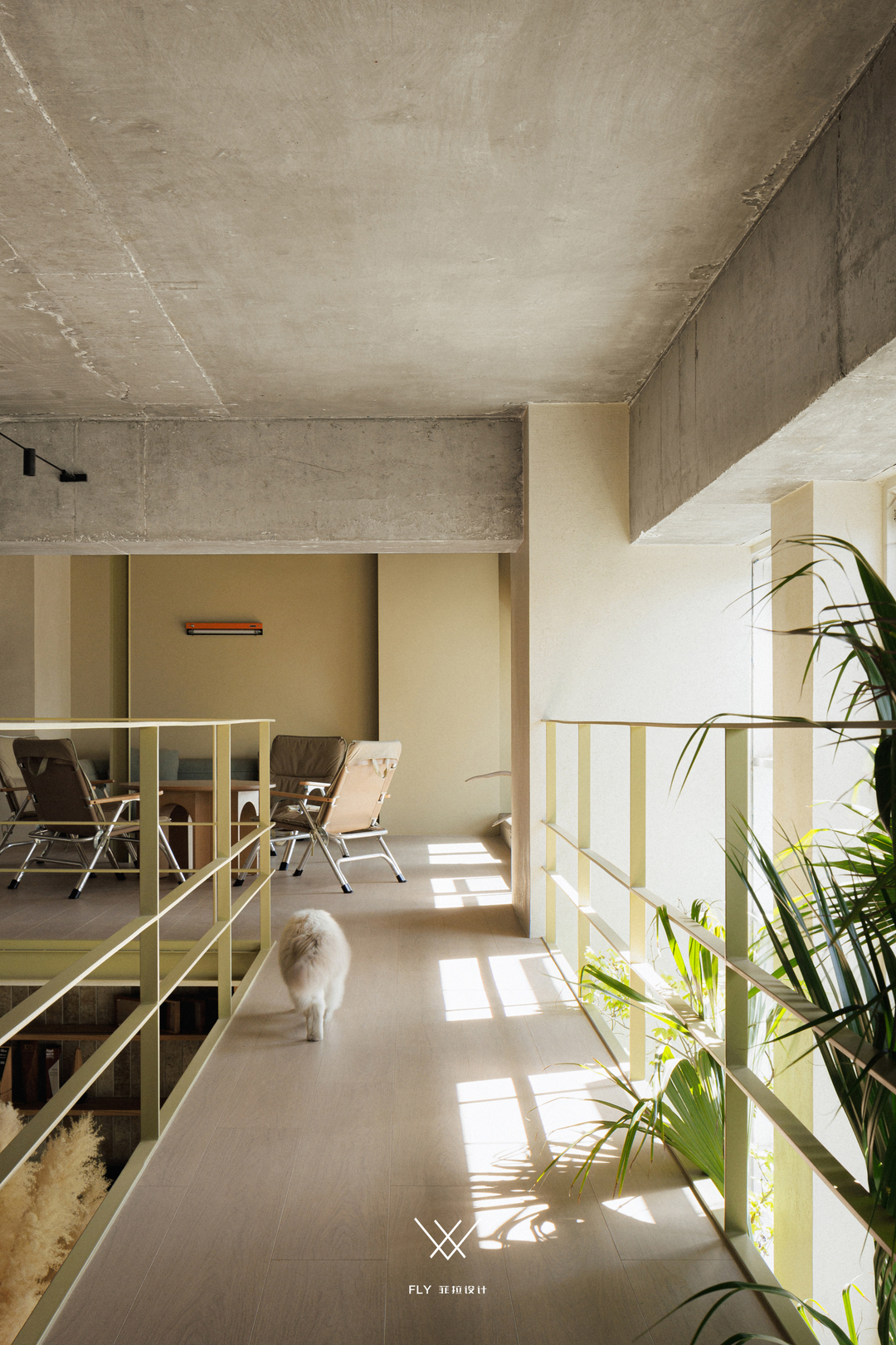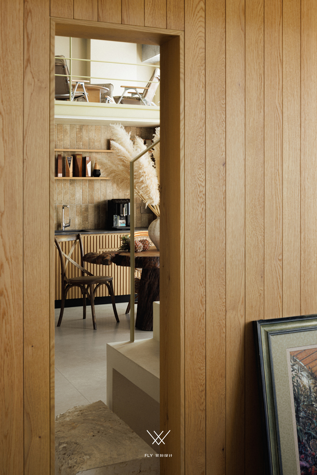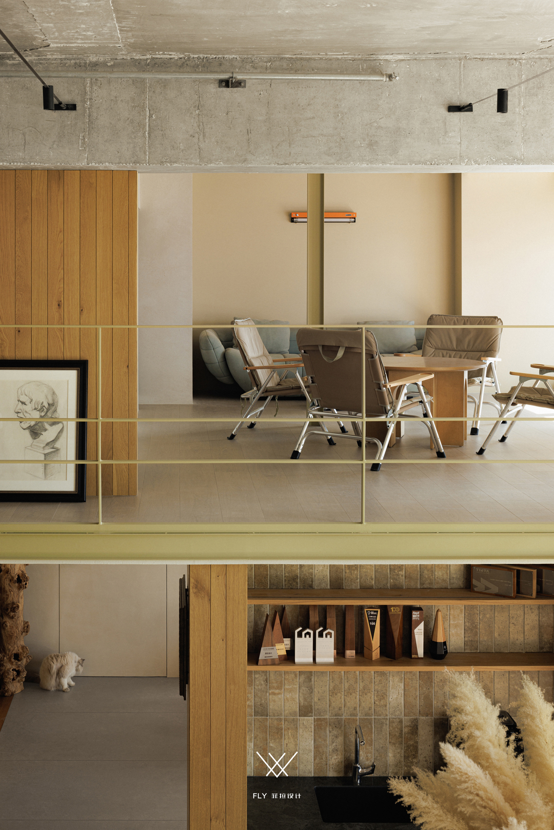 大厅是入室之后直面的第一空间,亦是第一印象,挑空处理塑造开阔大气的空间感,同时让两层空间有着很好的即时互动,大厅临窗造景山石作配,游鱼绿野映入眸中,老树桩茶几、藤椅,自然同时间作用于事物的痕迹、阶段变得如此美妙、生趣,给予人慰藉。感叹自然与人文魅力交织的同时,大厅亦有着日常生活的从容陈列,水吧台、内嵌冰箱、嵌饮机、咖啡机,满足伙伴们的日常需求,于生活的细节传递温暖与贴切。