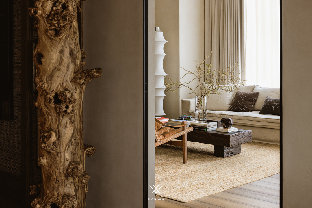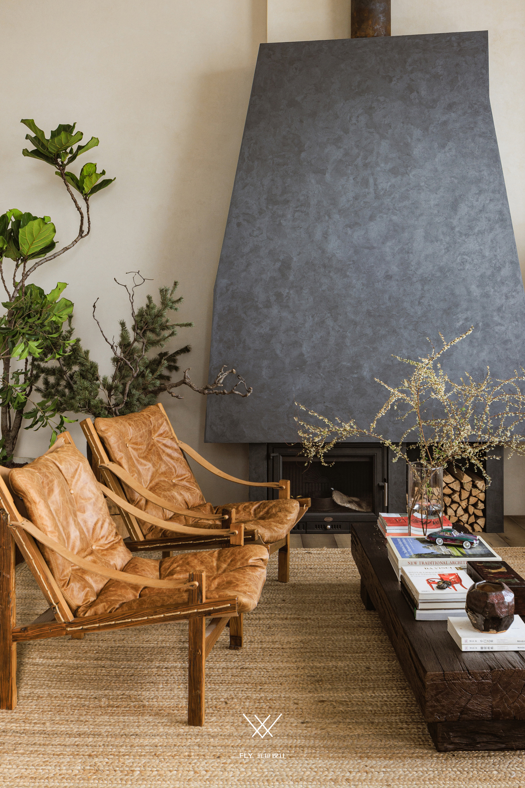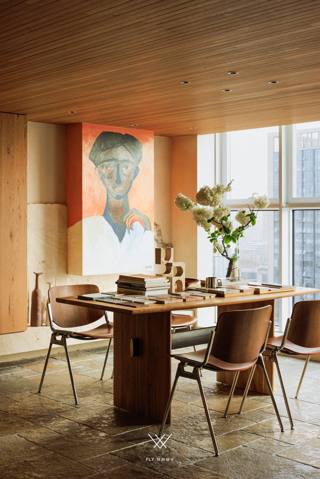 更具野性美的当属人物挂画背后的石头,开矿放料打下去的炮孔形成了它边缘的竖条形态,被扔在市场的一角受雨水侵蚀发黑,是偶然、是冥冥注定,让偏爱具有时间痕迹物品的宋老师遇见了它,废弃的石料在新的场域里散发不可替代的光彩。正因为它的不完美、它的瑕疵、让过分美化、过分理想化的布置变得不再生趣,有不协调、有残缺,传递着野性的生命力、生生不息。