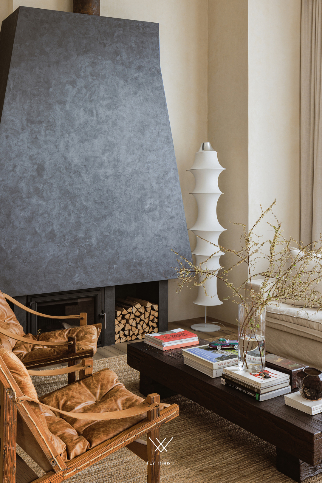 关于壁炉的来源,它的灵感来自于一个九岁的小小创作家——宋老师的女儿·可可。在最初设计期间宋老师总觉得空间里差了些味道,在家构思到深夜转头睡去,手稿堆满书桌,第二天早上发现在手稿上多了一个形状,可可的画就像是一把钥匙打开了他思路的大门,看着不规则的轮廓涌起一股灵感,宋老师以女儿画的形状为基础进行深化,有了如今别饶风致的壁炉造型,空间自此也有了它更丰沛的故事与情感。