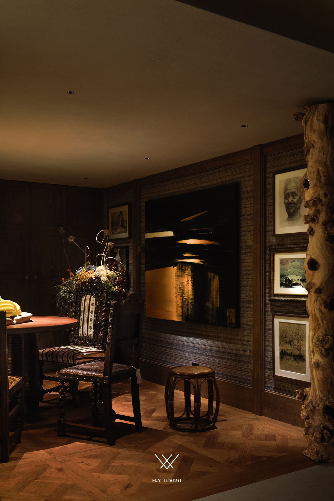 三把座椅是淘自于19c的欧洲老家具,还有一部分老家具、椅子是民国时期的老物件,同时做了复杂的欧式雕花与整个空间做融合碰撞。复古地板、旧木饰面、浓郁复古的空间色调,富有历史与人文的家具摆件散发着厚重的故事感。