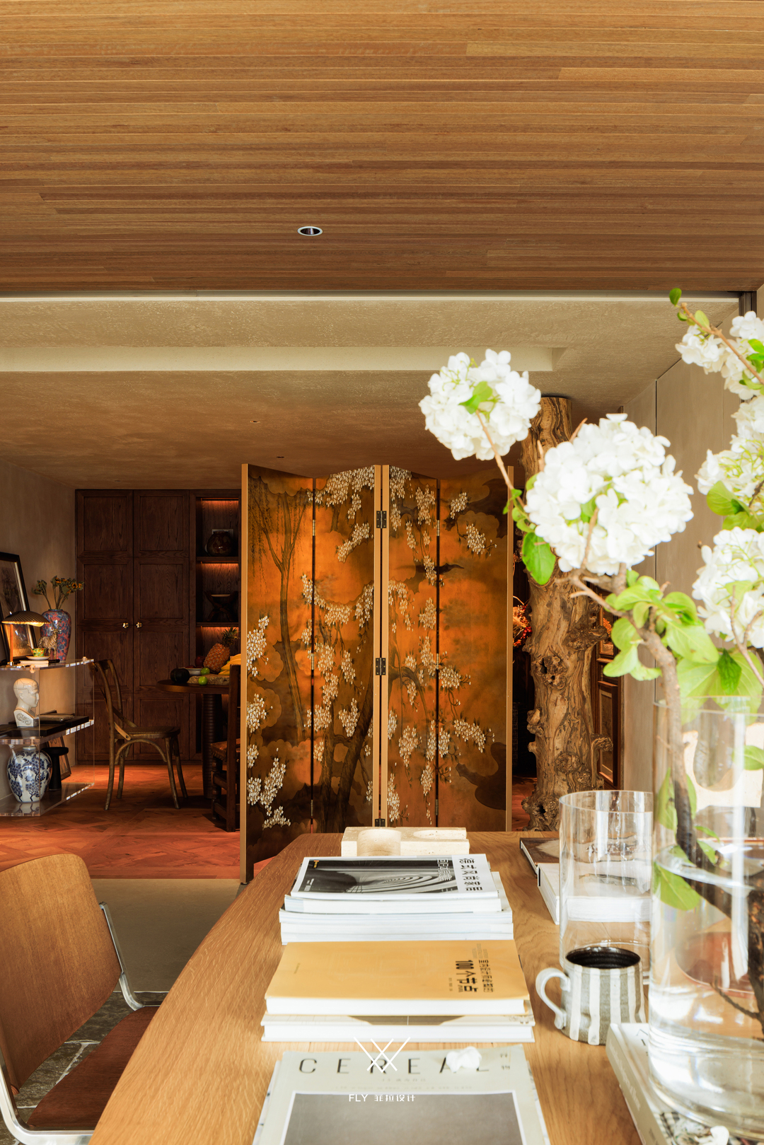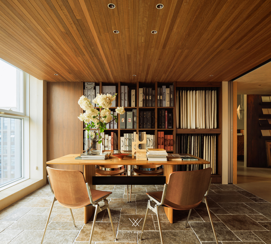 半开放式的自然原木风洽谈室,吊顶柚木木条本身的线条感打造视感错觉,拉长空间尺度,极富张力与表现欲。