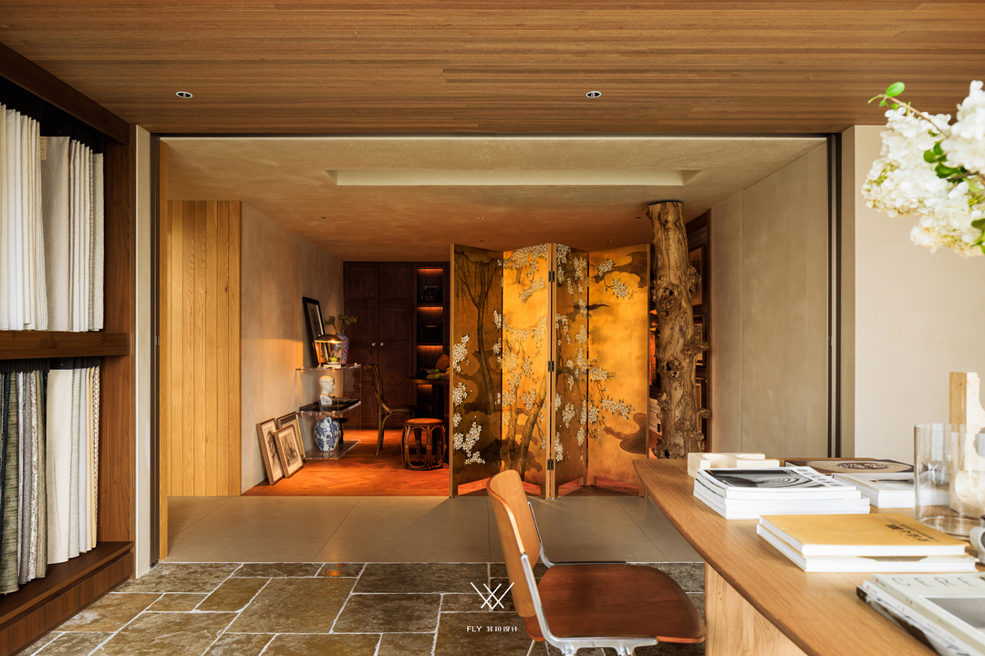 开放式的洽谈区仅由一棵表面嶙峋的老树桩、一台中古漆画金箔屏风即为空间笼罩了域感,这个空间无窗自然光短缺相对昏暗,利用它的空间特质,与海派文化的老上海复古腔调恰恰应景。