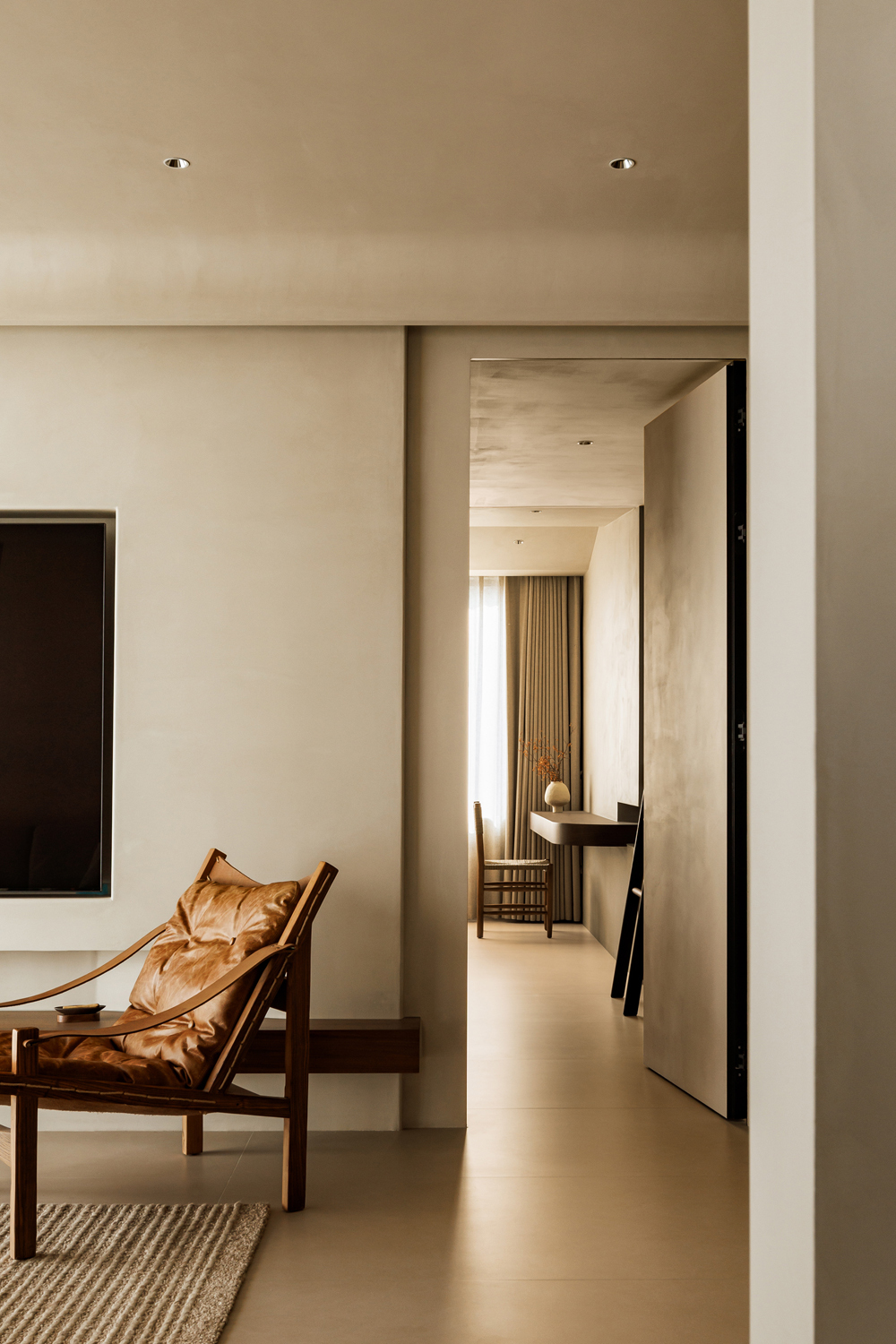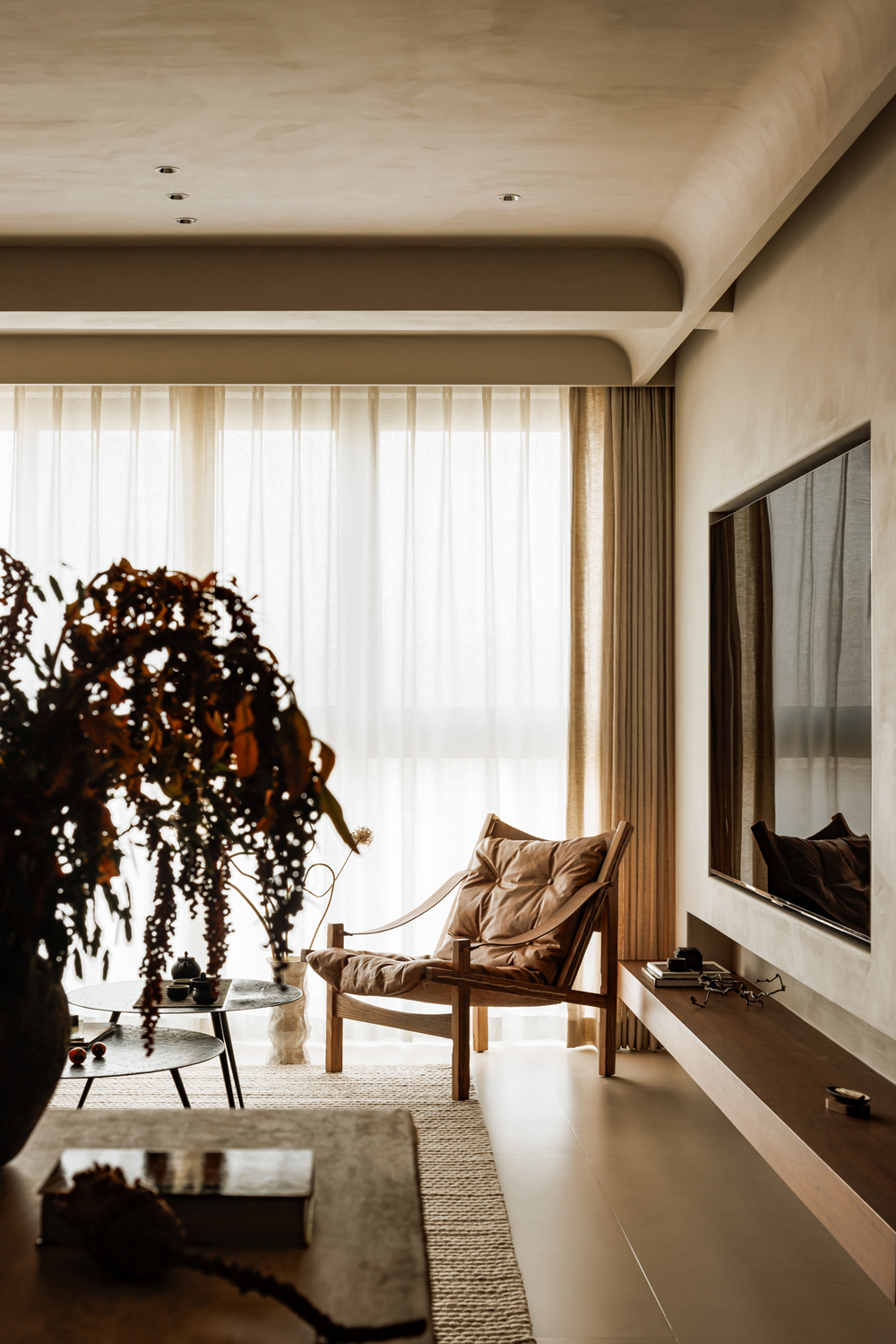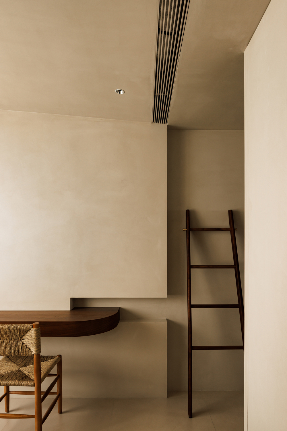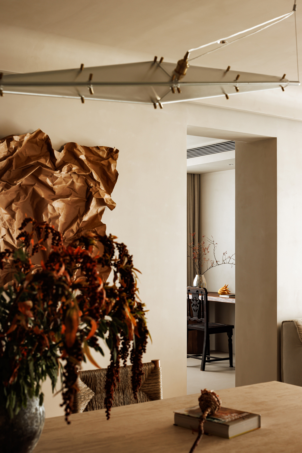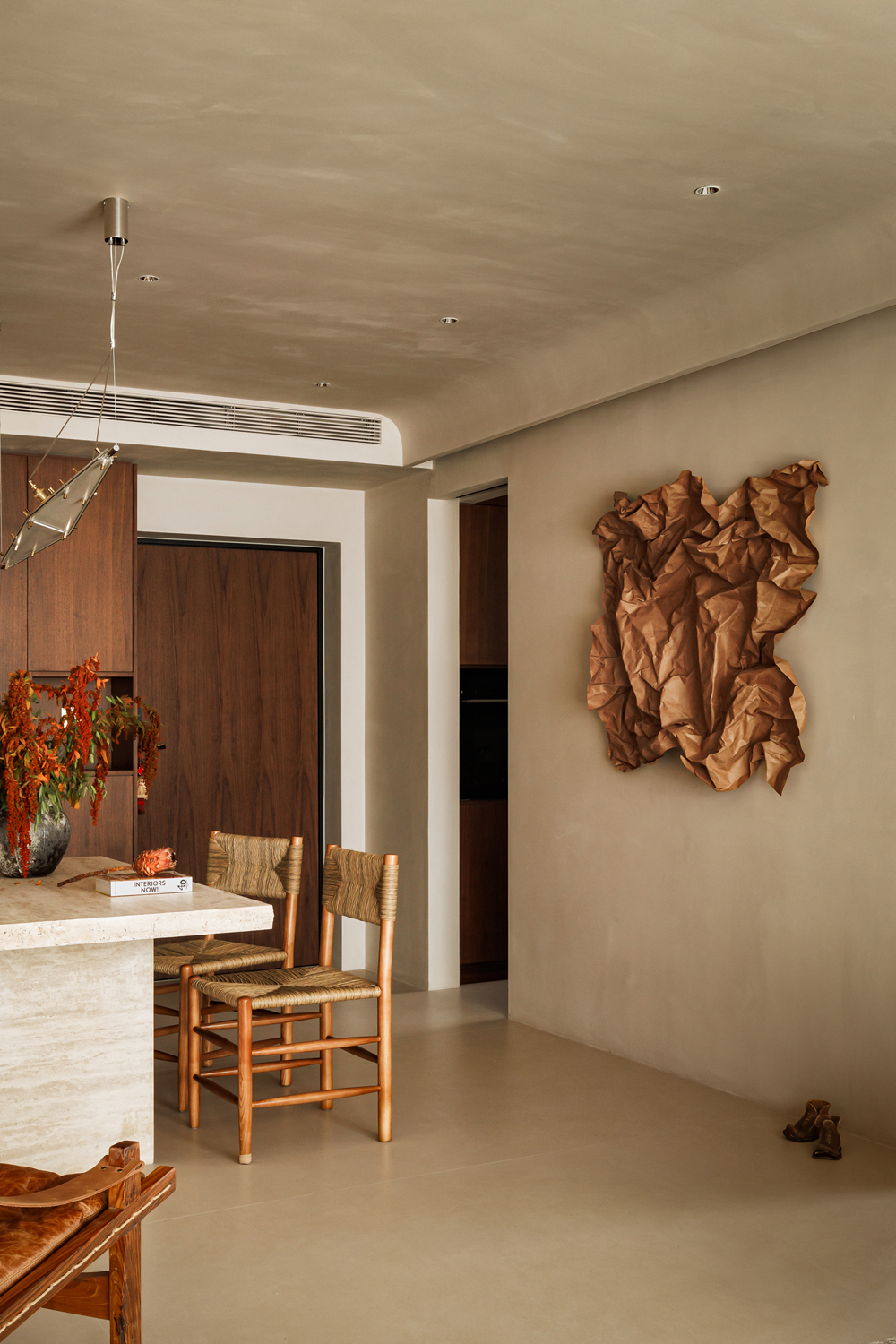 融入的残韵感洞石、裂纹式茶几、实木皮躺椅,原木老书桌......,坚硬的空间有着柔软的温度,如同居者内心的笃定,不乏柔软的一面恰似独处时偶尔泛起的温情。