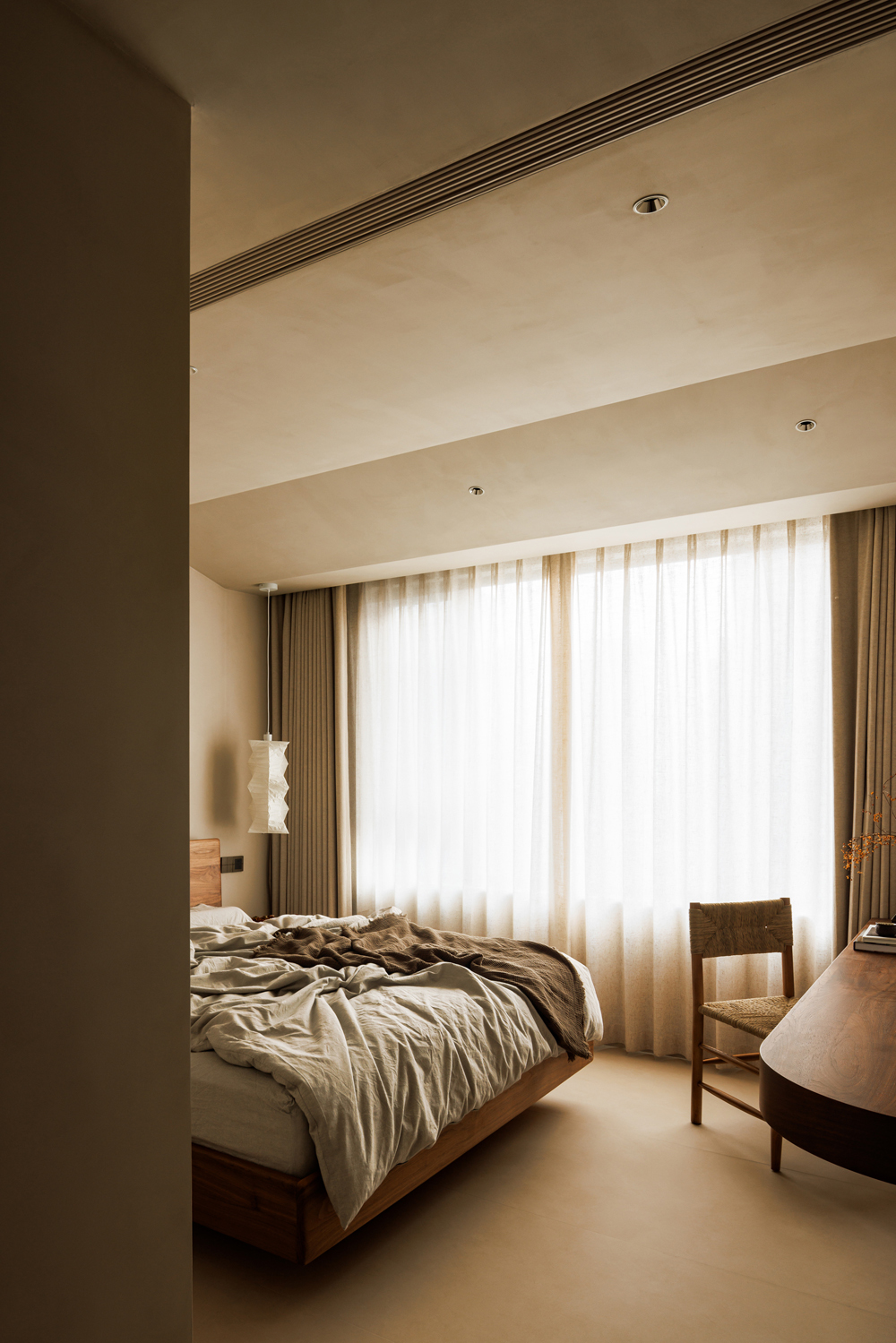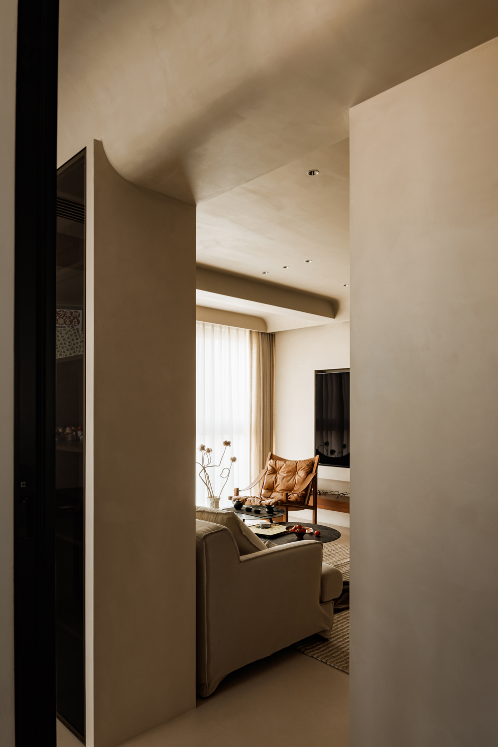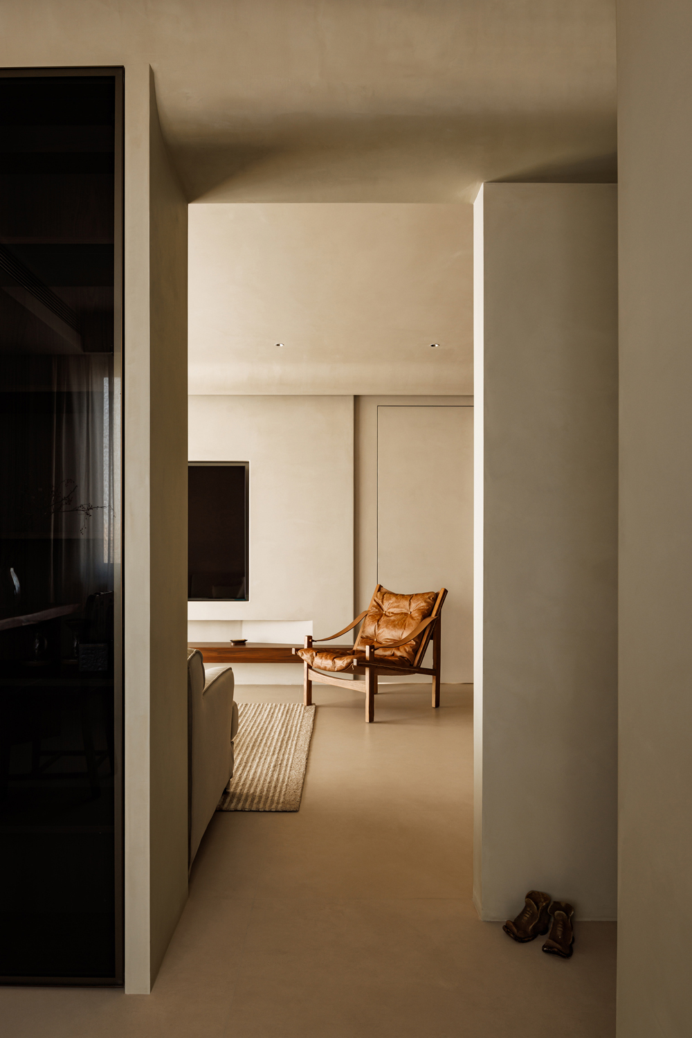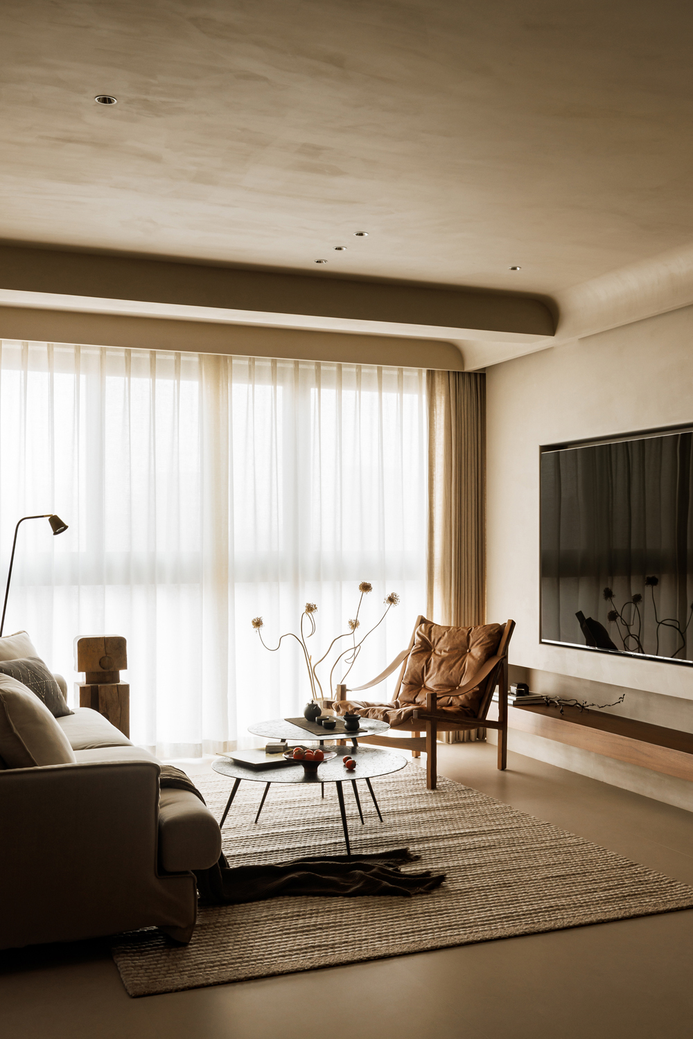 融入的残韵感洞石、裂纹式茶几、实木皮躺椅,原木老书桌......,坚硬的空间有着柔软的温度,如同居者内心的笃定,不乏柔软的一面恰似独处时偶尔泛起的温情。