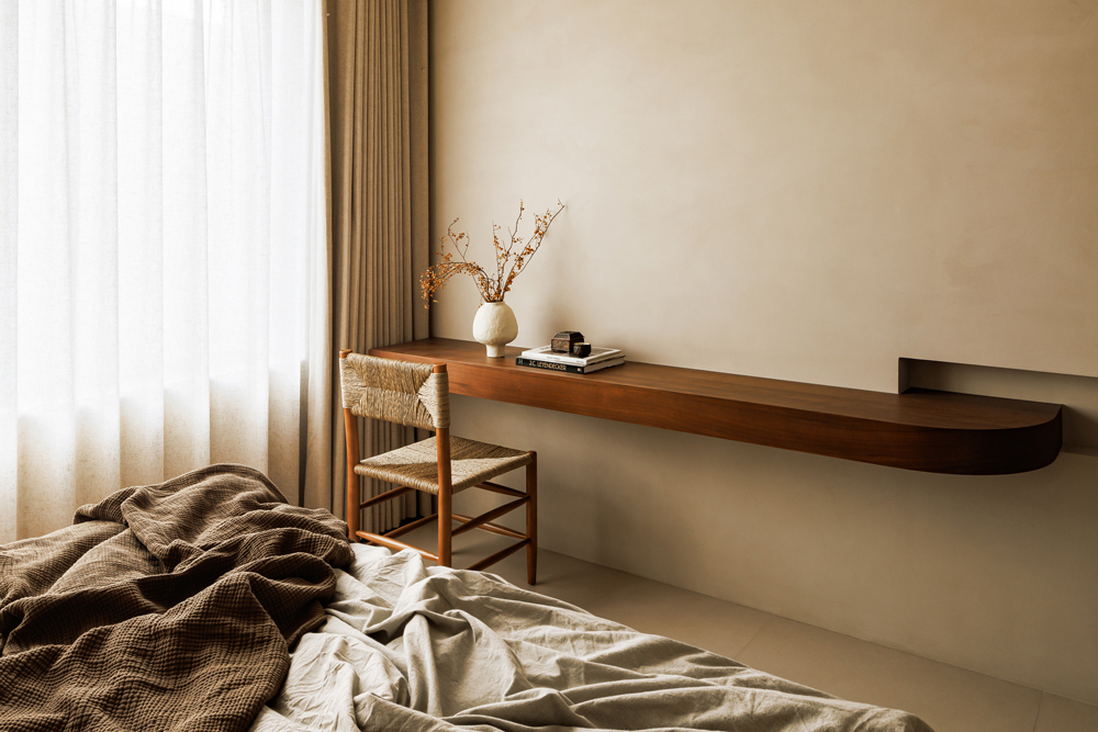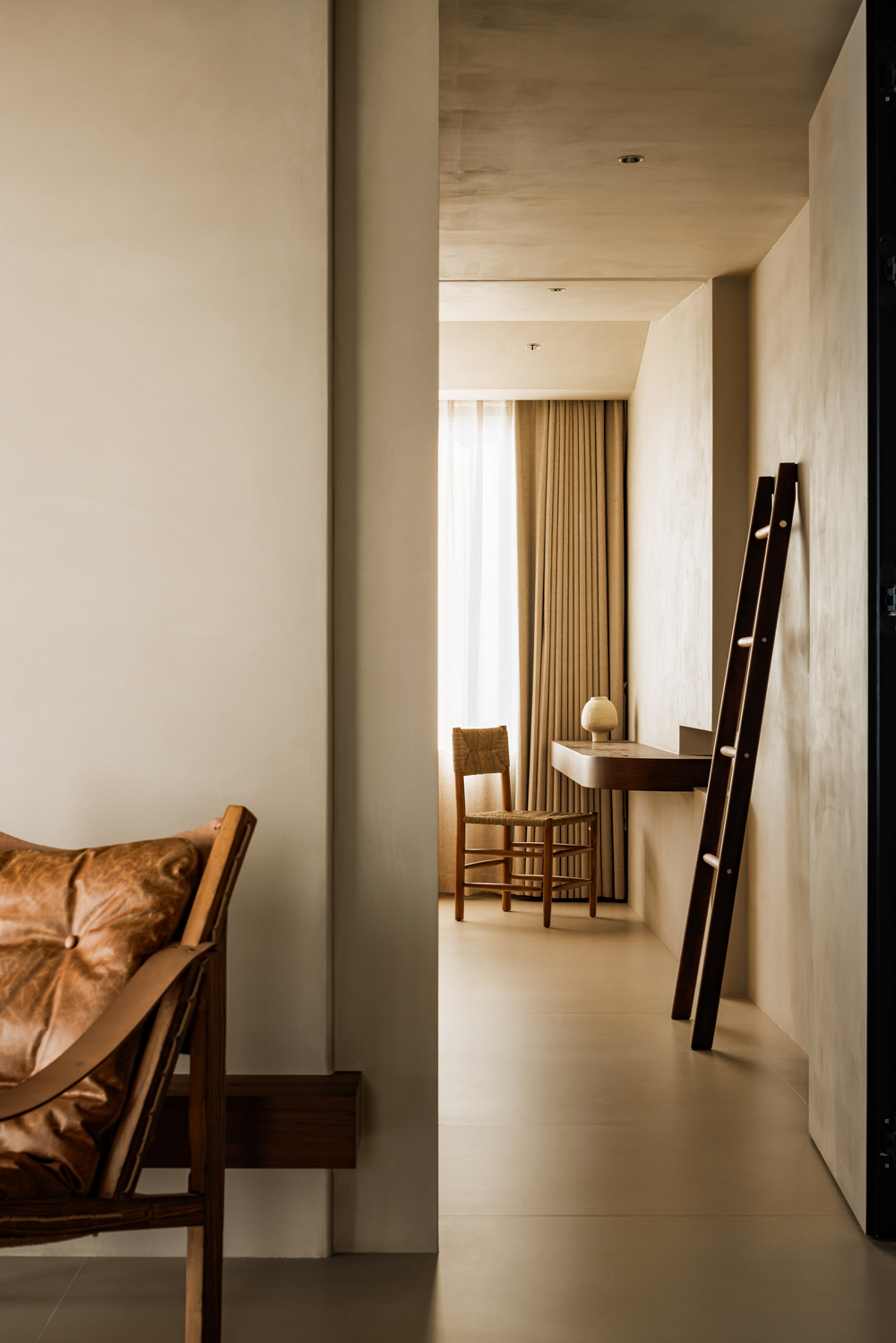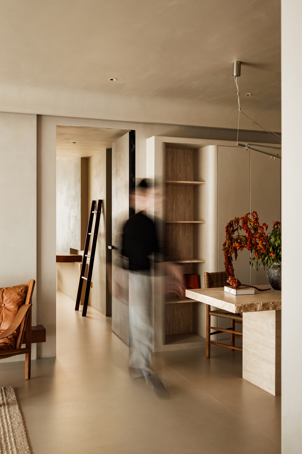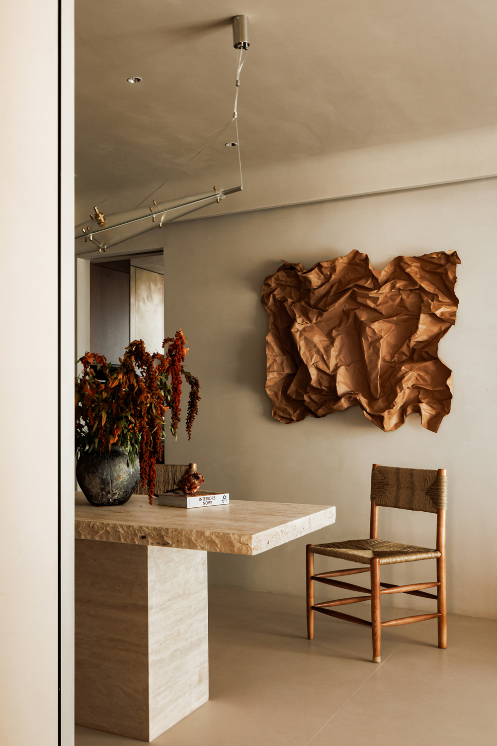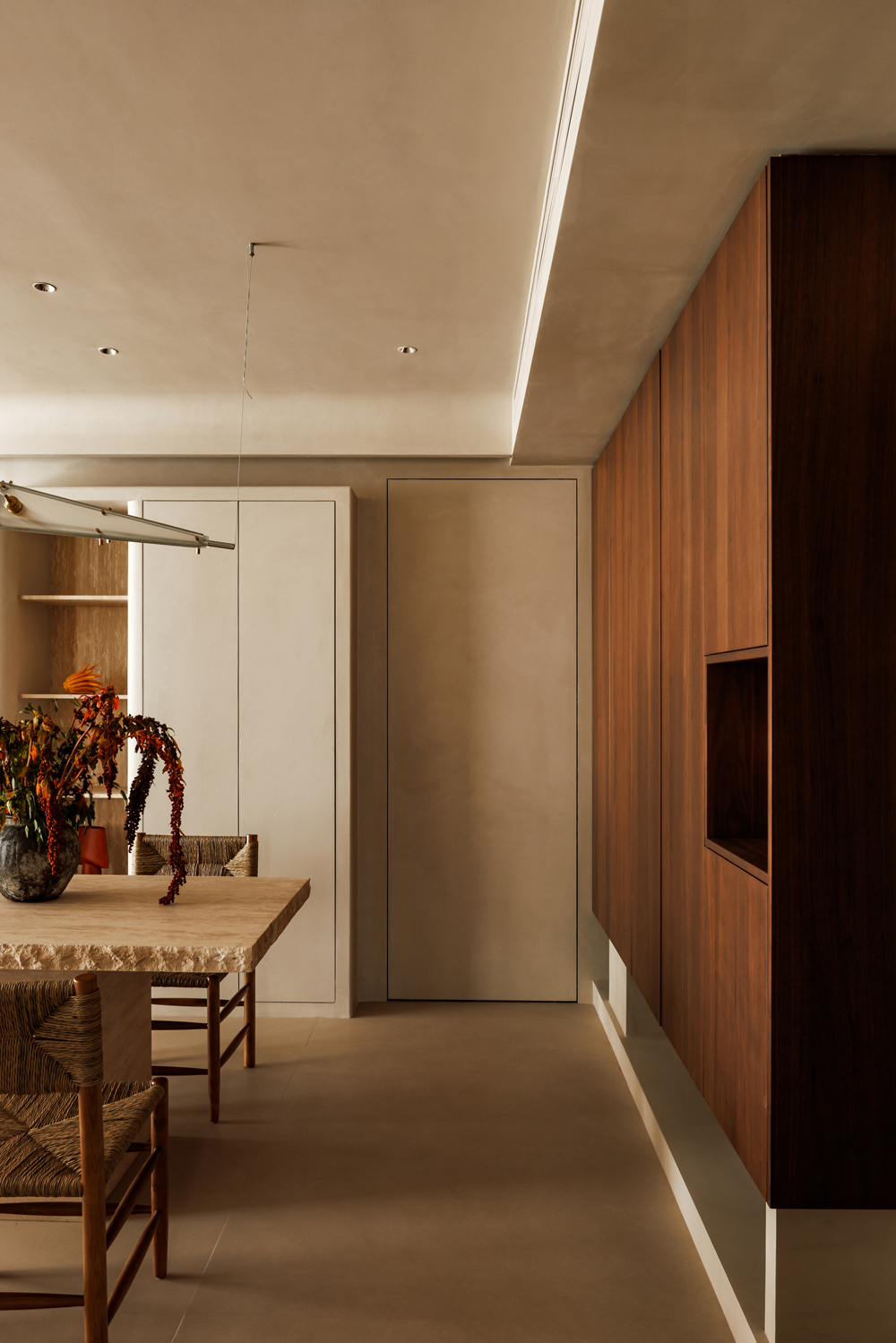 融入的残韵感洞石、裂纹式茶几、实木皮躺椅,原木老书桌......,坚硬的空间有着柔软的温度,如同居者内心的笃定,不乏柔软的一面恰似独处时偶尔泛起的温情。