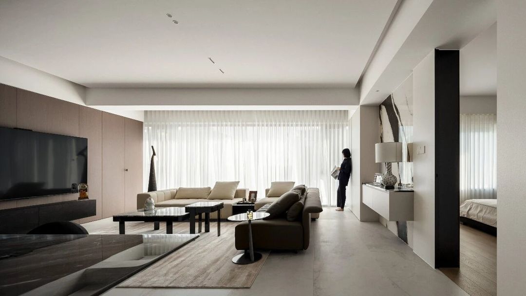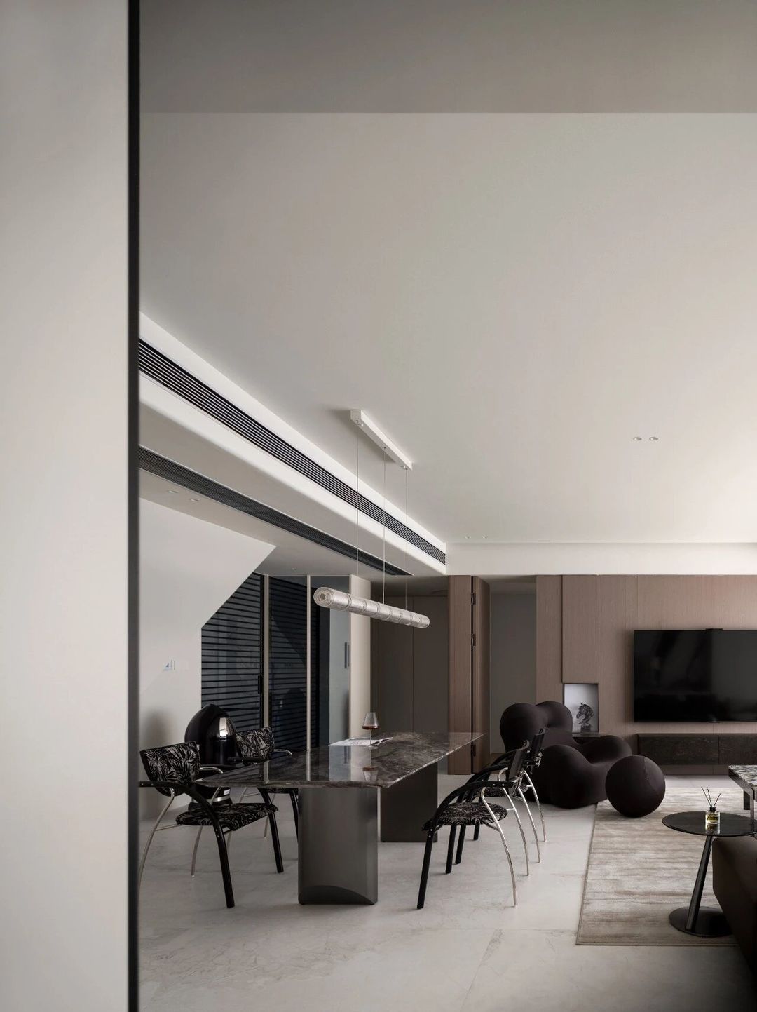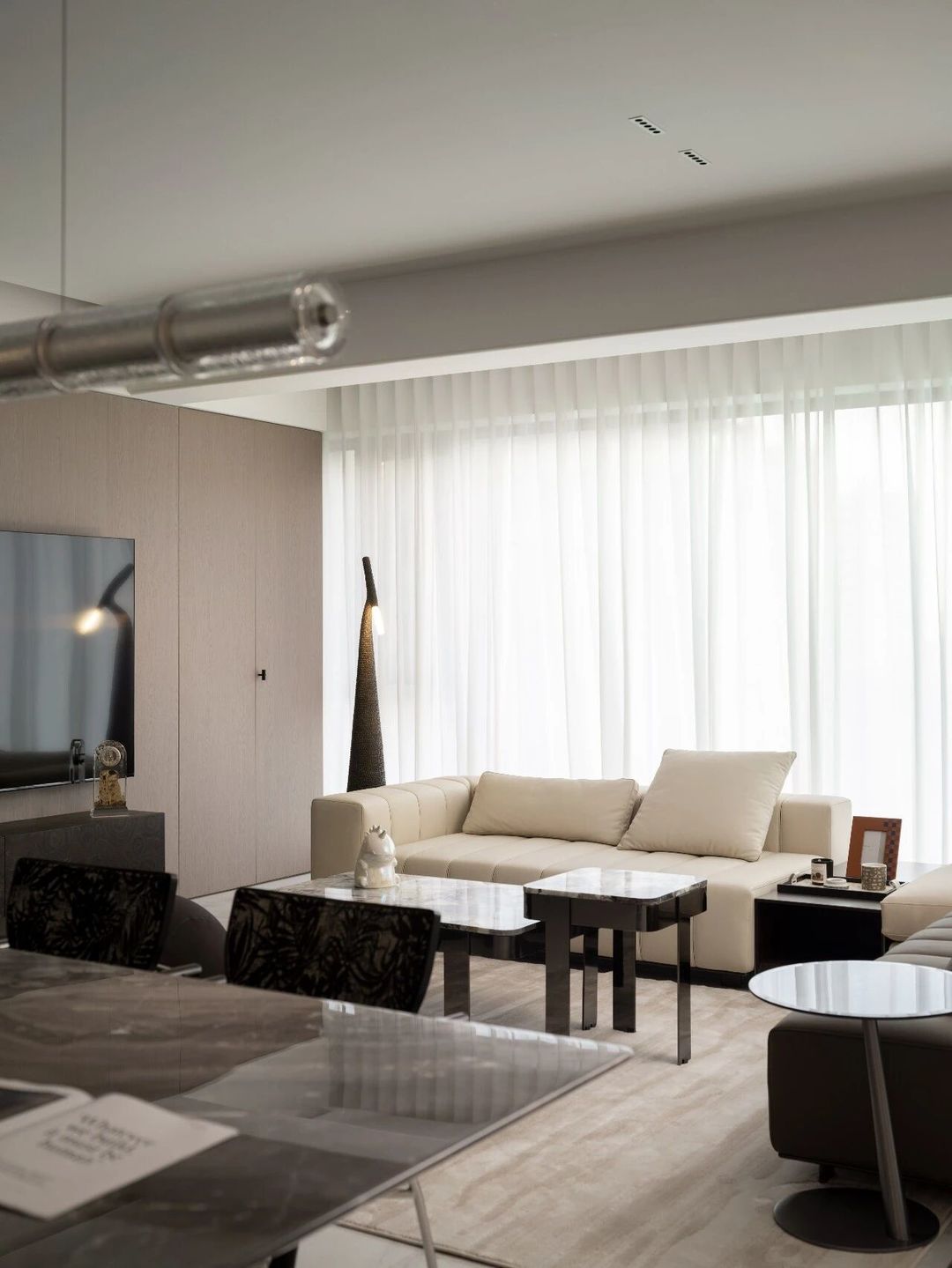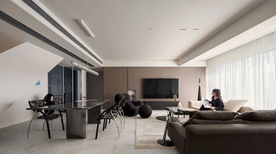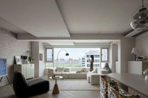 整个客厅以现代简约风为基调,再搭配一些原木色元素,让家显得有温度。地面通铺柔光砖,墙面通刷艺术涂料,让整个家显得更有高级感和质感。