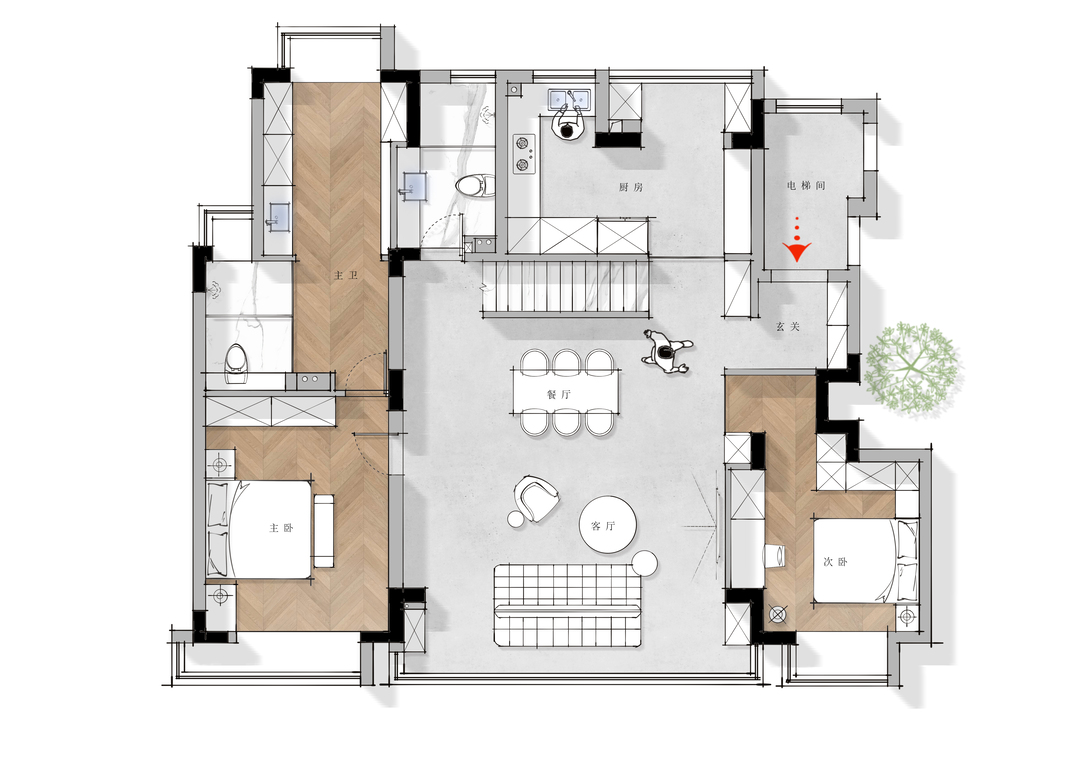 业主的闺蜜是我们七年前装修的客户,通过老客户介绍认识我们,所以信任感很强,要求我们全权委托代管理,从前期的设计,中期的施工,后期的软装搭配,大到顶楼重新做防水施工,小到一个垃圾桶、纸巾盒、四件套,都是由我们负责搭配、采购、现场摆场。