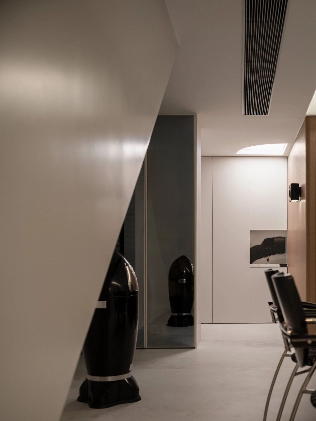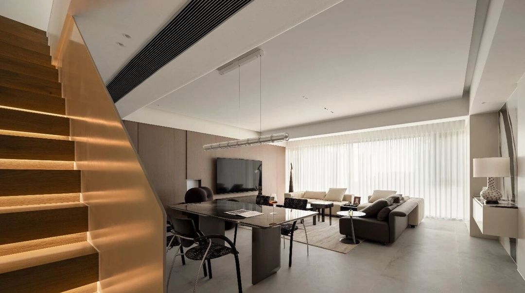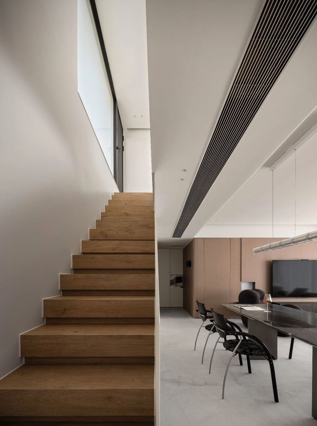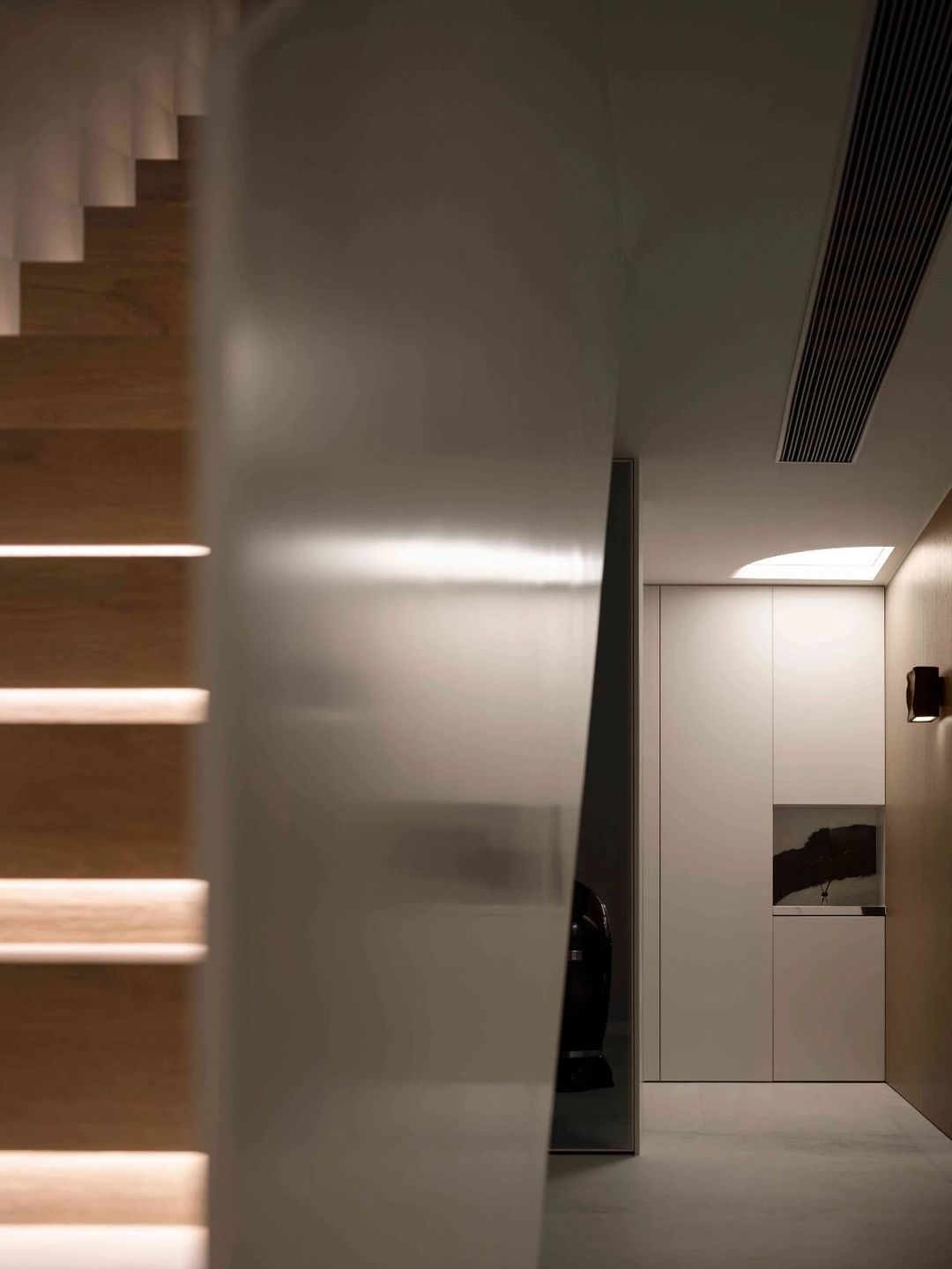 楼梯采用的是钢板设计,空间更加简洁。楼梯踏步的灯光设计都是感应的,使用起来更加人性化。