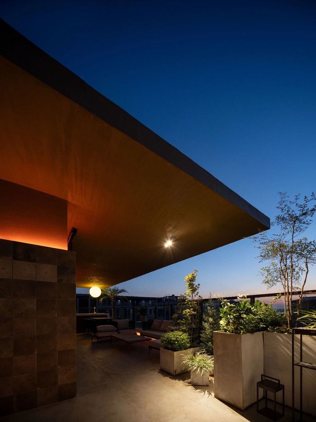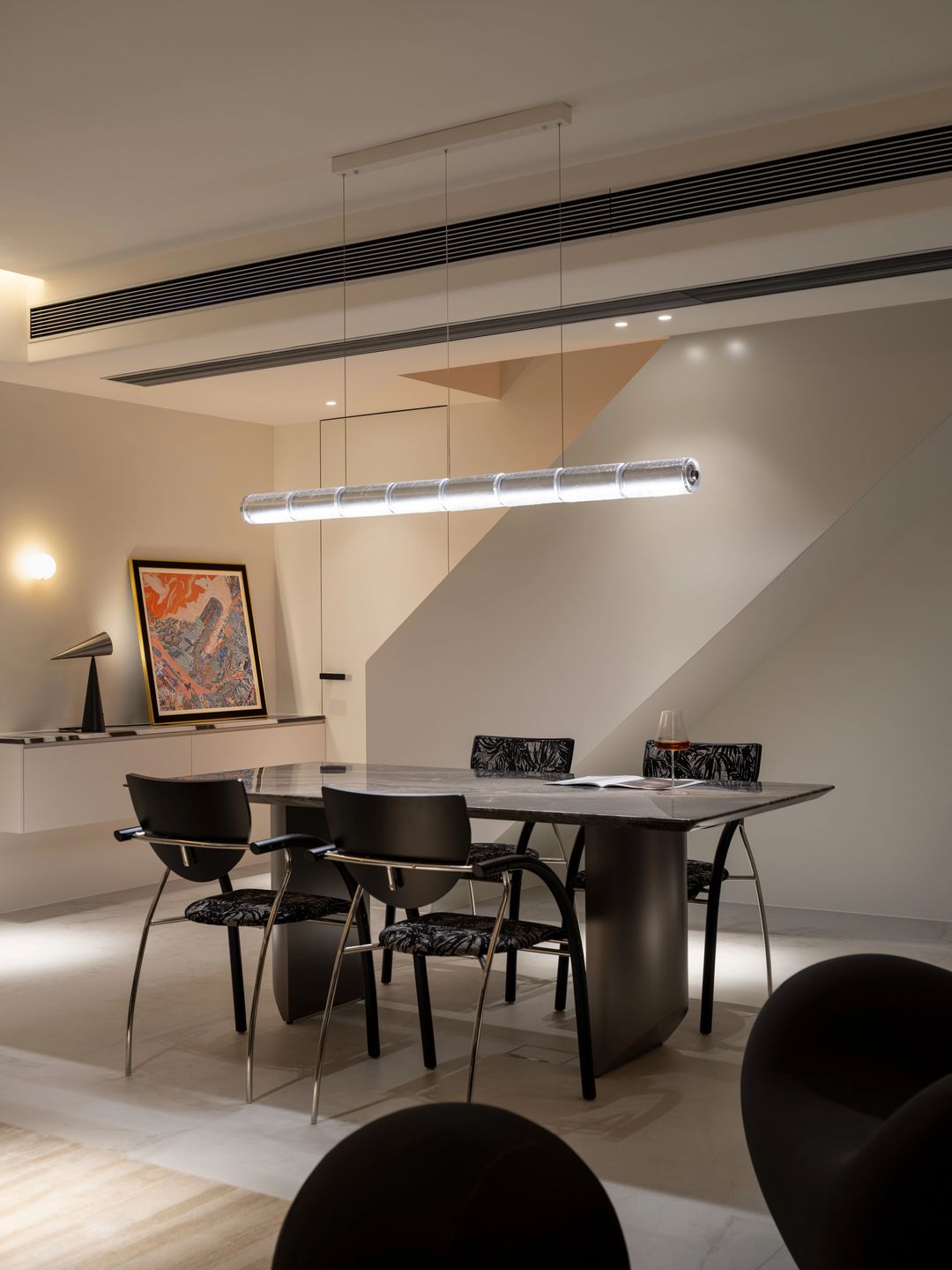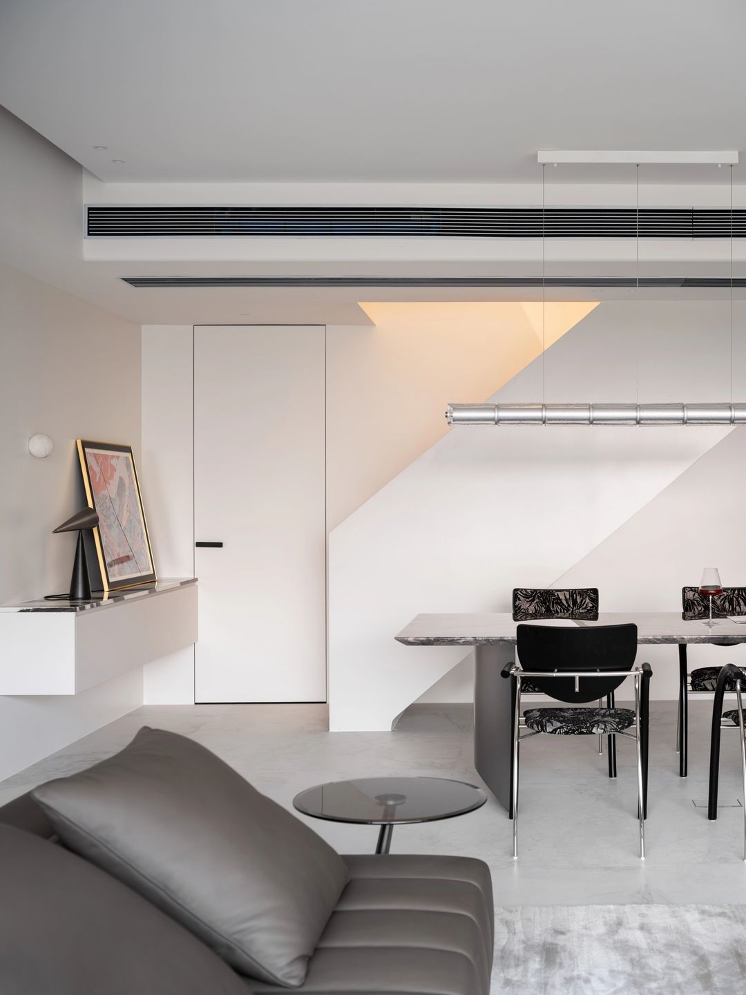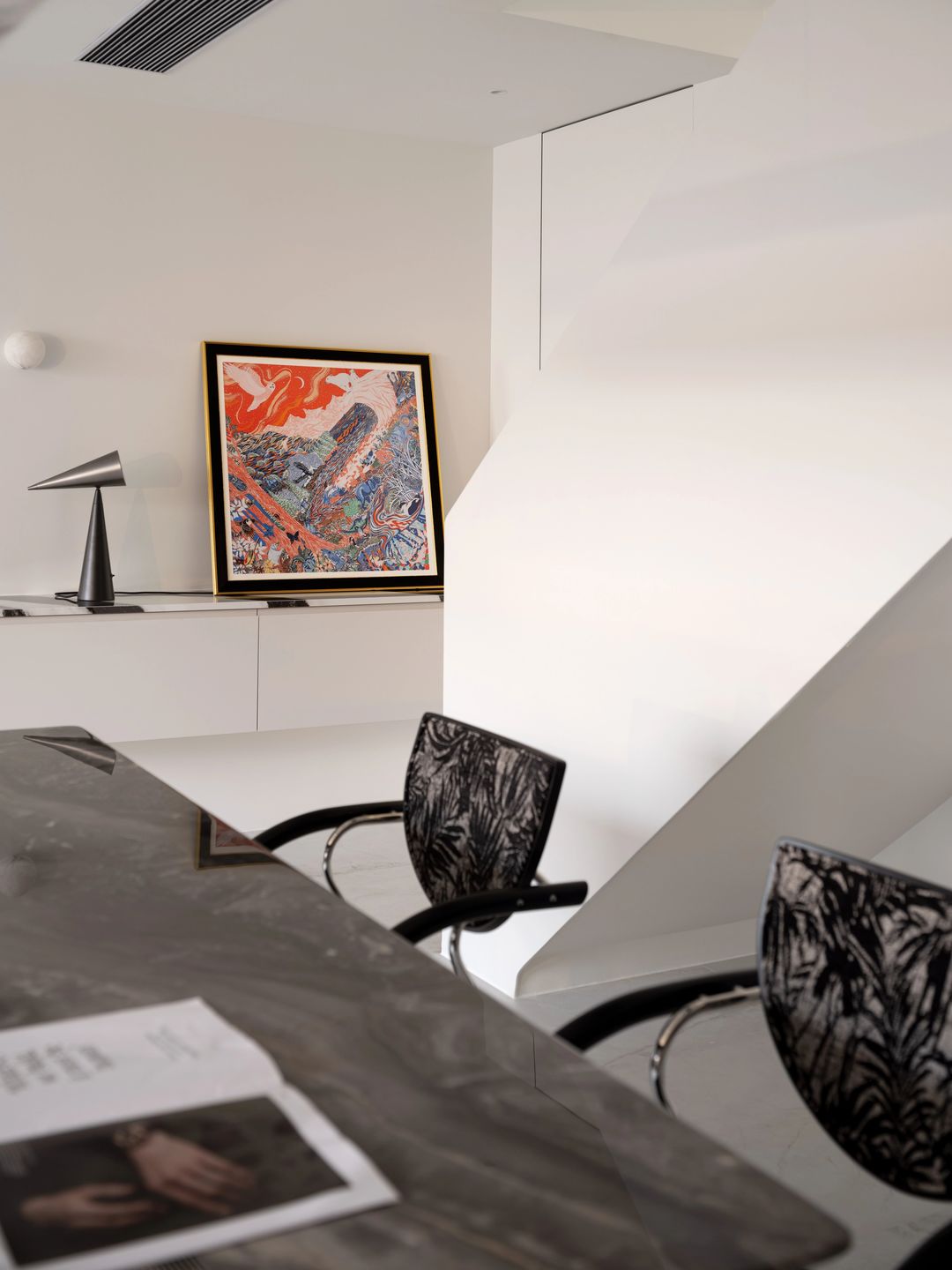 楼梯采用的是钢板设计,空间更加简洁。楼梯踏步的灯光设计都是感应的,使用起来更加人性化。