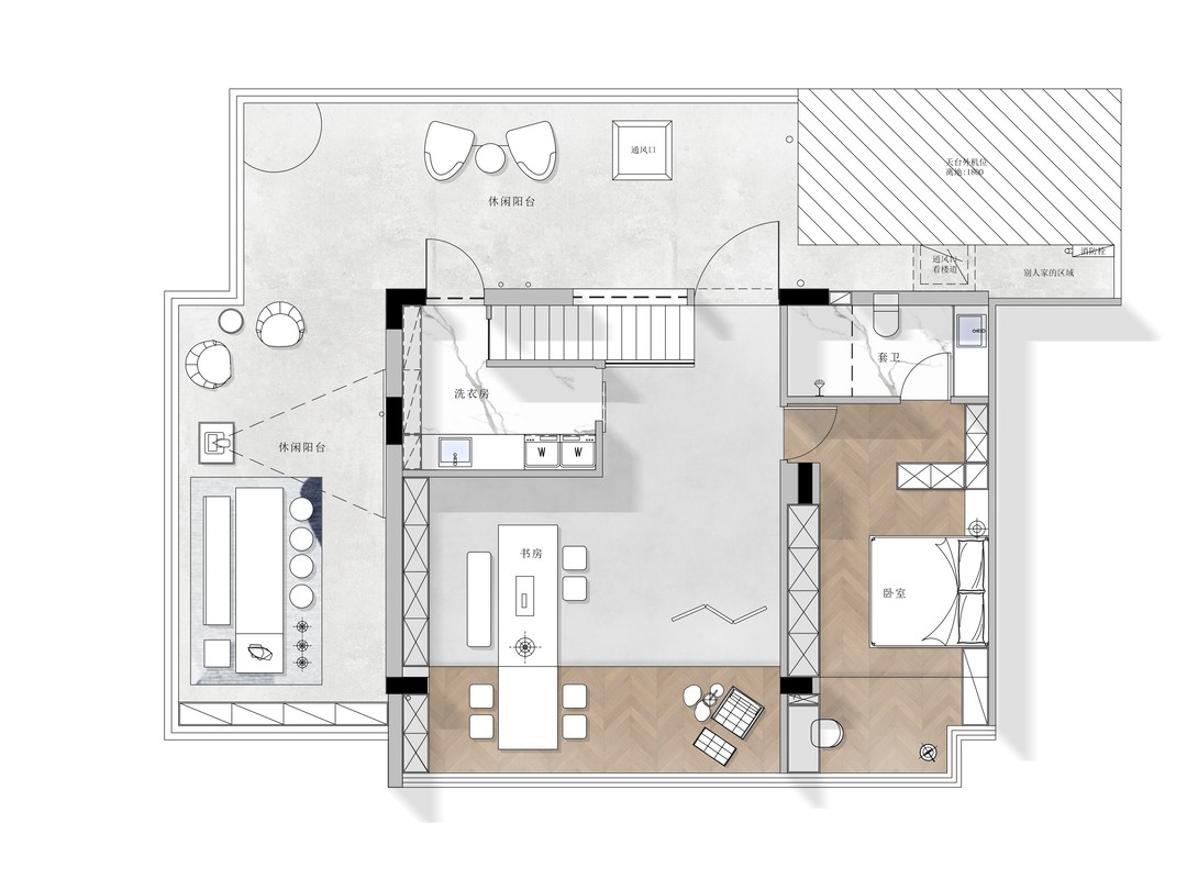 优化后平面图。拆除了之前所有的精装部分,按照业主的家庭结构和需求重塑了空间布局。一楼的北卧室和主卧打通做了套间,餐厅和厨房打通合并了一个操作更舒适的中西厨。二楼现浇区做了一个公共茶室,并且和露台之间隔出了一个家政间。