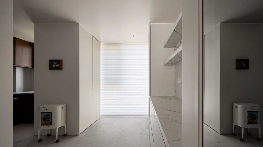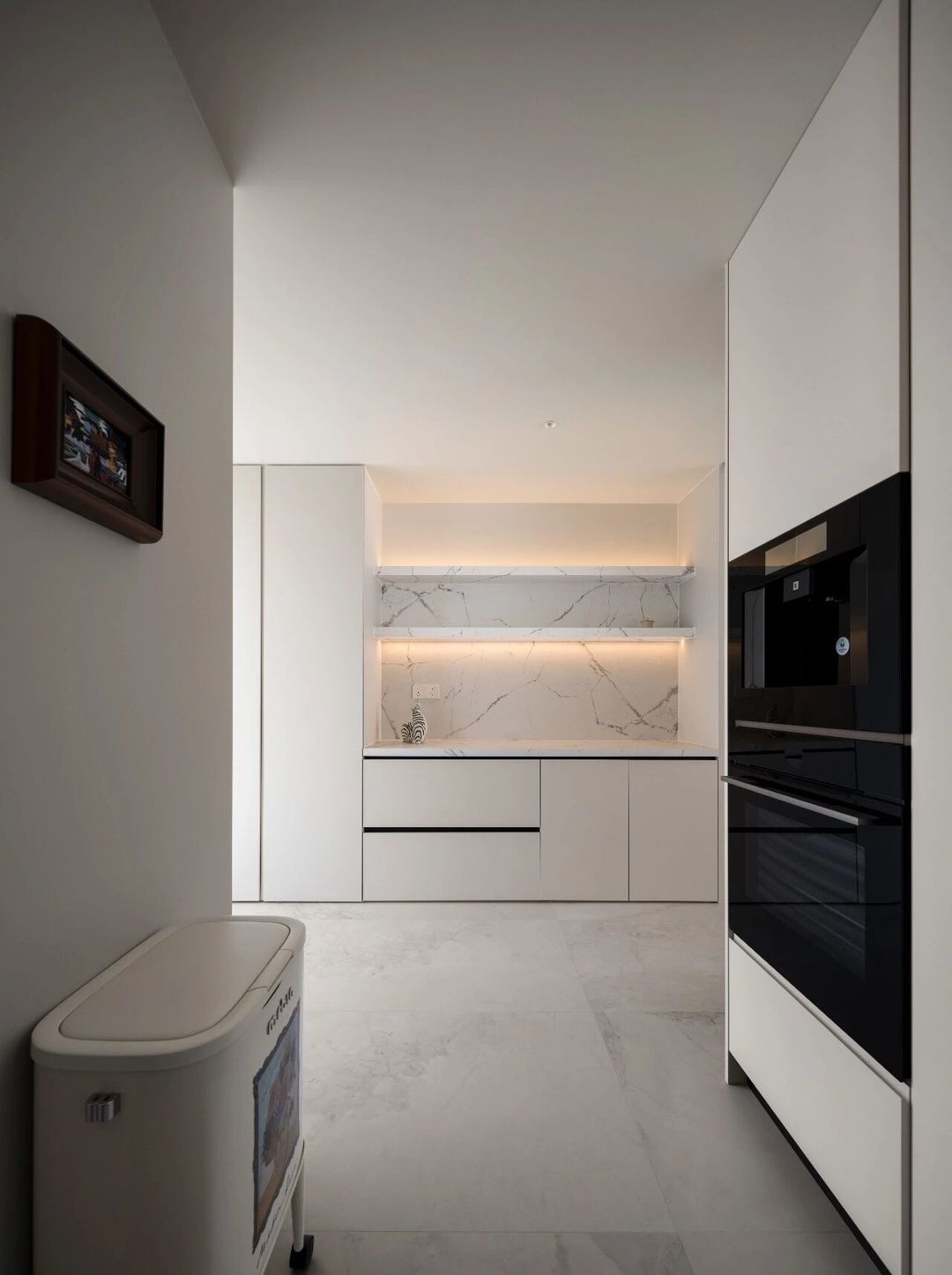 西厨采用的白色极简设计,台面岩板结合灯光设计,耐造高级。西厨补充收纳的同时,也可以当咖啡水吧台使用。