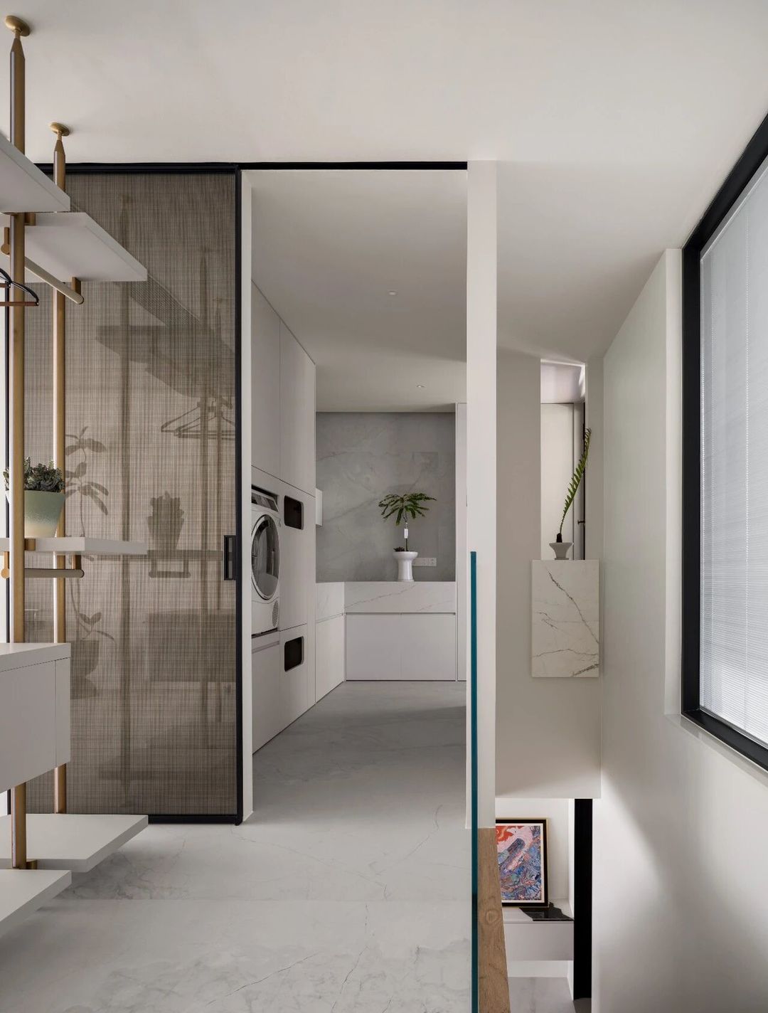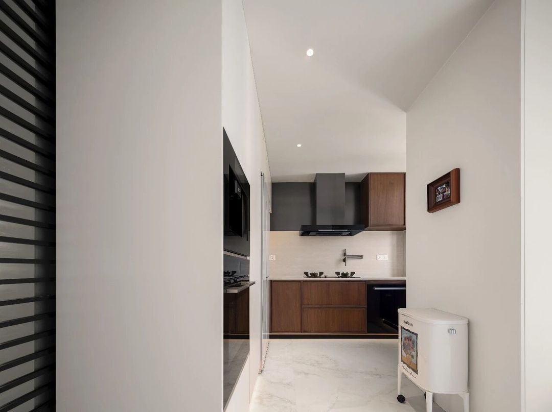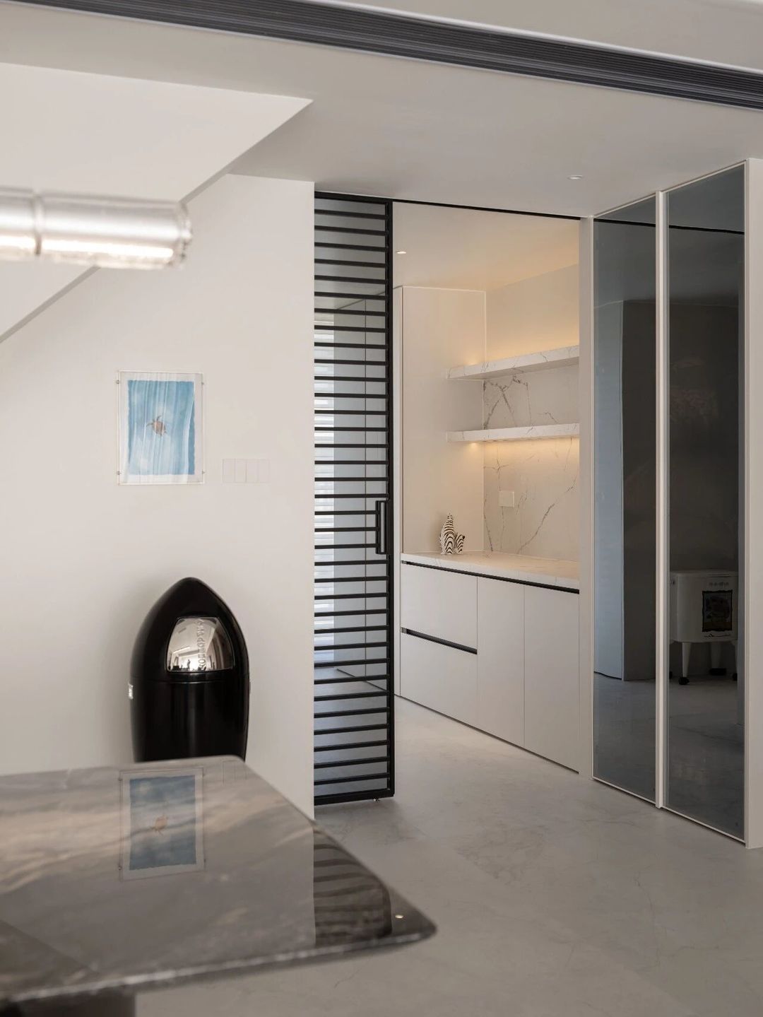 厨房的推拉门采用的是极简无门套的设计,在木工阶段,提前把轨道预埋进吊顶里面,这样做出来的推拉门会更加简洁高级。考虑到厨房有两扇大窗户,采光完全够,所以推拉门选择的不是完全透明的,这样一来即使厨房里面有点乱,关起来也不会影响美观,二来整个空间层次也会更丰富。