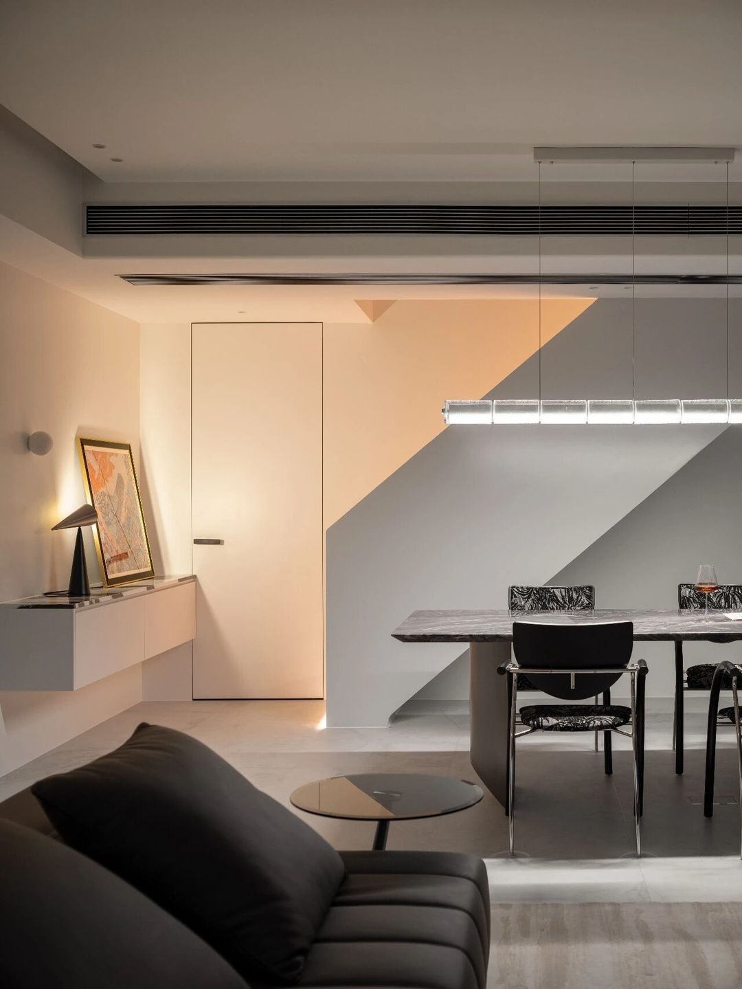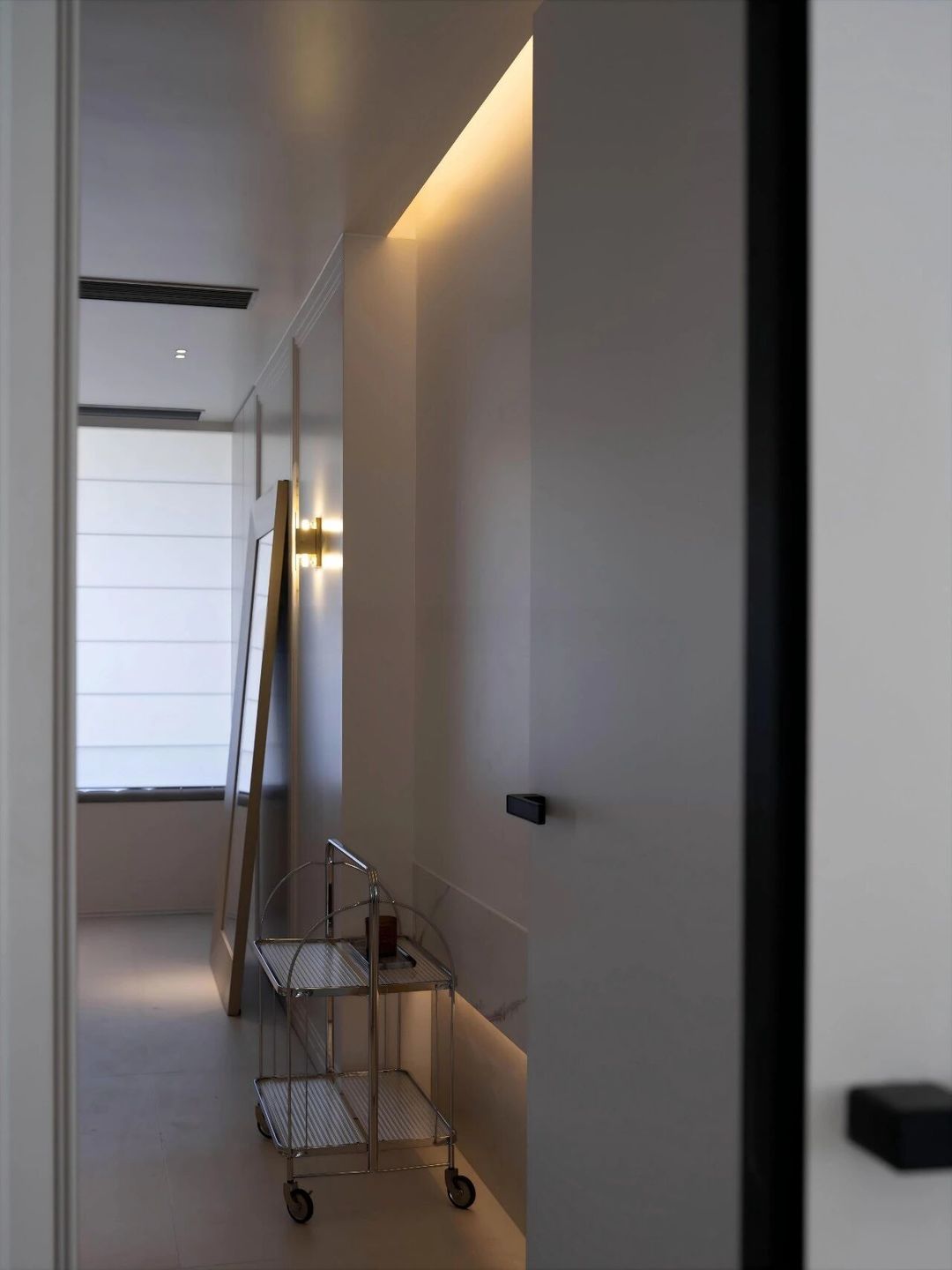 入户玄关的灯光设计,没有做普通的射灯,而是灯光软膜的形式,这样照射出来的灯光更加柔和高级,会让晚归的家人,进家门的那一刻更加舒适和有仪式感。