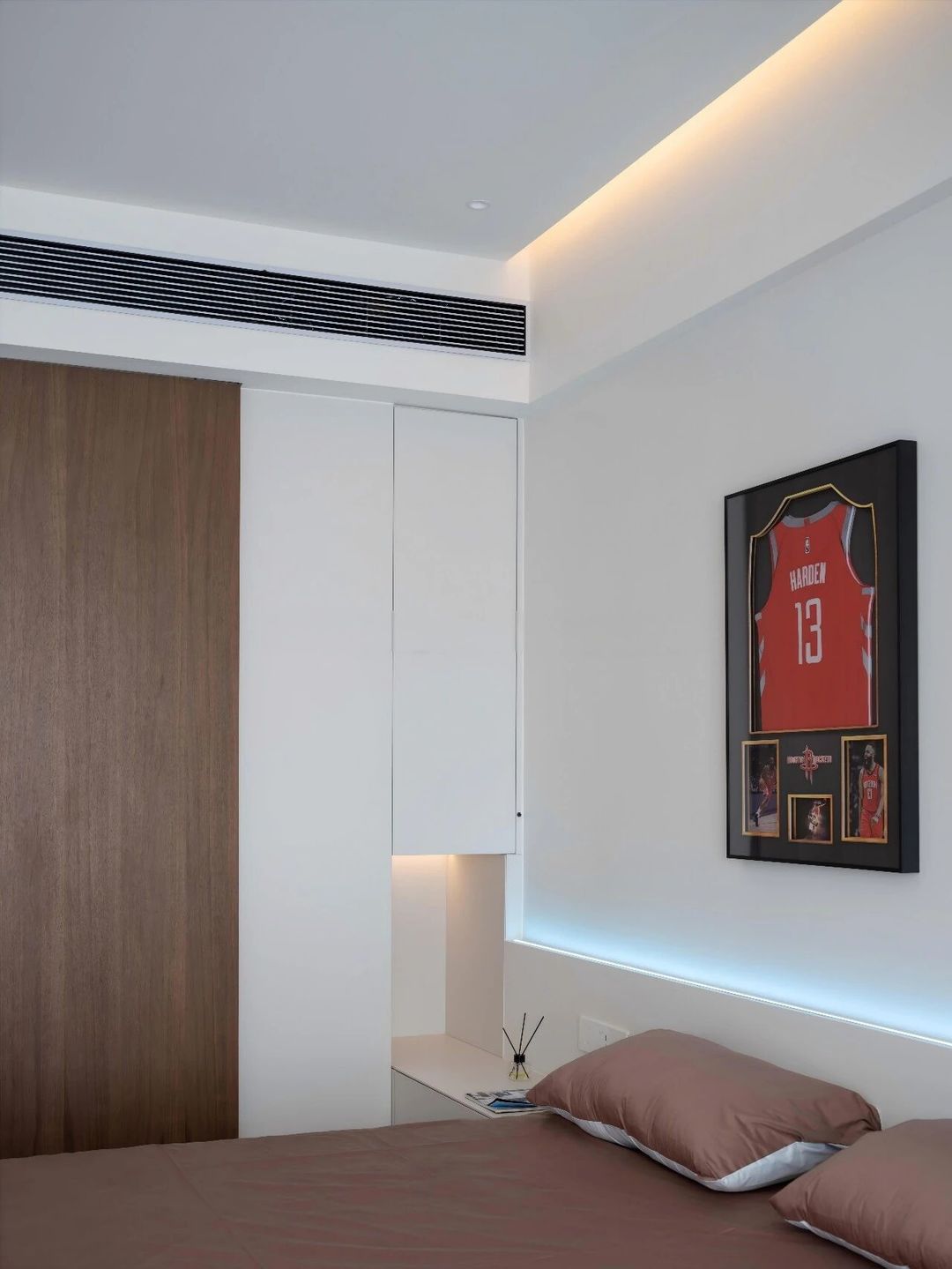 电视背景墙结合隐形门和收纳设计,隐形门进去就是女儿房的空间。收纳采用悬空设计,方便打理卫生的同时,空间也不会显得闭塞。在柜门的造型和花色上花心思,比如柜门突起结合灯光设计,让空间显得更有层次,比如悬空柜花色穿插,显得空间更有层次感。