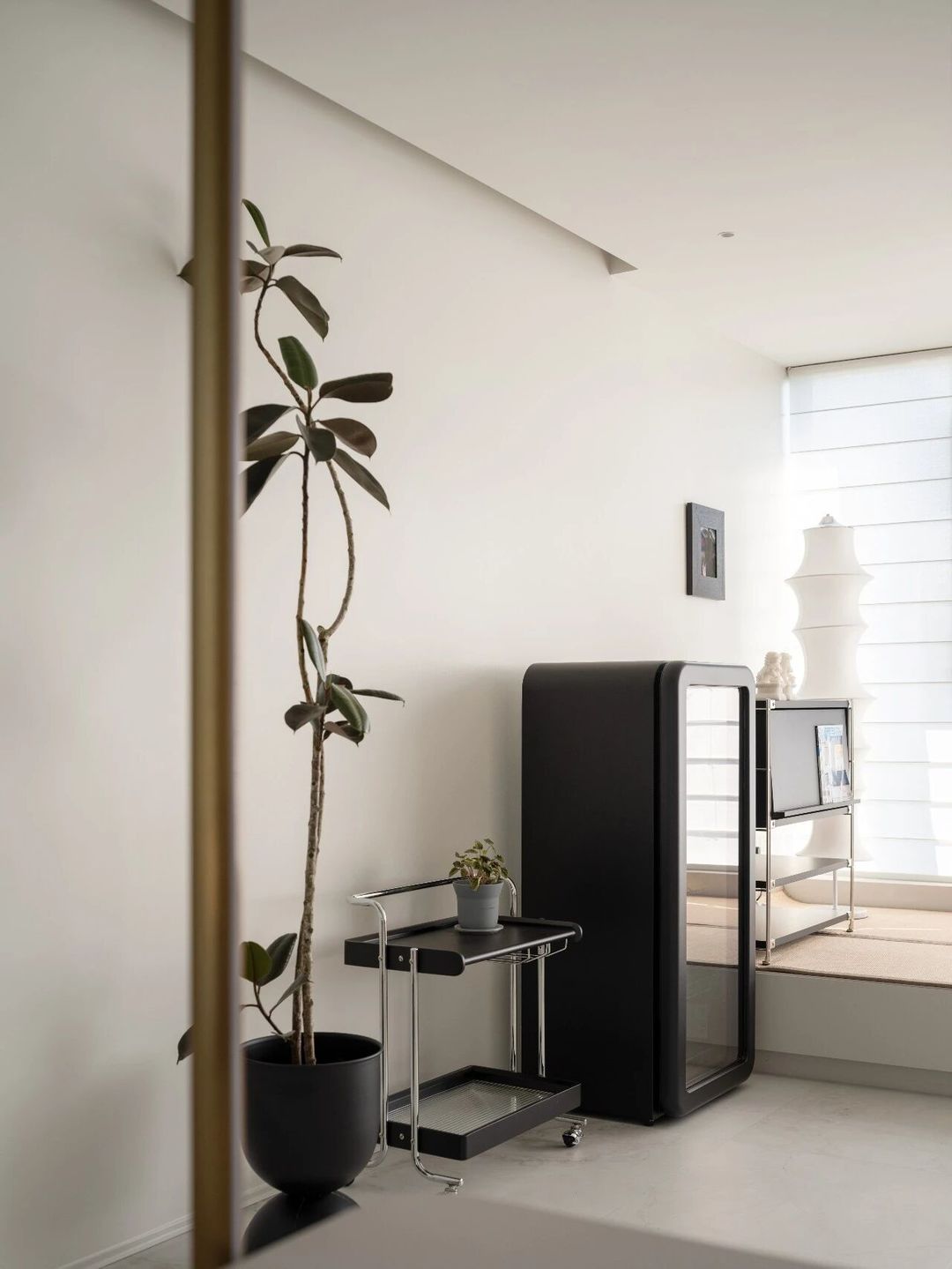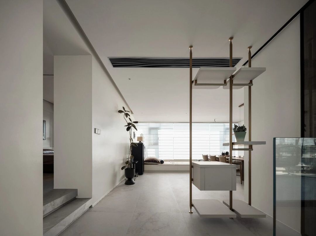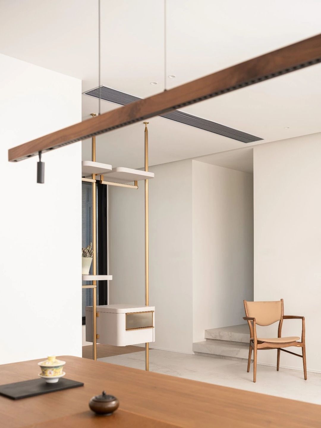 茶室的入户区设计了次净衣架,方便客人的衣服包包摆放。
